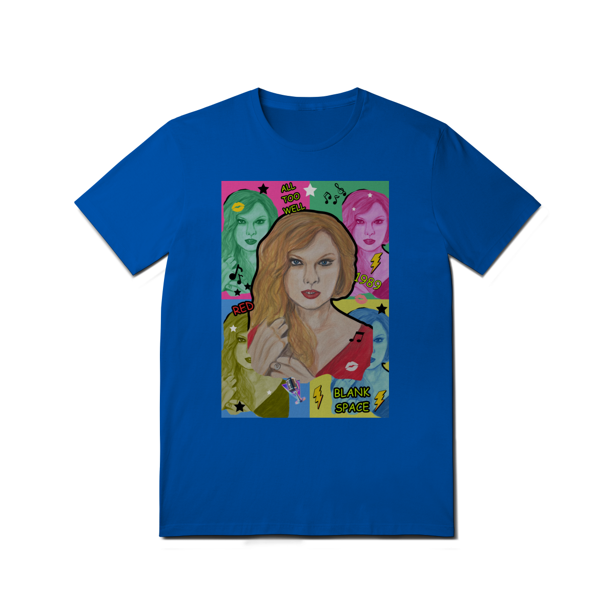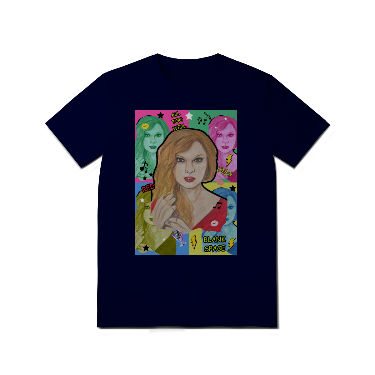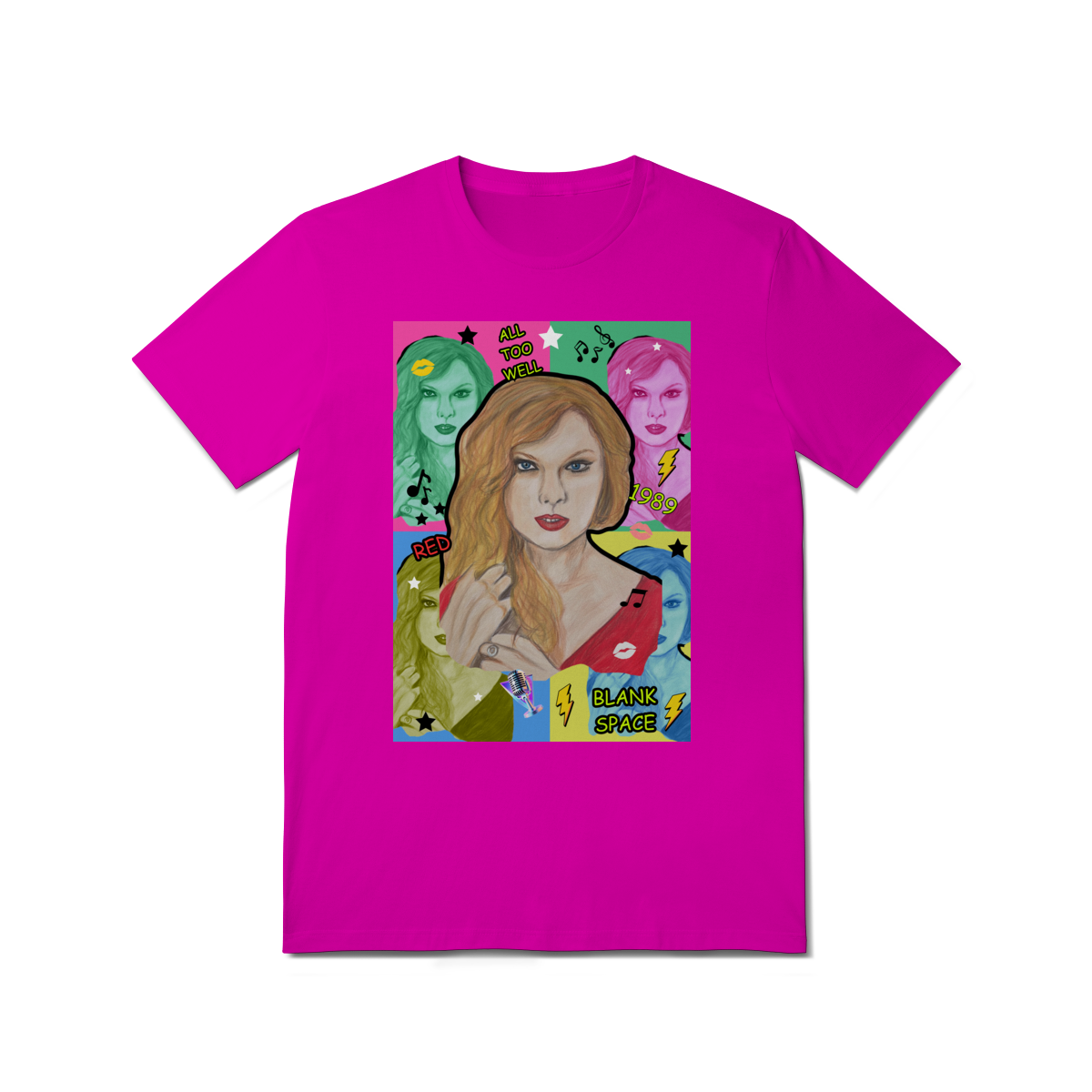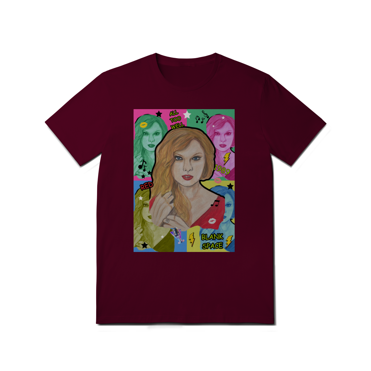 A T-Shirt Quality Swift Pop Collage traz uma arte exclusiva em estilo pop art, celebrando diferentes eras e sucessos de Taylor Swift. O retrato principal, feito à mão, é combinado com versões coloridas da cantora, ícones musicais e referências a faixas como All Too Well, Red, 1989 e Blank Space.
