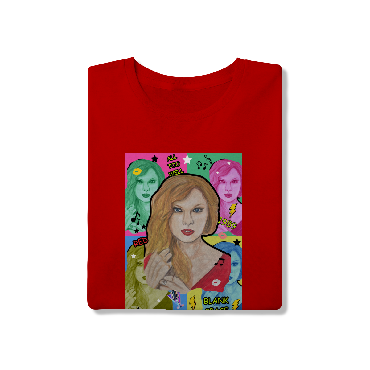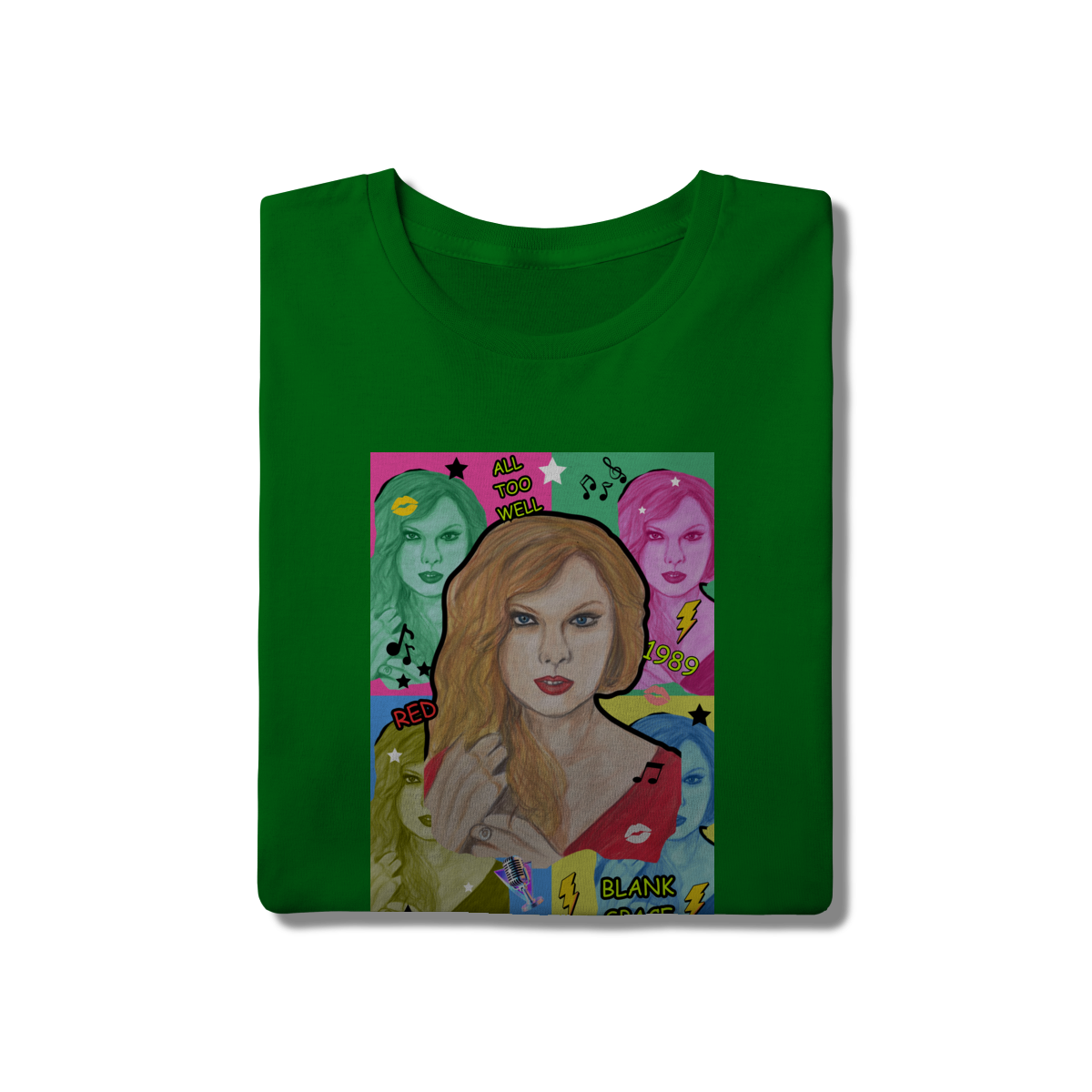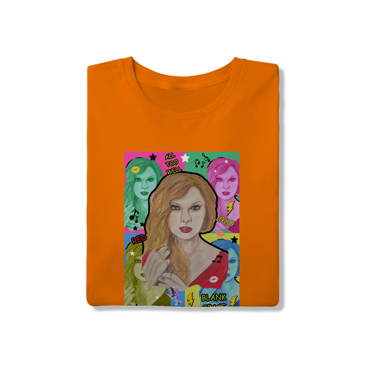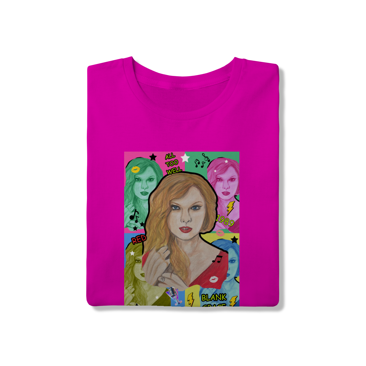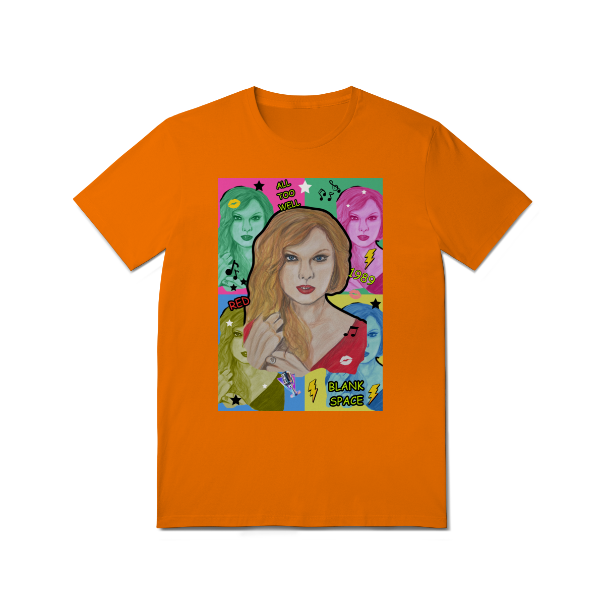 A T-Shirt Quality Swift Pop Collage traz uma arte exclusiva em estilo pop art, celebrando diferentes eras e sucessos de Taylor Swift. O retrato principal, feito à mão, é combinado com versões coloridas da cantora, ícones musicais e referências a faixas como All Too Well, Red, 1989 e Blank Space.