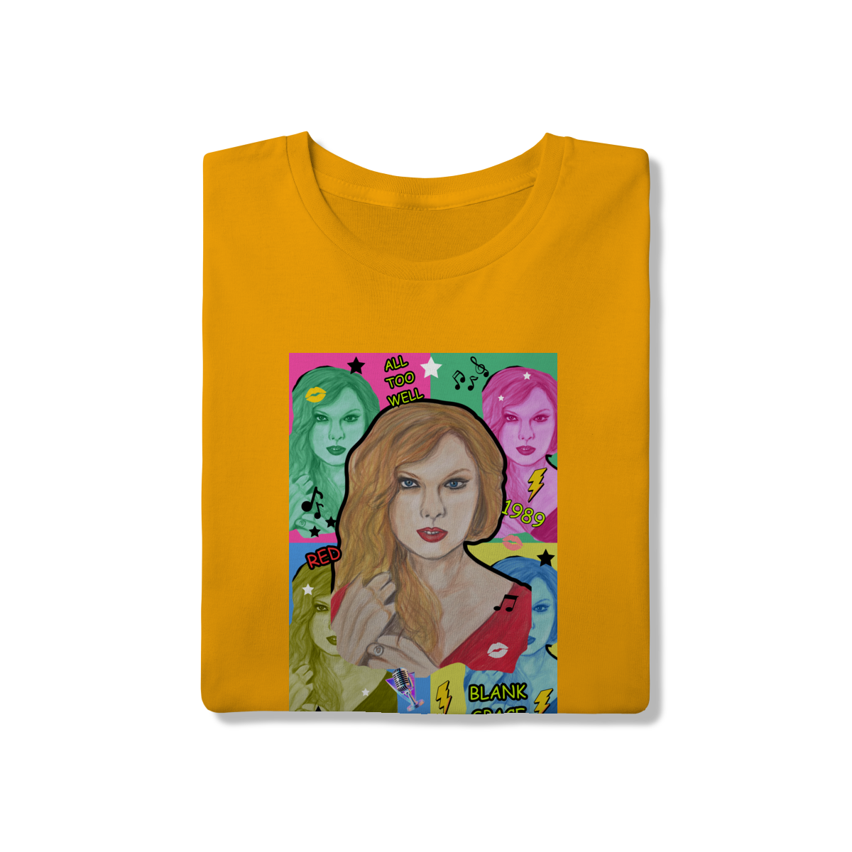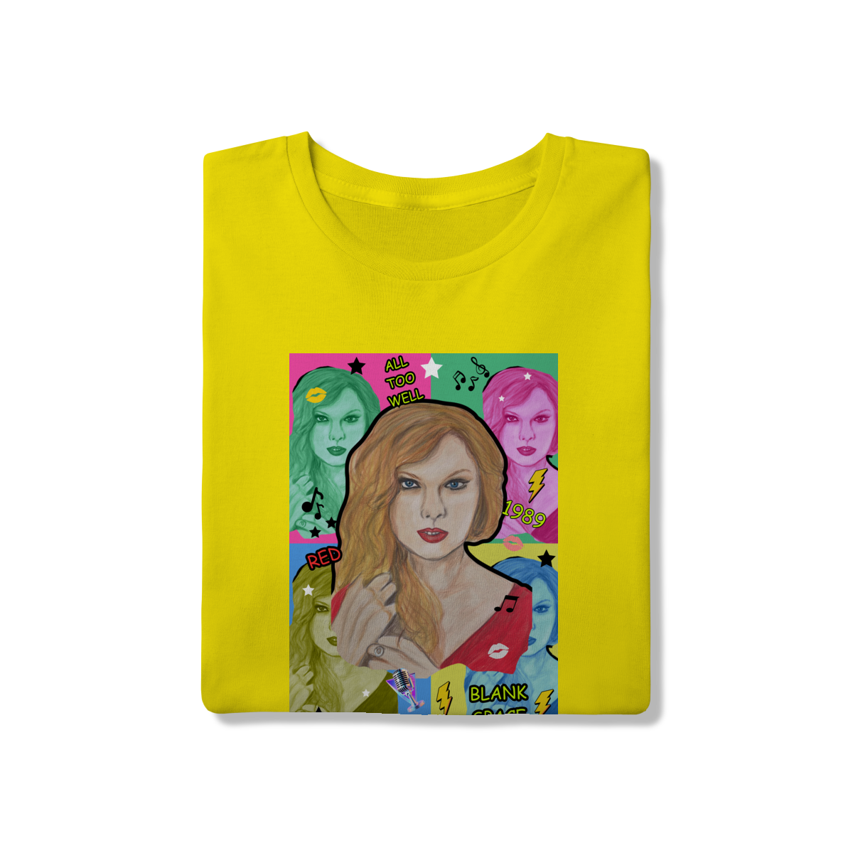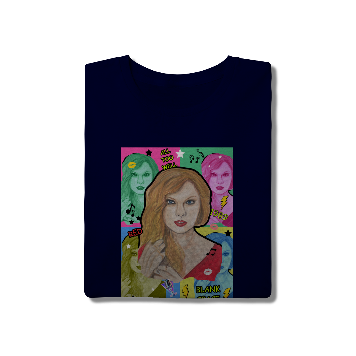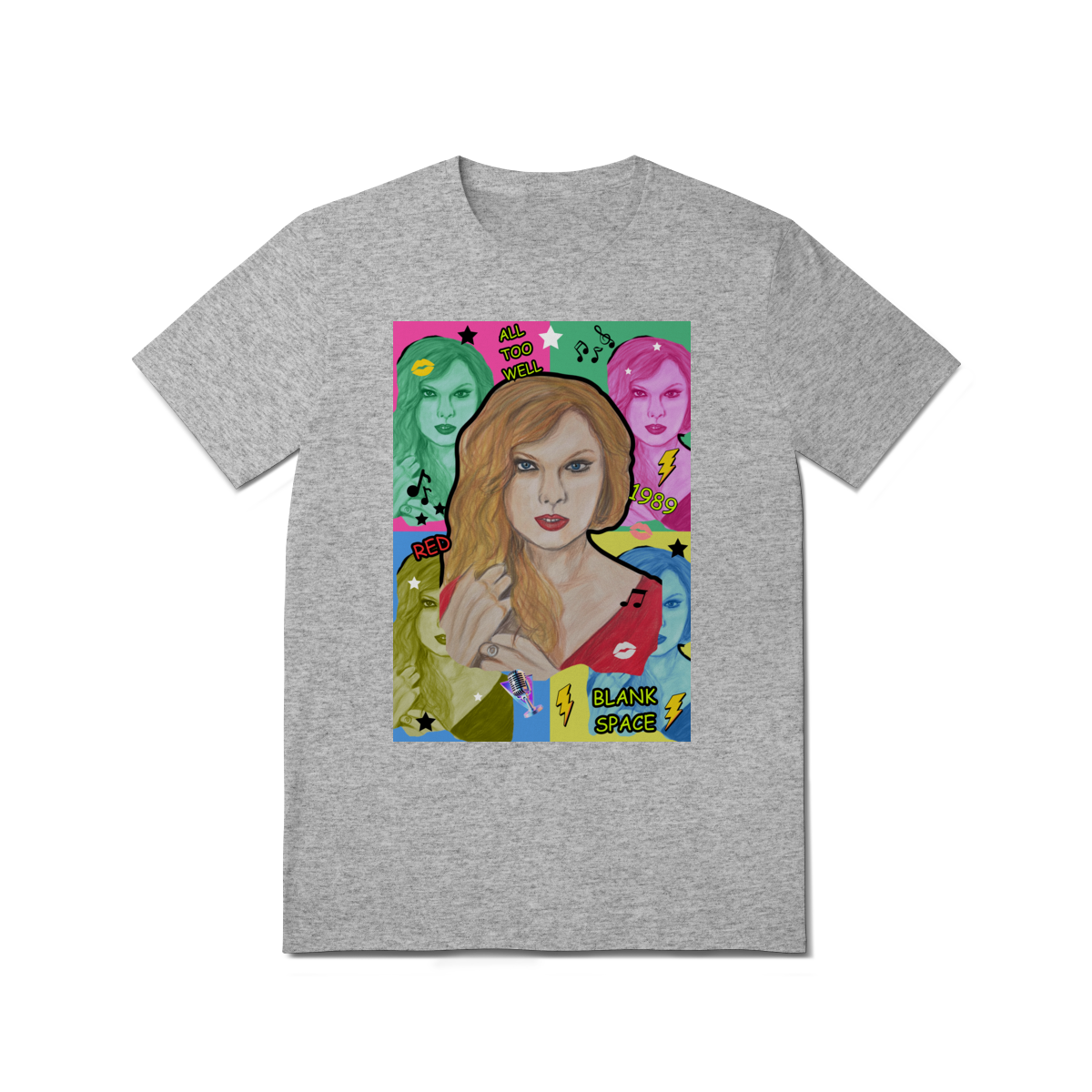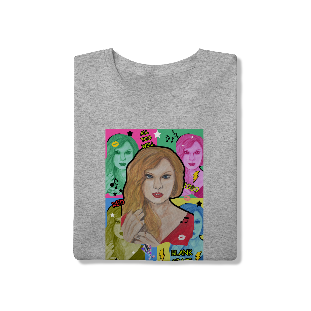 A T-Shirt Quality Swift Pop Collage traz uma arte exclusiva em estilo pop art, celebrando diferentes eras e sucessos de Taylor Swift. O retrato principal, feito à mão, é combinado com versões coloridas da cantora, ícones musicais e referências a faixas como All Too Well, Red, 1989 e Blank Space.