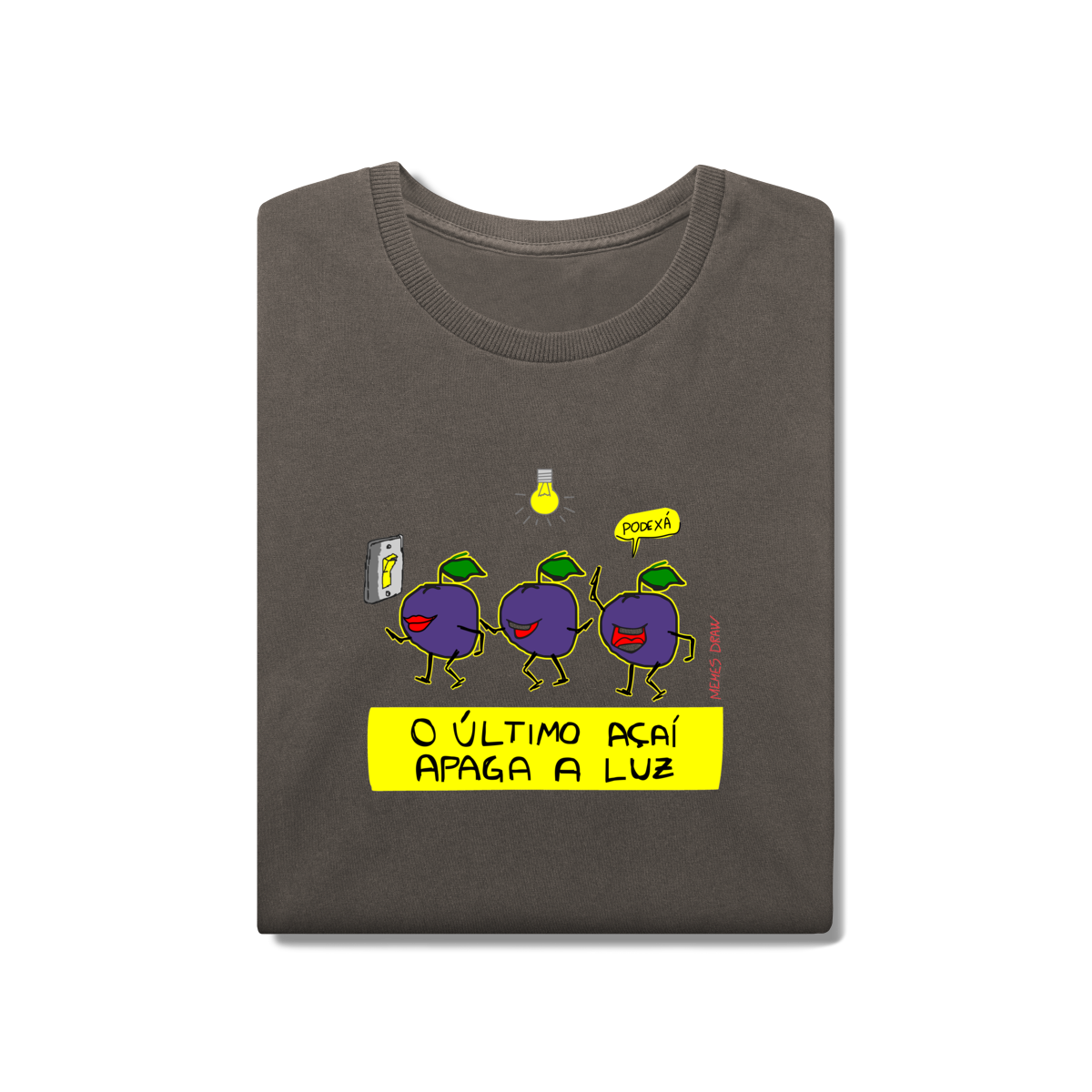 A camiseta de meme “O ÚLTIMO AÇAÍ APAGA A LUZ” traz uma cena visual criativa: vários açaís indo embora e o último apagando a luz, transformando uma frase popular em um meme autoral, brasileiro, engraçado e imediatamente identificável.