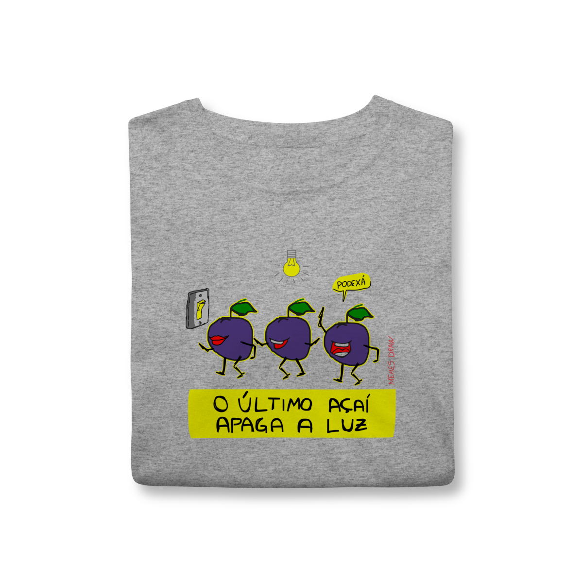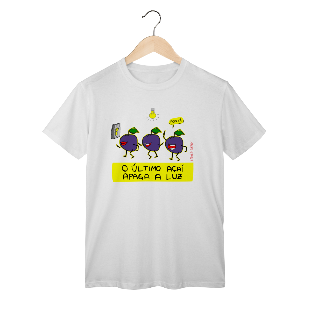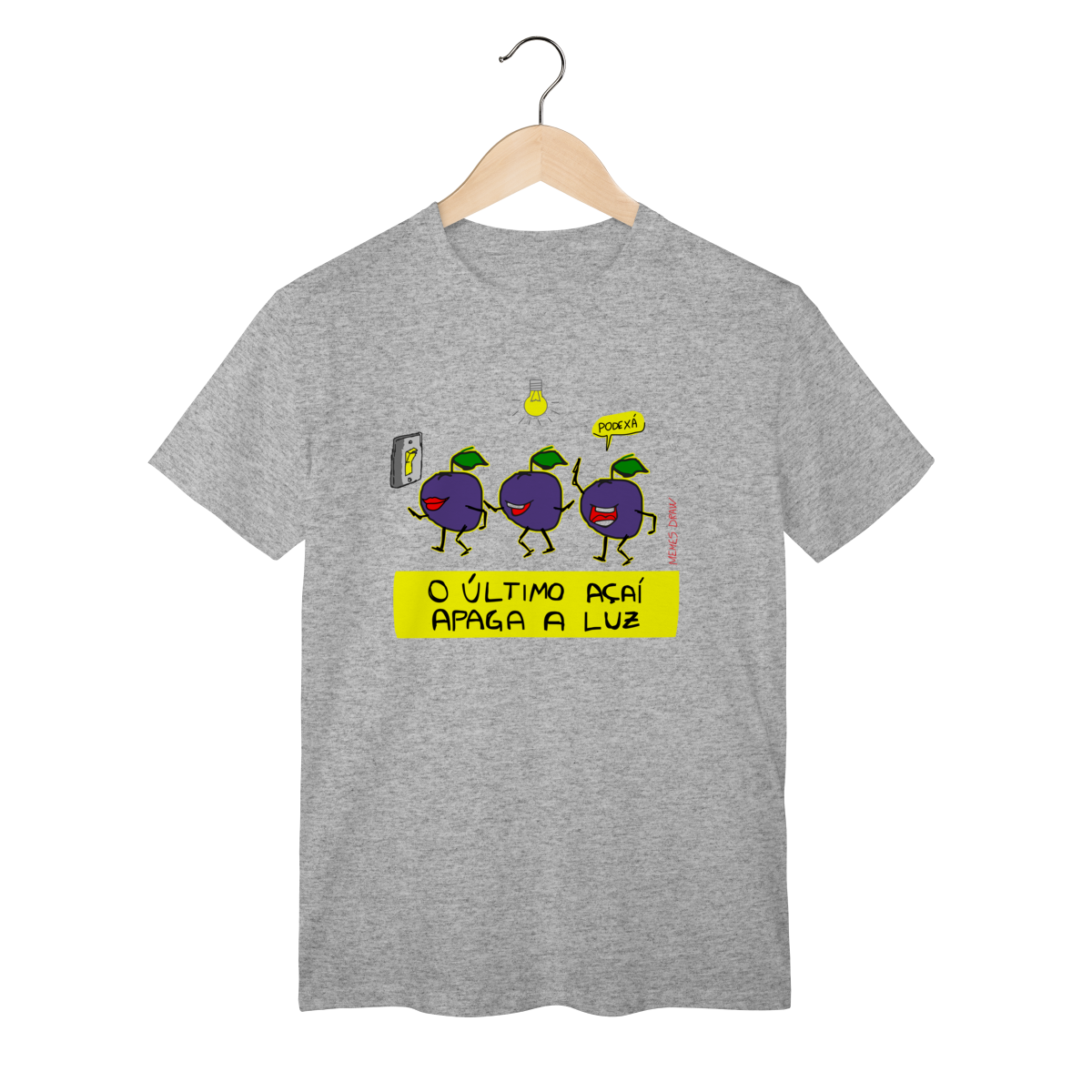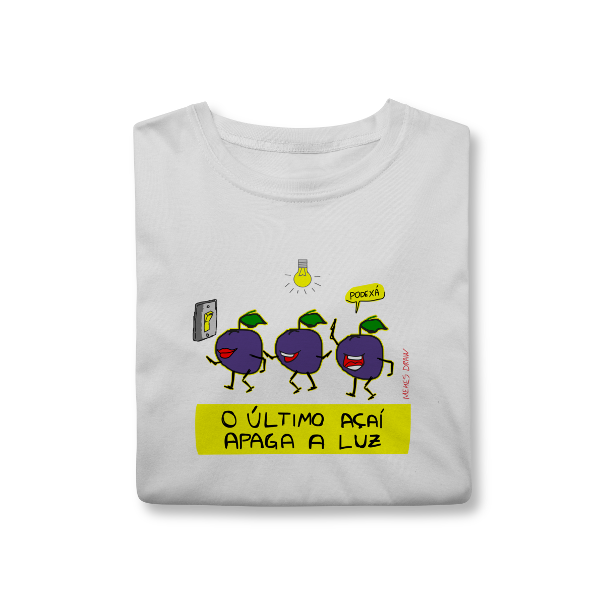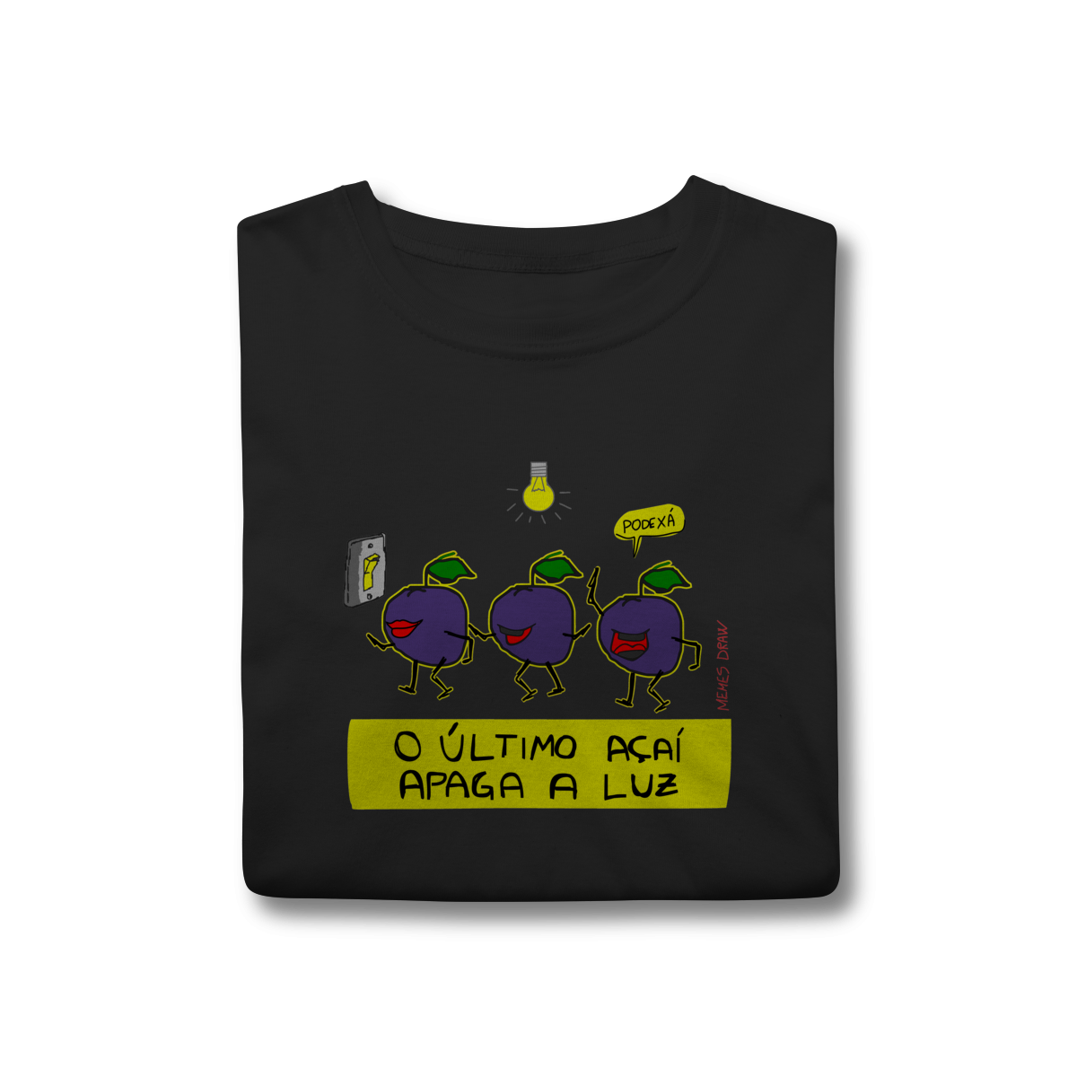 A camiseta de meme “O ÚLTIMO AÇAÍ APAGA A LUZ” traz uma cena visual criativa: vários açaís indo embora e o último apagando a luz, transformando uma frase popular em um meme autoral, brasileiro, engraçado e imediatamente identificável.