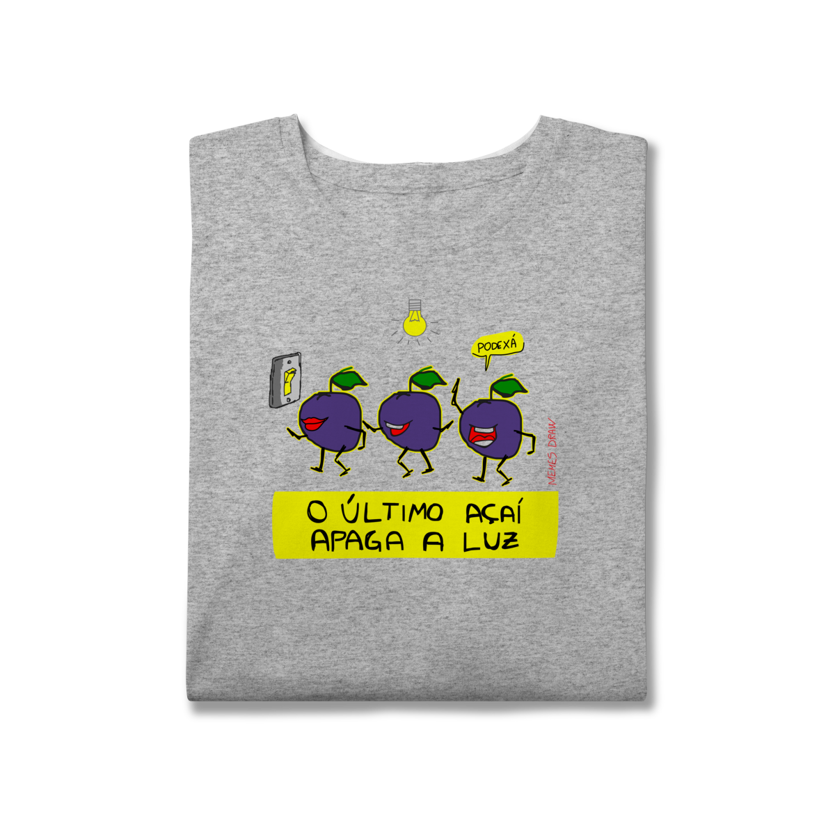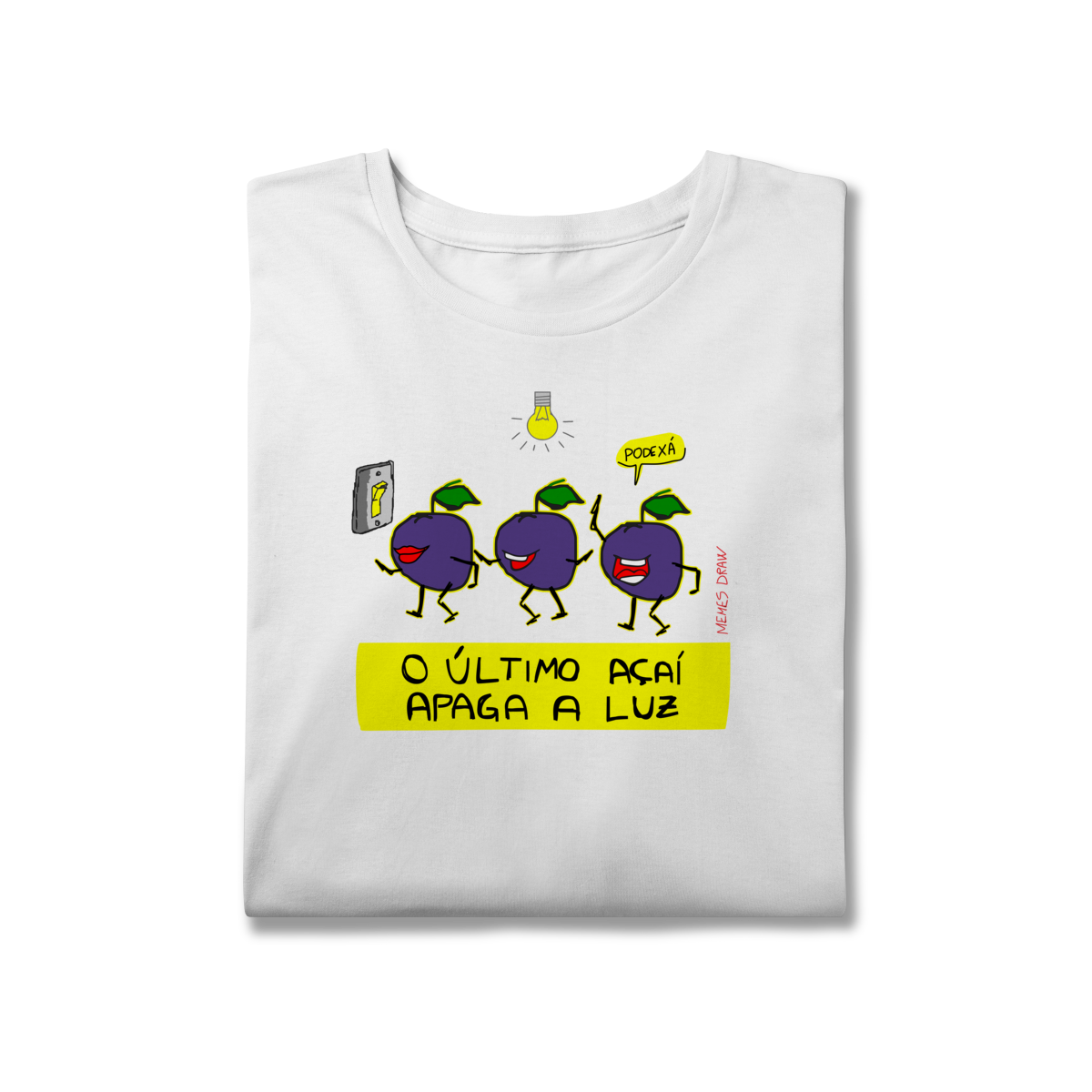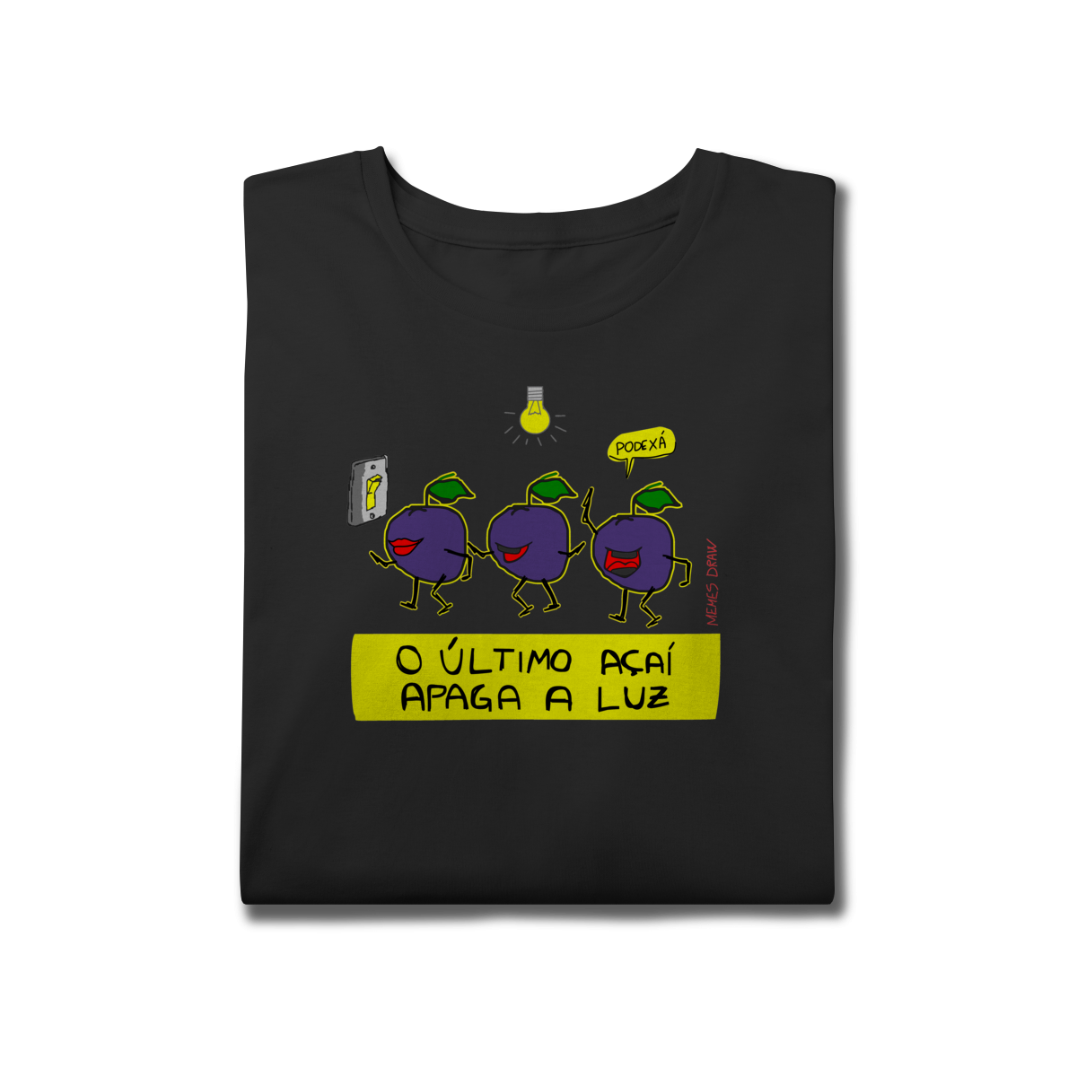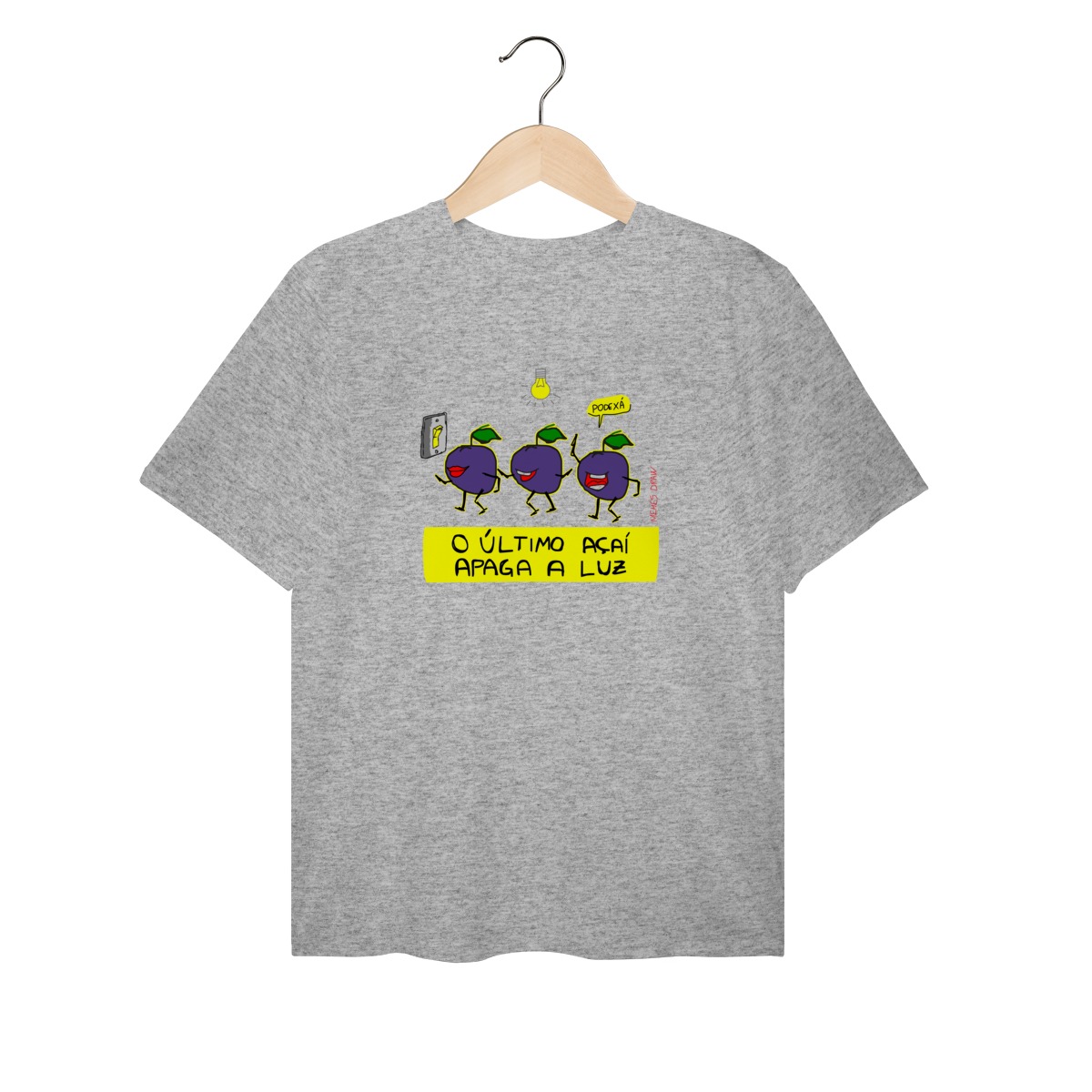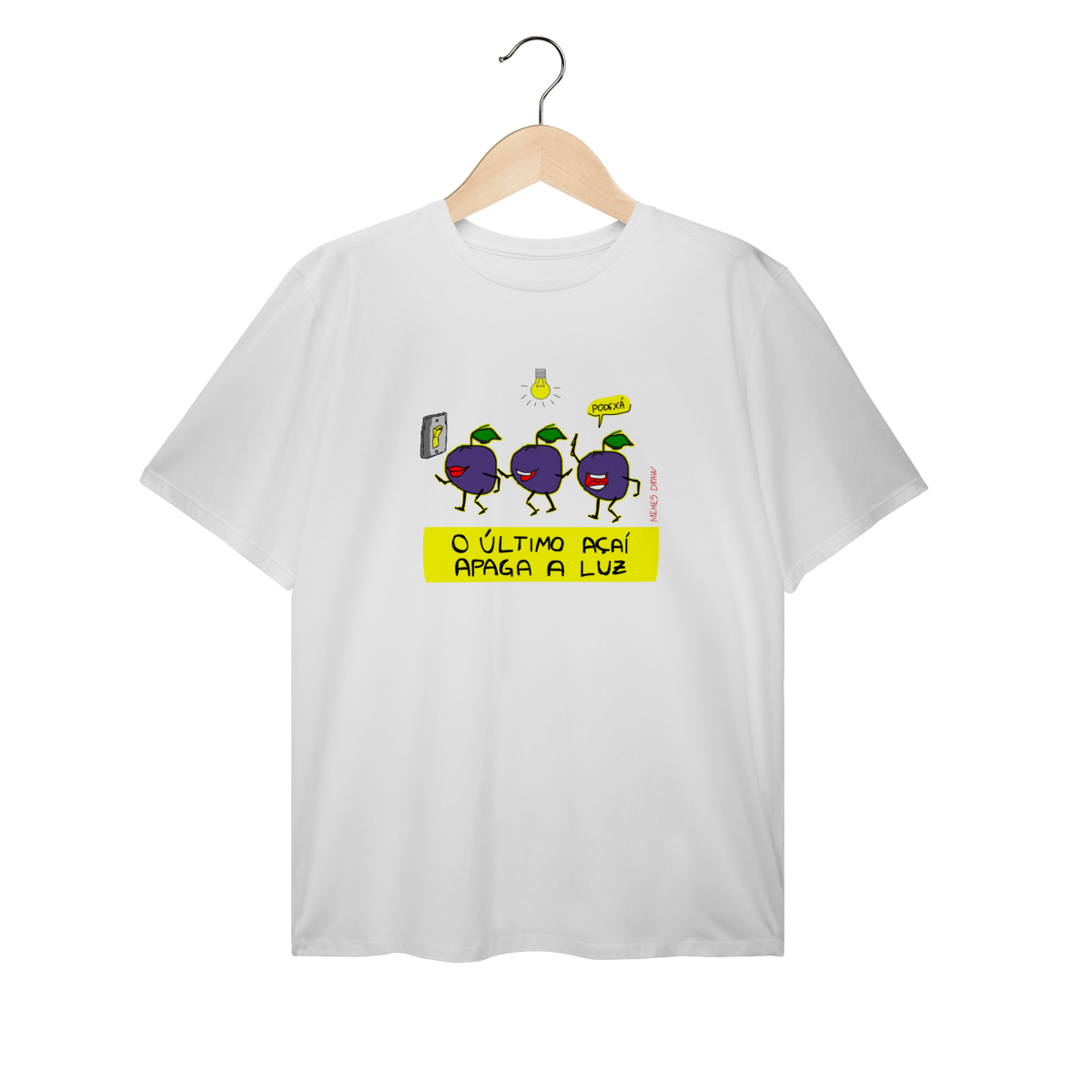 A camiseta de meme “O ÚLTIMO AÇAÍ APAGA A LUZ” traz uma cena visual criativa: vários açaís indo embora e o último apagando a luz, transformando uma frase popular em um meme autoral, brasileiro, engraçado e imediatamente identificável.