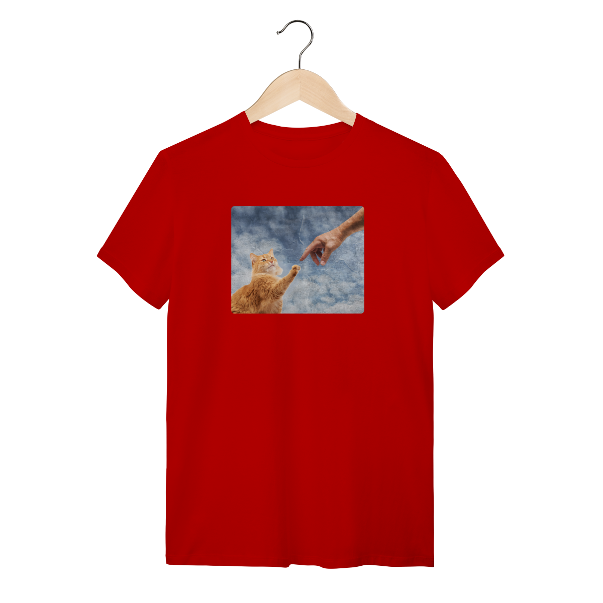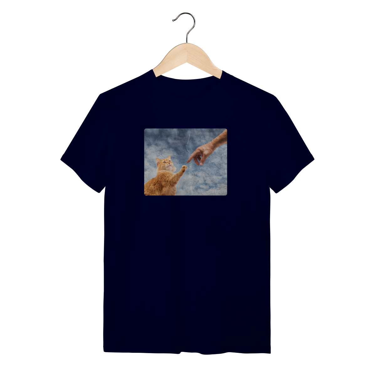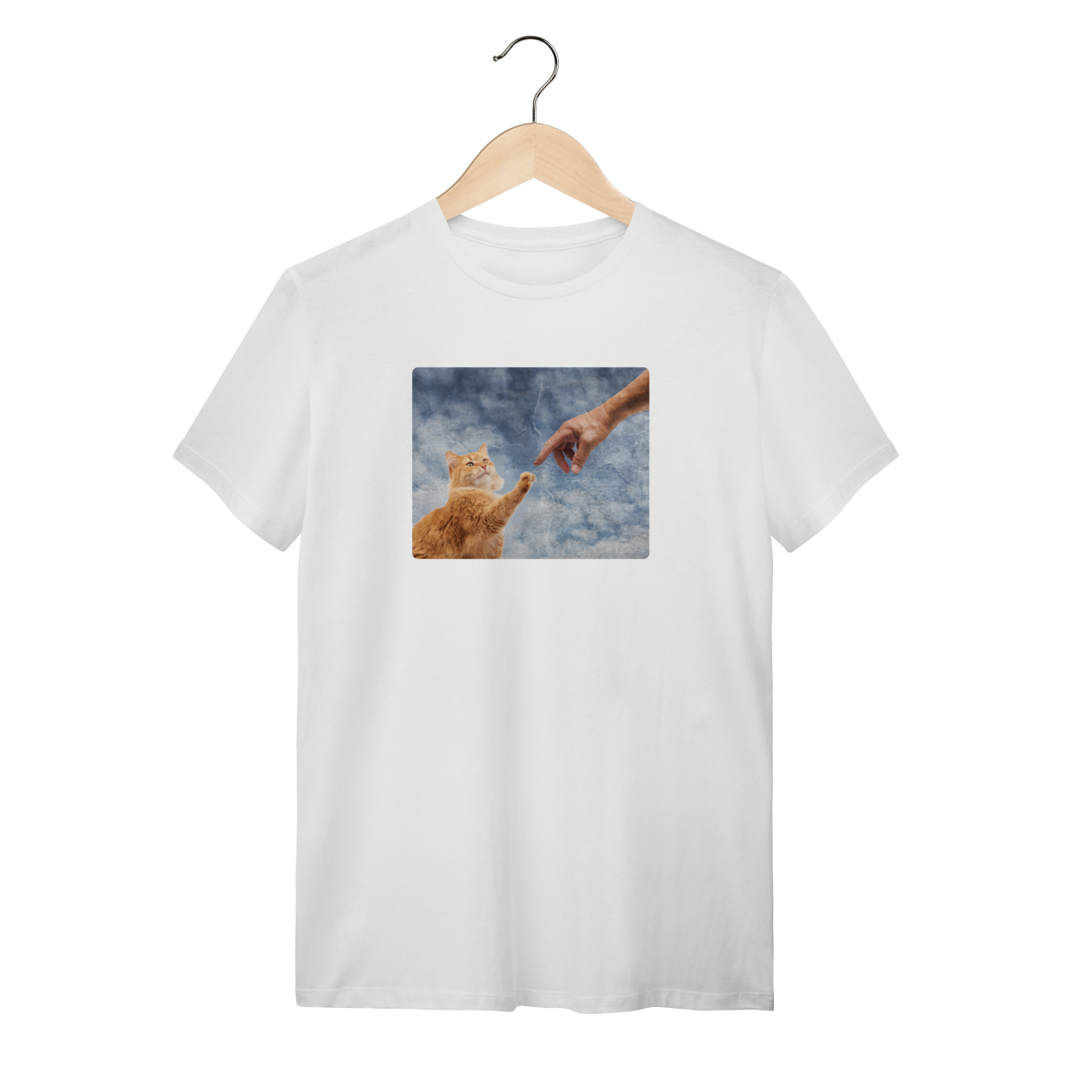 Esta Camisa é uma homenagem divertida à obra-prima de Michelangelo, recriada como "A Criação do Miau". Nela, o Criador estende a mão para tocar a pata do primeiro gato, dando-lhe a vida e o propósito (que é nos ignorar e depois nos amar, na hora que ele quiser!).