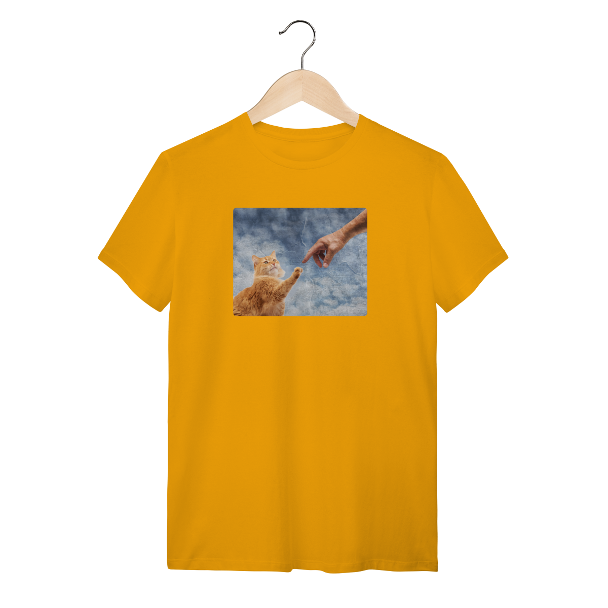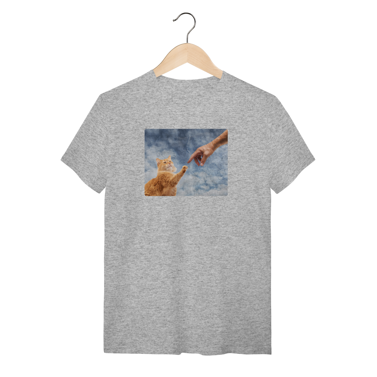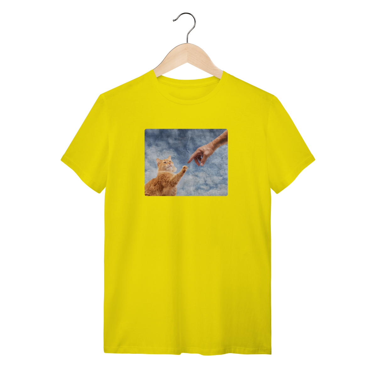 Esta Camisa é uma homenagem divertida à obra-prima de Michelangelo, recriada como "A Criação do Miau". Nela, o Criador estende a mão para tocar a pata do primeiro gato, dando-lhe a vida e o propósito (que é nos ignorar e depois nos amar, na hora que ele quiser!).