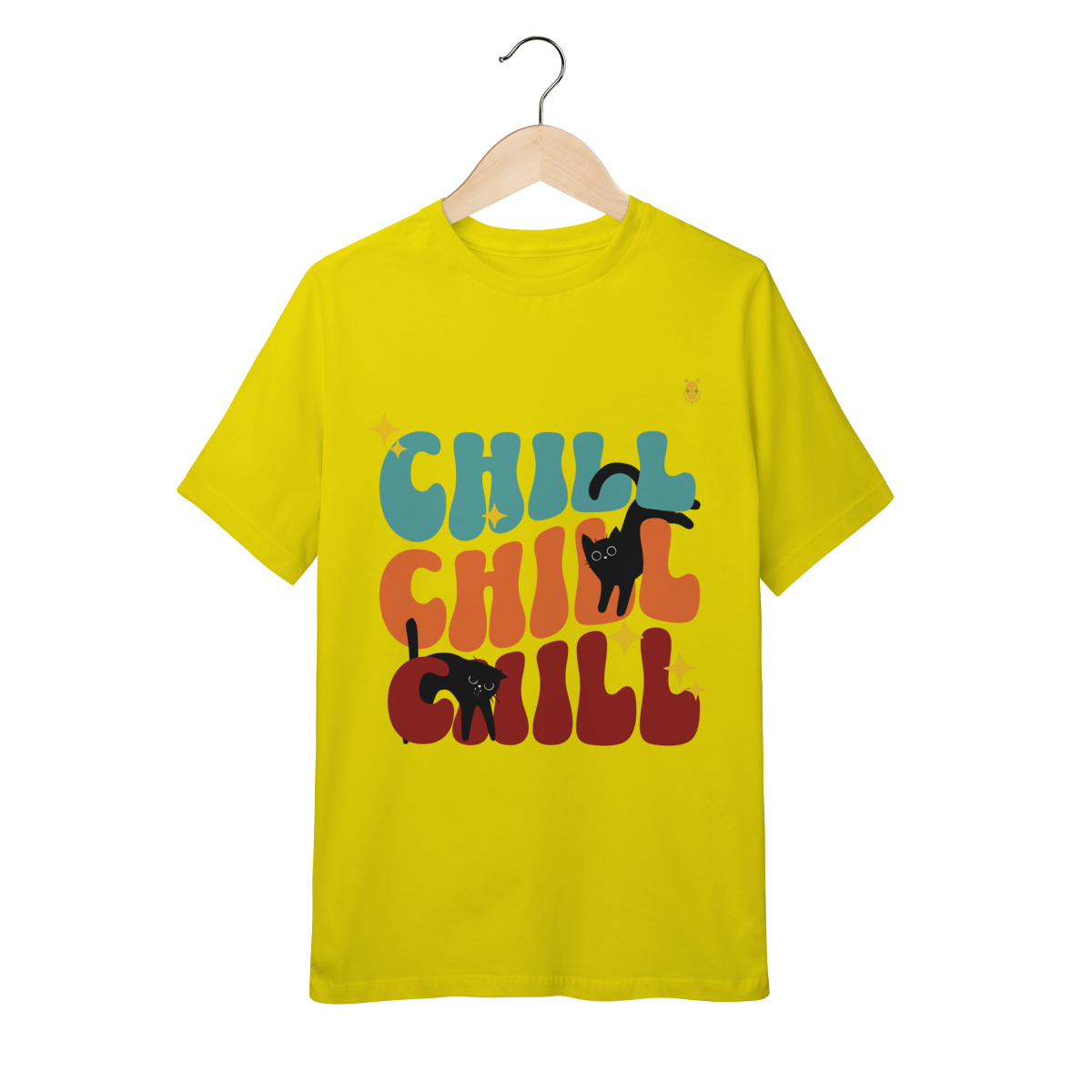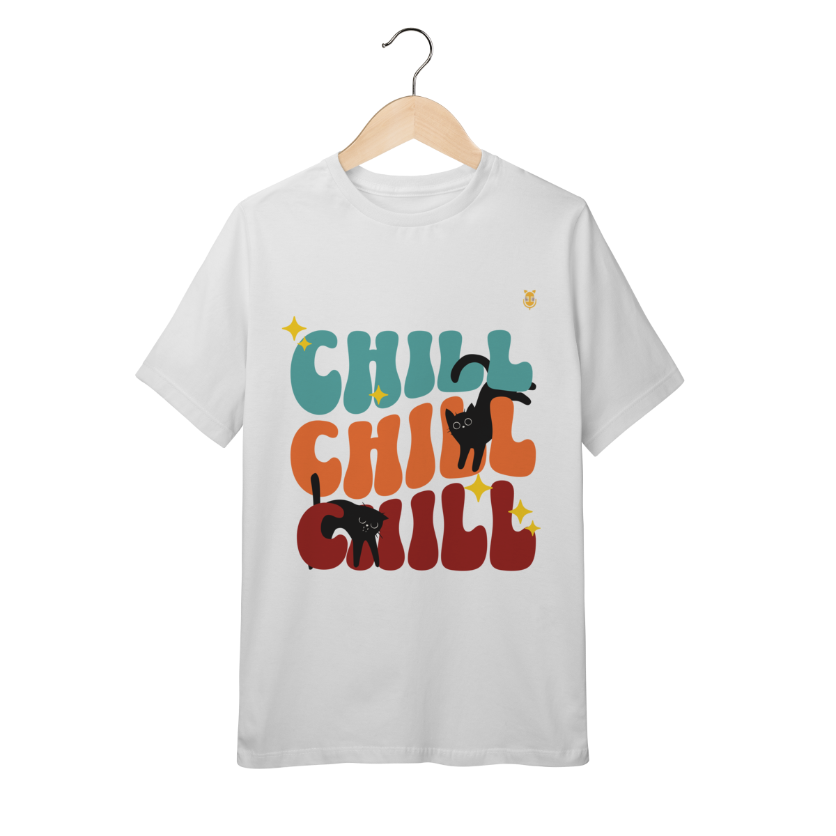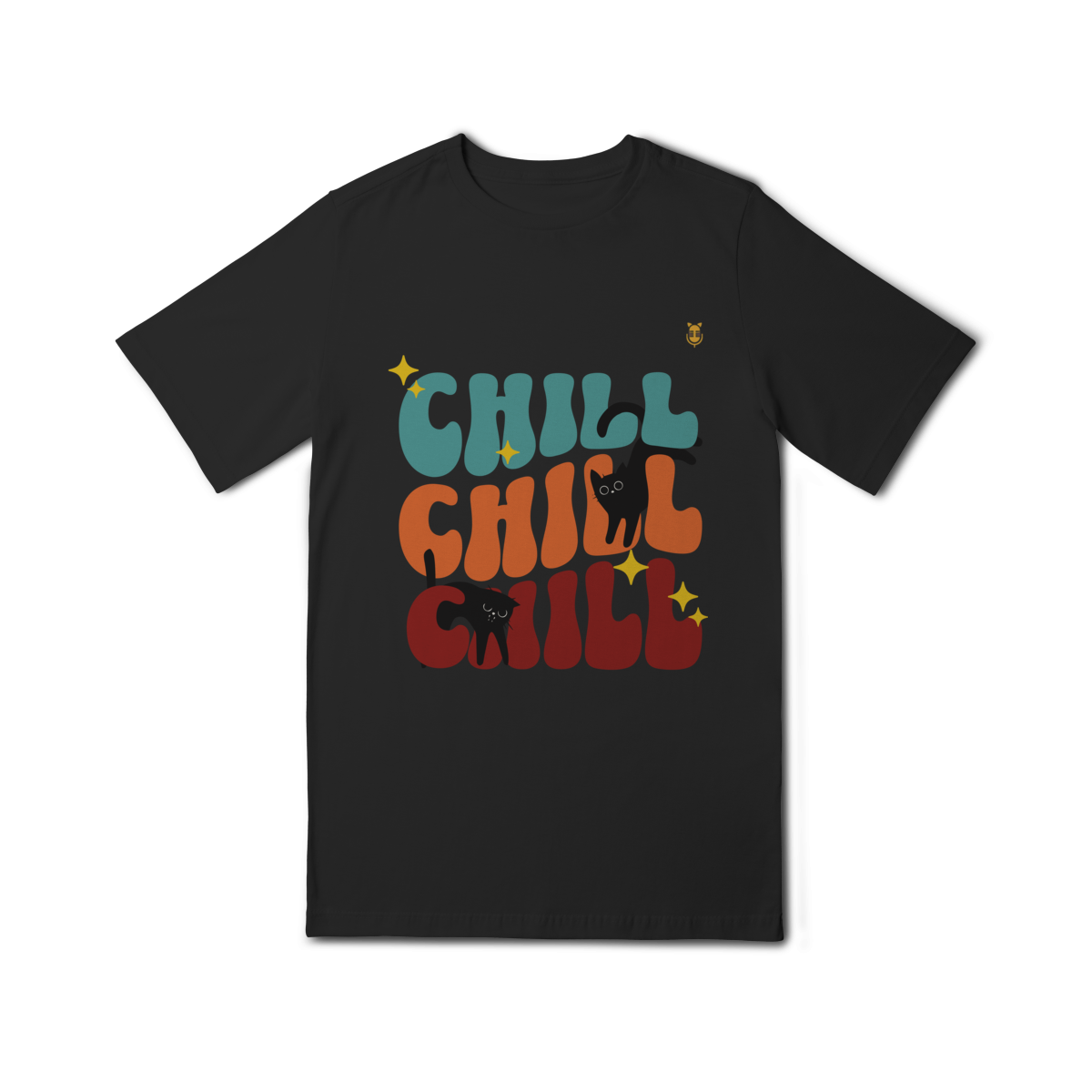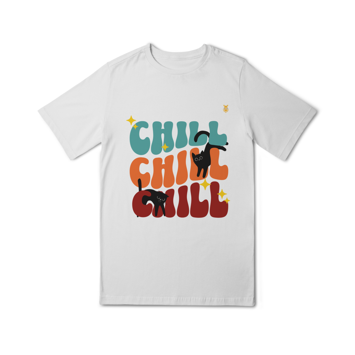 Uma estampa divertida e cheia de cores, trazendo o clima leve e descontraído do universo de Kikito e Amarelinho. Com a palavra CHILL em tipografia retrô repetida três vezes e dois gatinhos pretos brincalhões interagindo com as letras, essa arte transmite calmaria, humor e fofura.