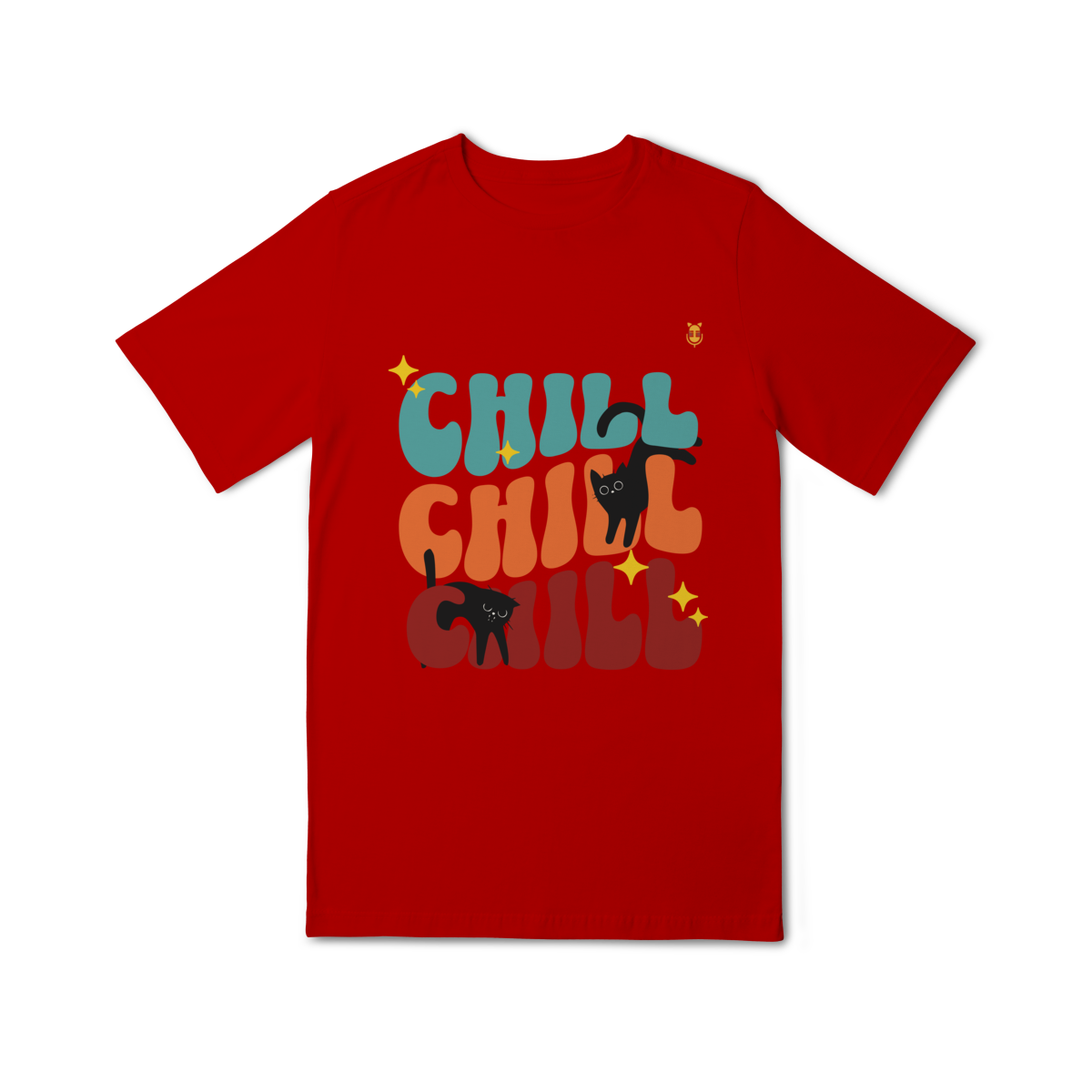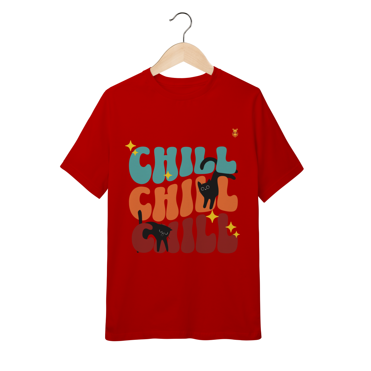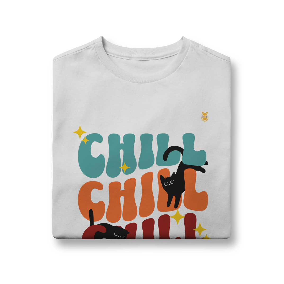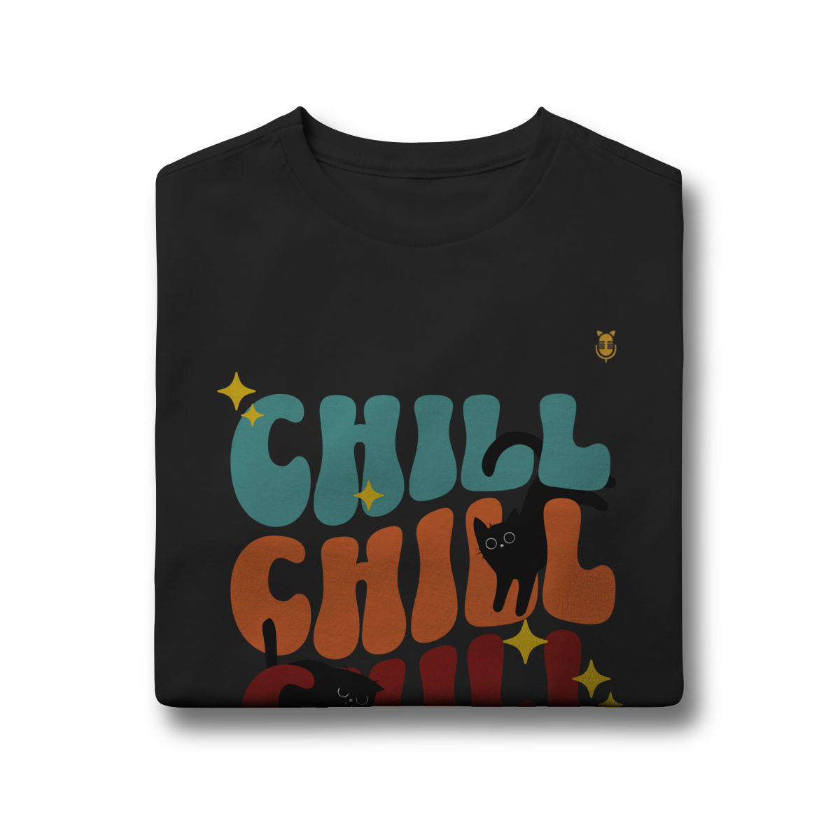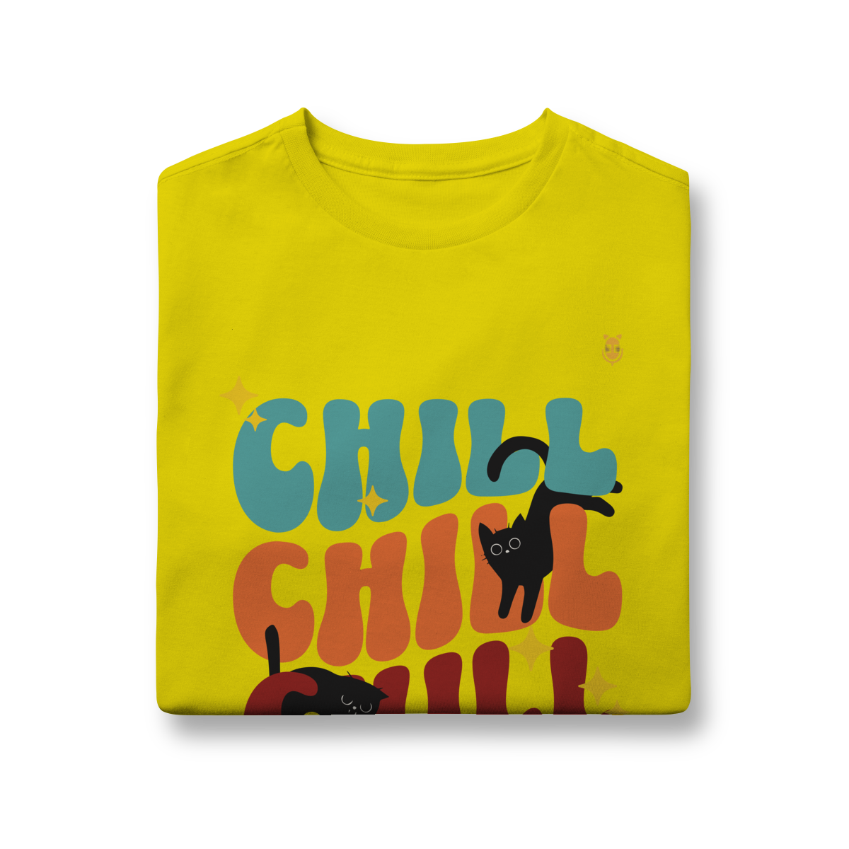 Uma estampa divertida e cheia de cores, trazendo o clima leve e descontraído do universo de Kikito e Amarelinho. Com a palavra CHILL em tipografia retrô repetida três vezes e dois gatinhos pretos brincalhões interagindo com as letras, essa arte transmite calmaria, humor e fofura.