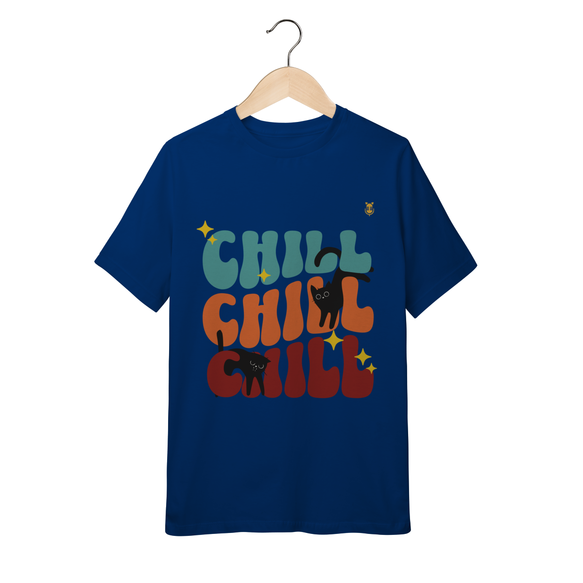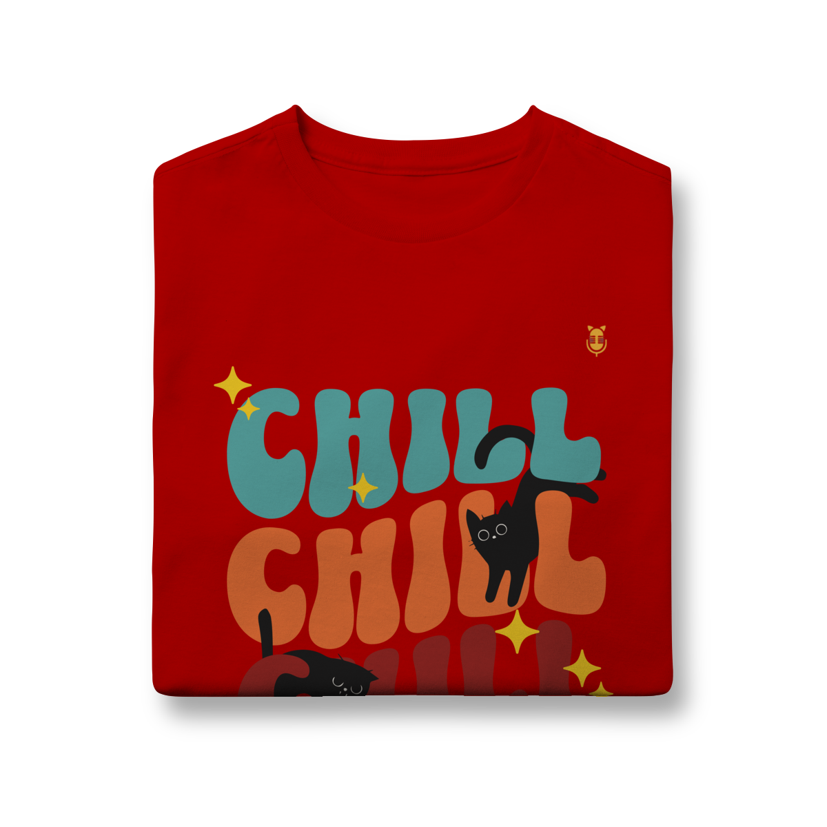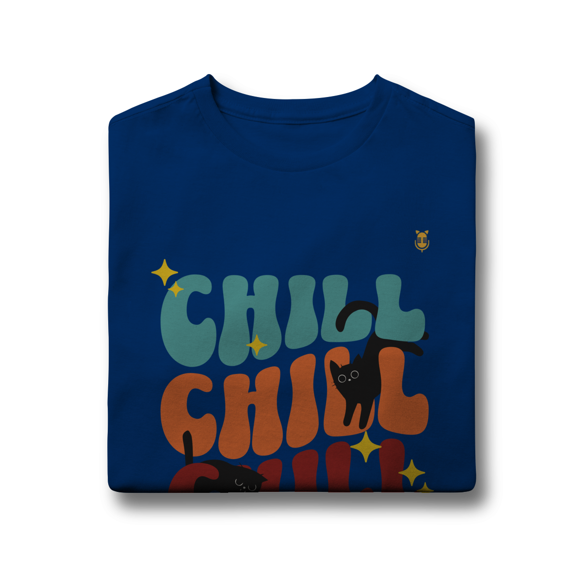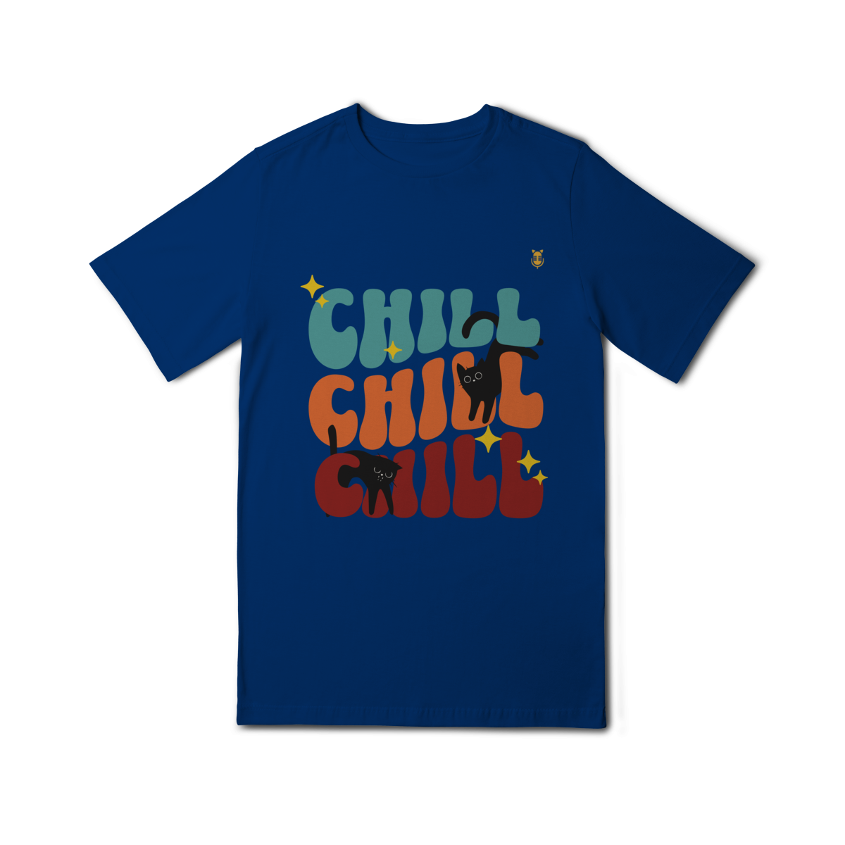 Uma estampa divertida e cheia de cores, trazendo o clima leve e descontraído do universo de Kikito e Amarelinho. Com a palavra CHILL em tipografia retrô repetida três vezes e dois gatinhos pretos brincalhões interagindo com as letras, essa arte transmite calmaria, humor e fofura.
