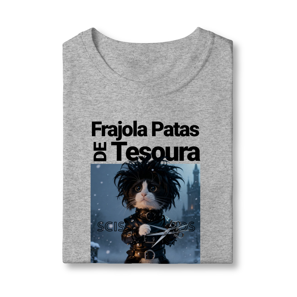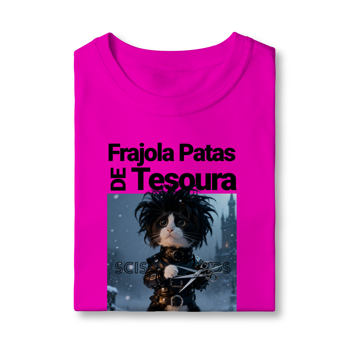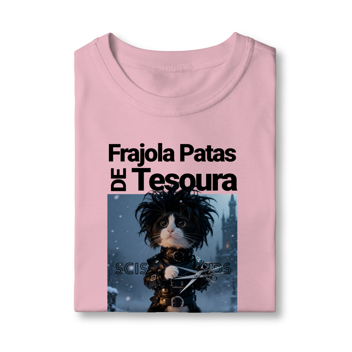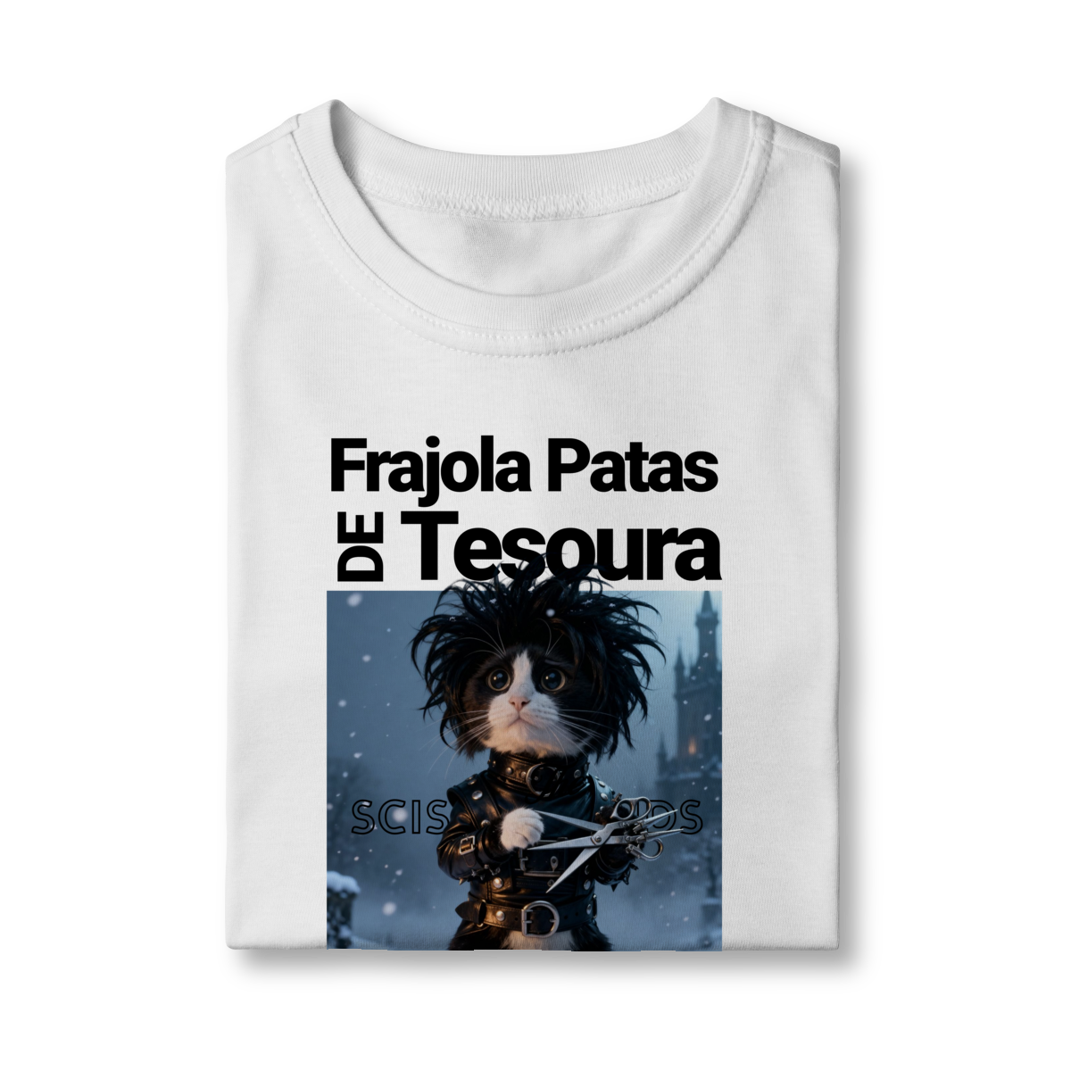 A camiseta “Frajola Patas de Tesoura” traz uma releitura divertida e estilizada do clássico personagem de tesouras — só que agora reinventado como um gatinho dramático, fofo e cheio de personalidade.