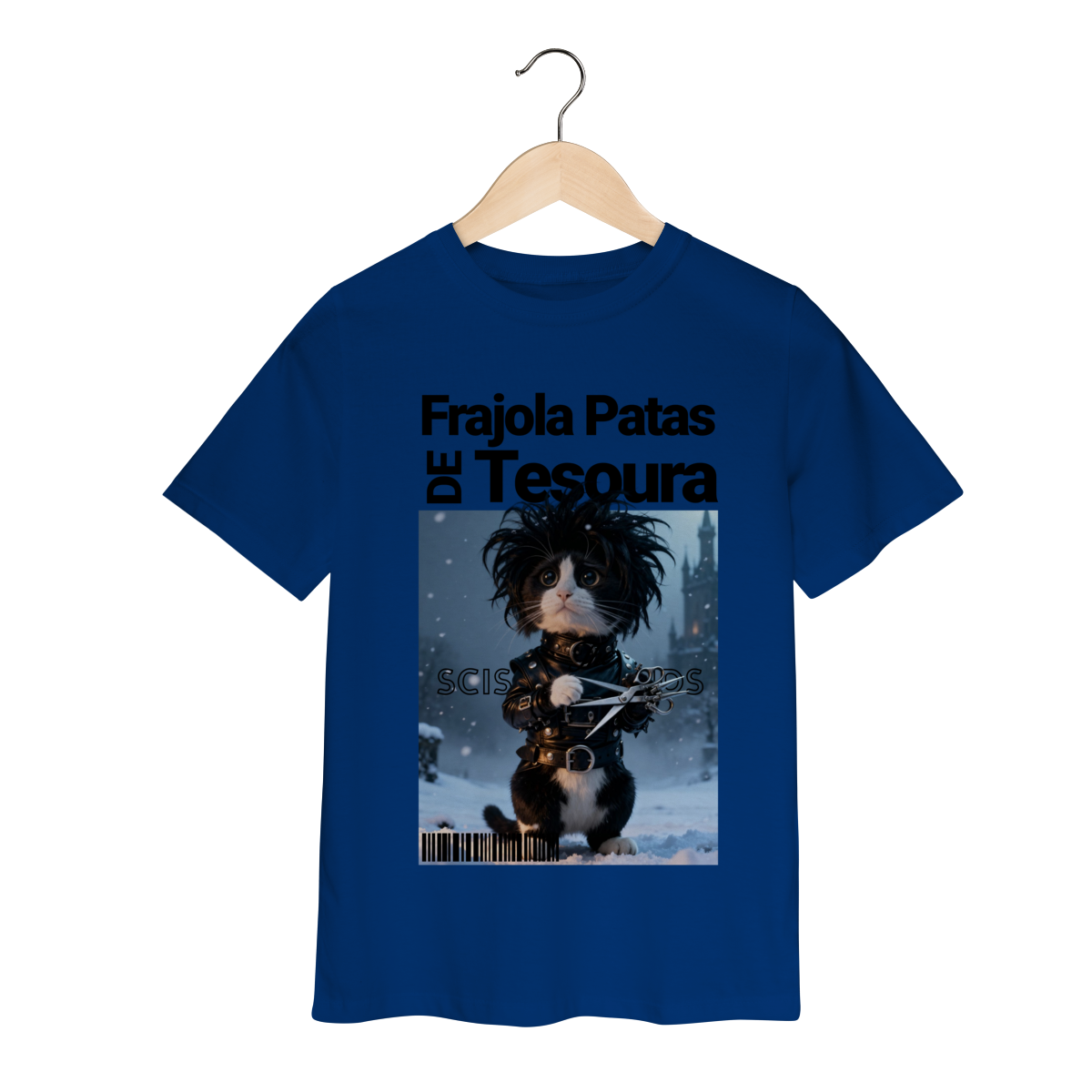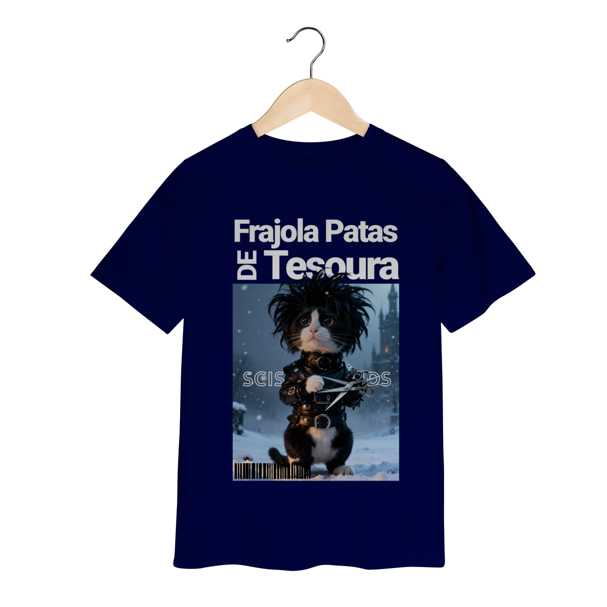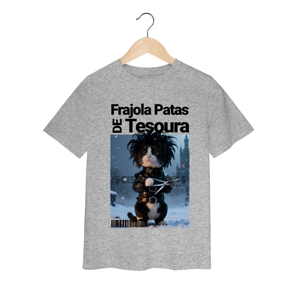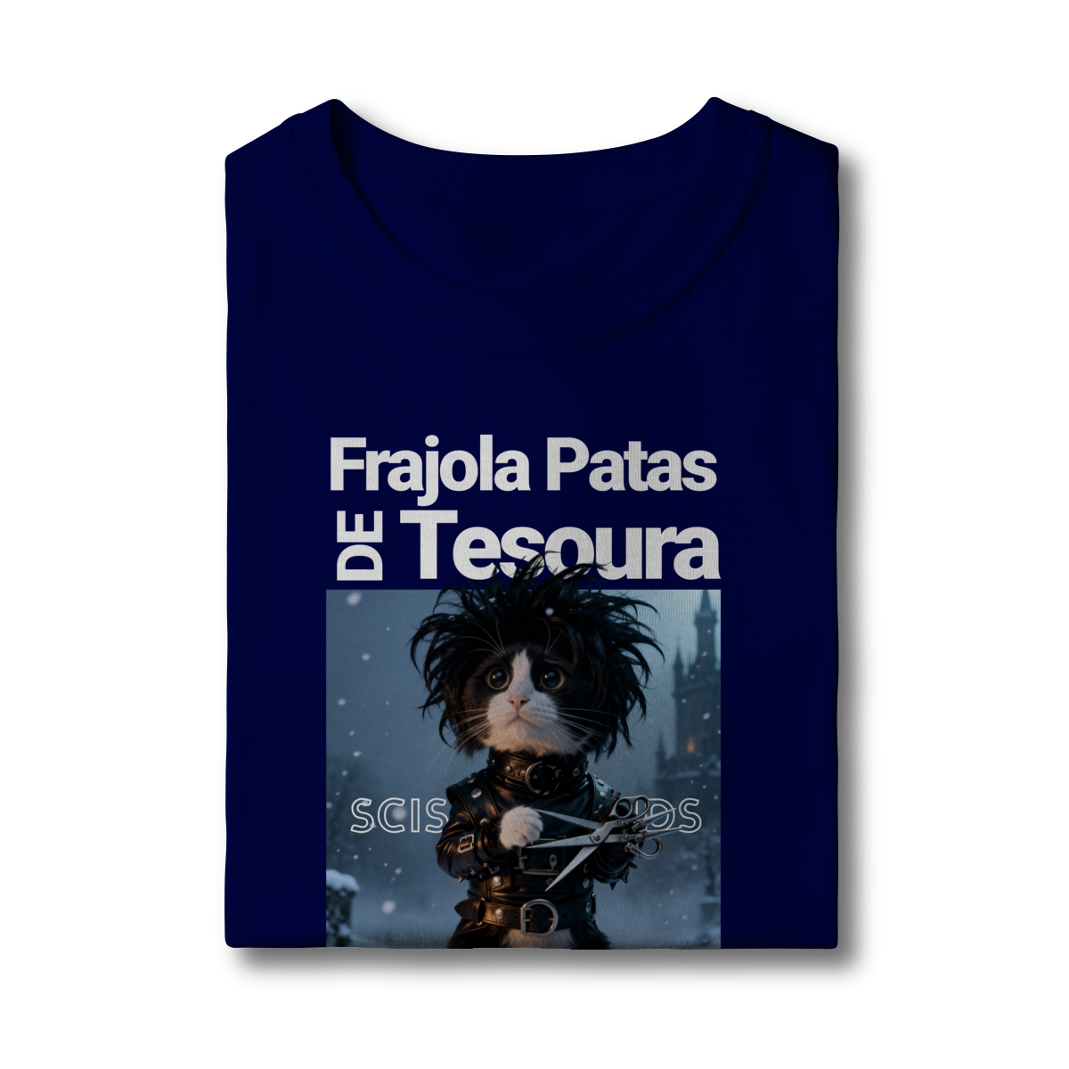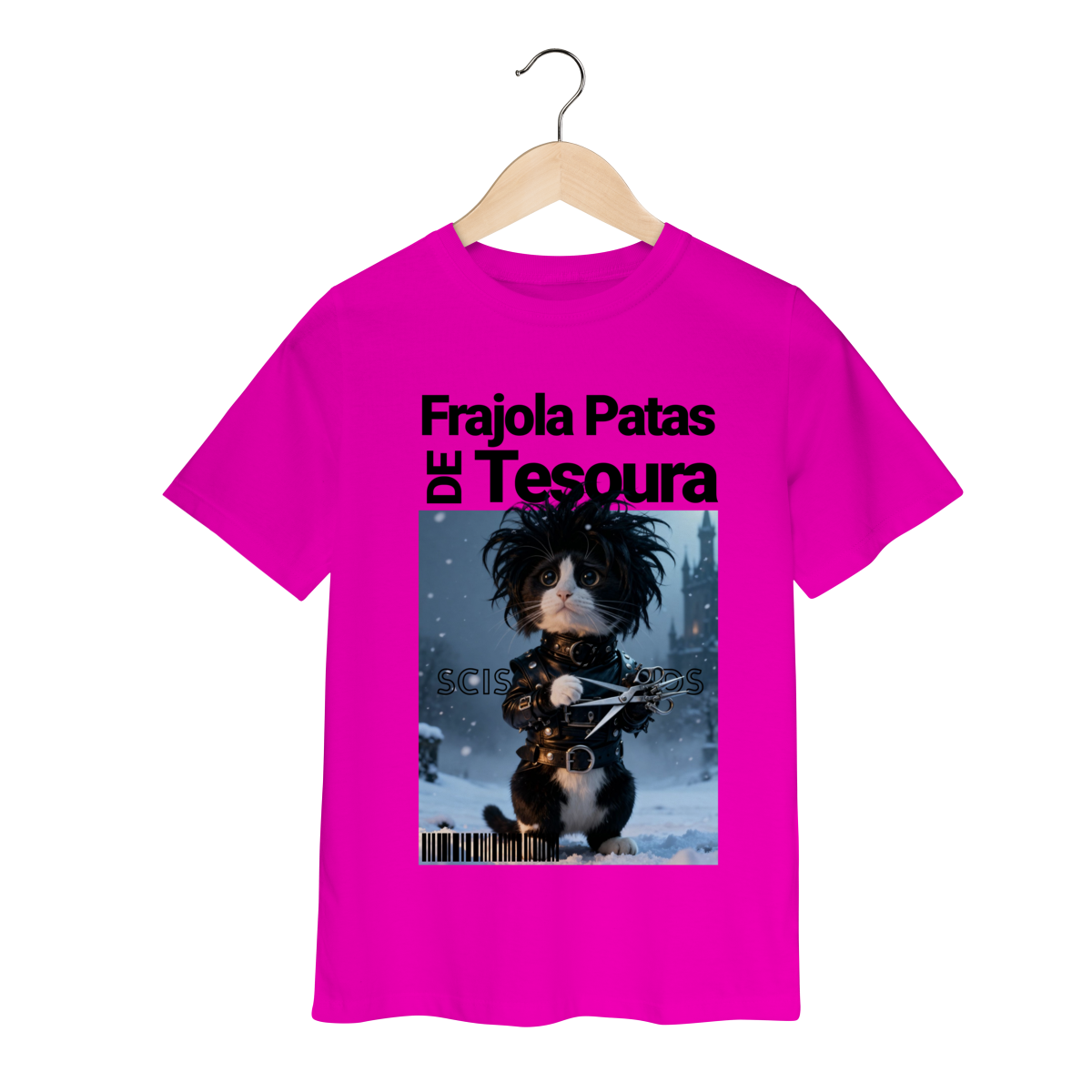 A camiseta “Frajola Patas de Tesoura” traz uma releitura divertida e estilizada do clássico personagem de tesouras — só que agora reinventado como um gatinho dramático, fofo e cheio de personalidade.