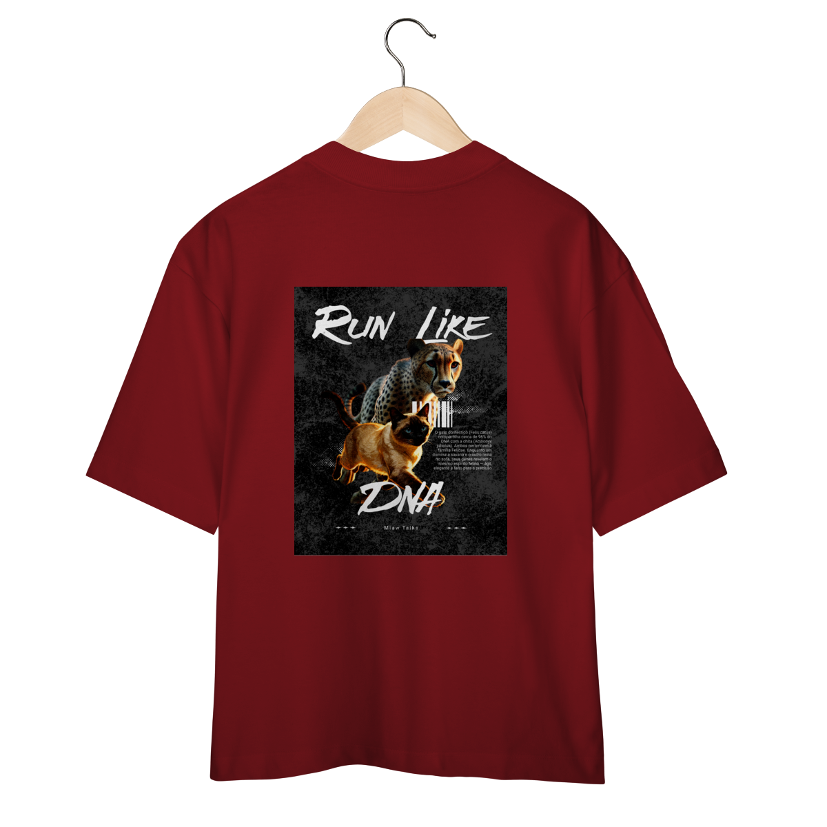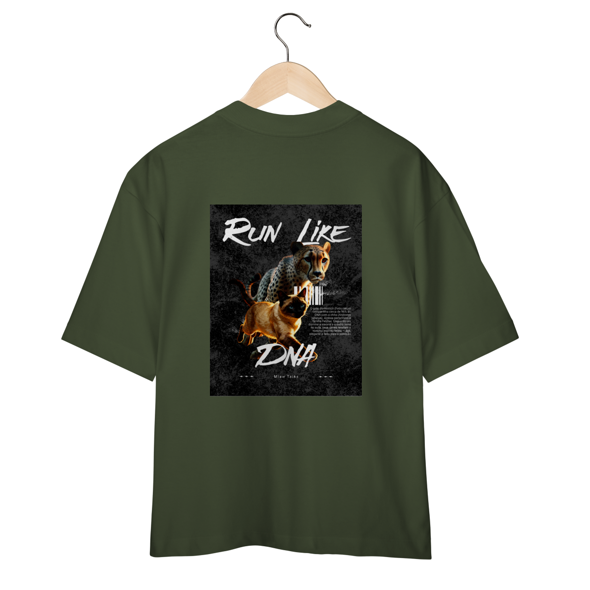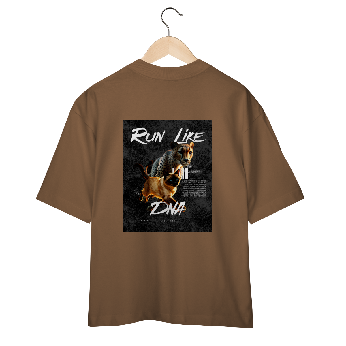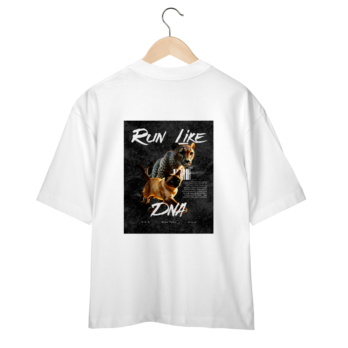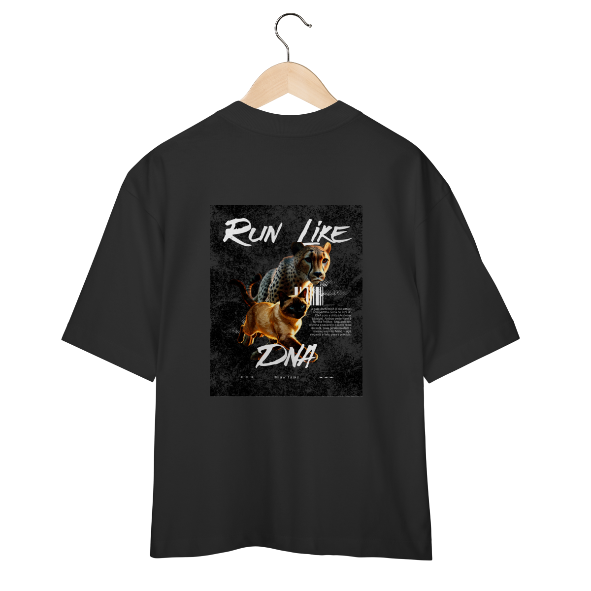 A camiseta Run Like DNA traz uma estampa divertida e cheia de energia, mostrando um gato correndo com atitude ao lado de um felino estilizado em pose dinâmica. A arte tem visual esportivo e moderno, perfeita para quem gosta de humor, gatos e camisetas com tema de ação. Confortável e estilosa, combina com looks casuais e é uma ótima opção para presentear.