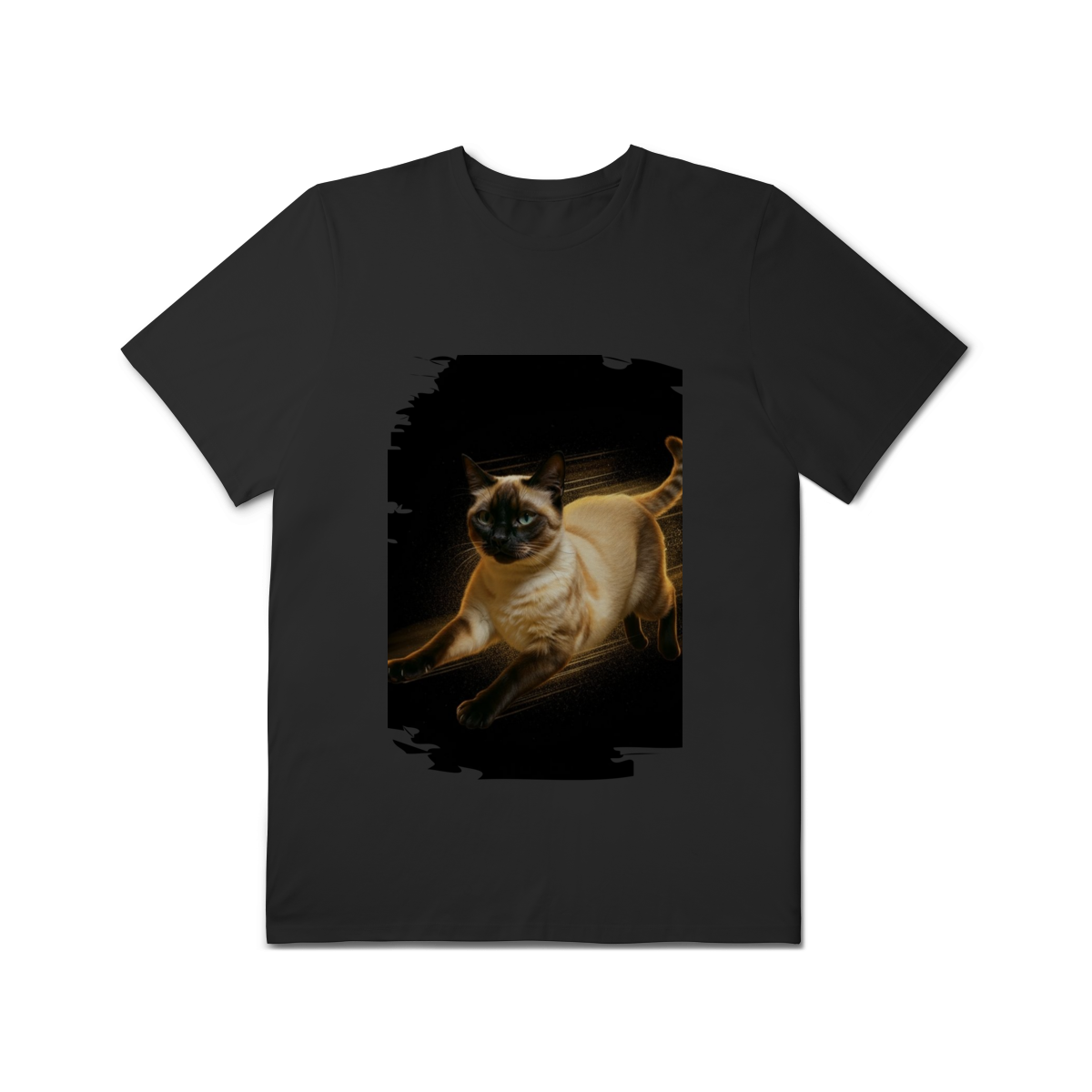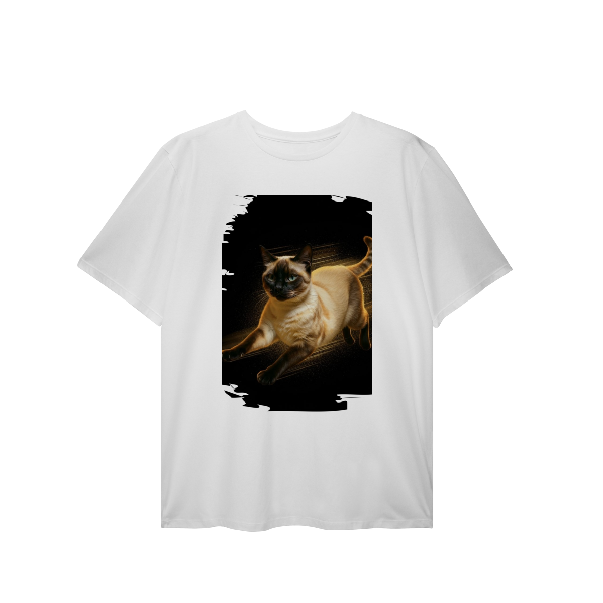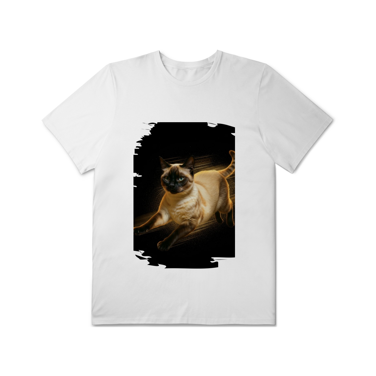 A arte transmite velocidade, atitude e elegância felina, perfeita para quem ama gatos ativos e estampas que passam a sensação de ação e liberdade.