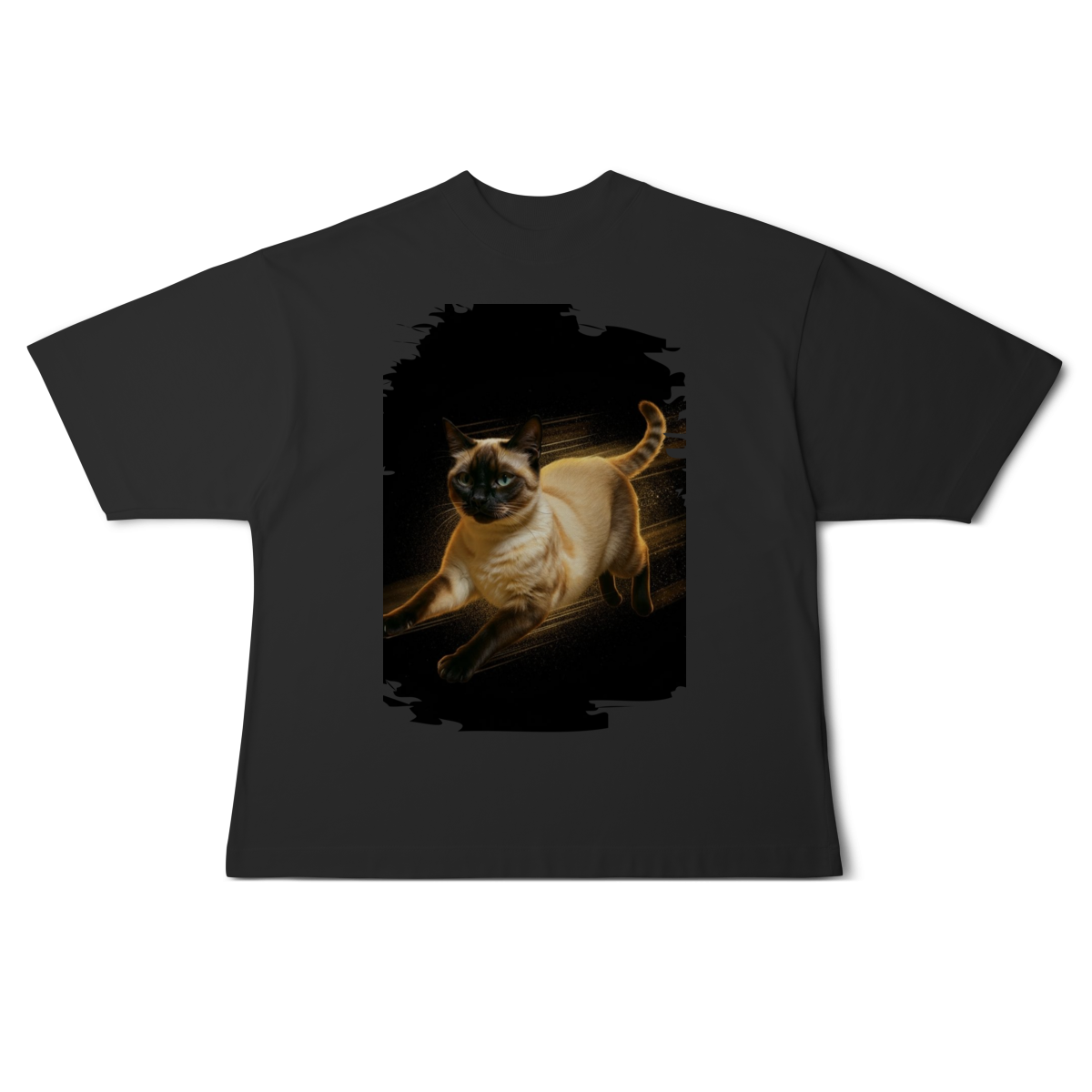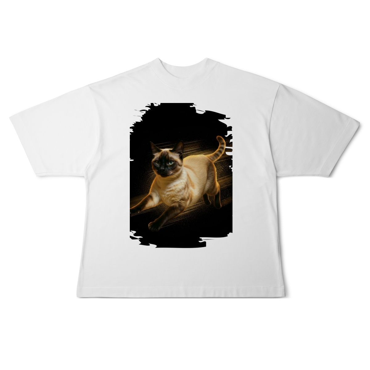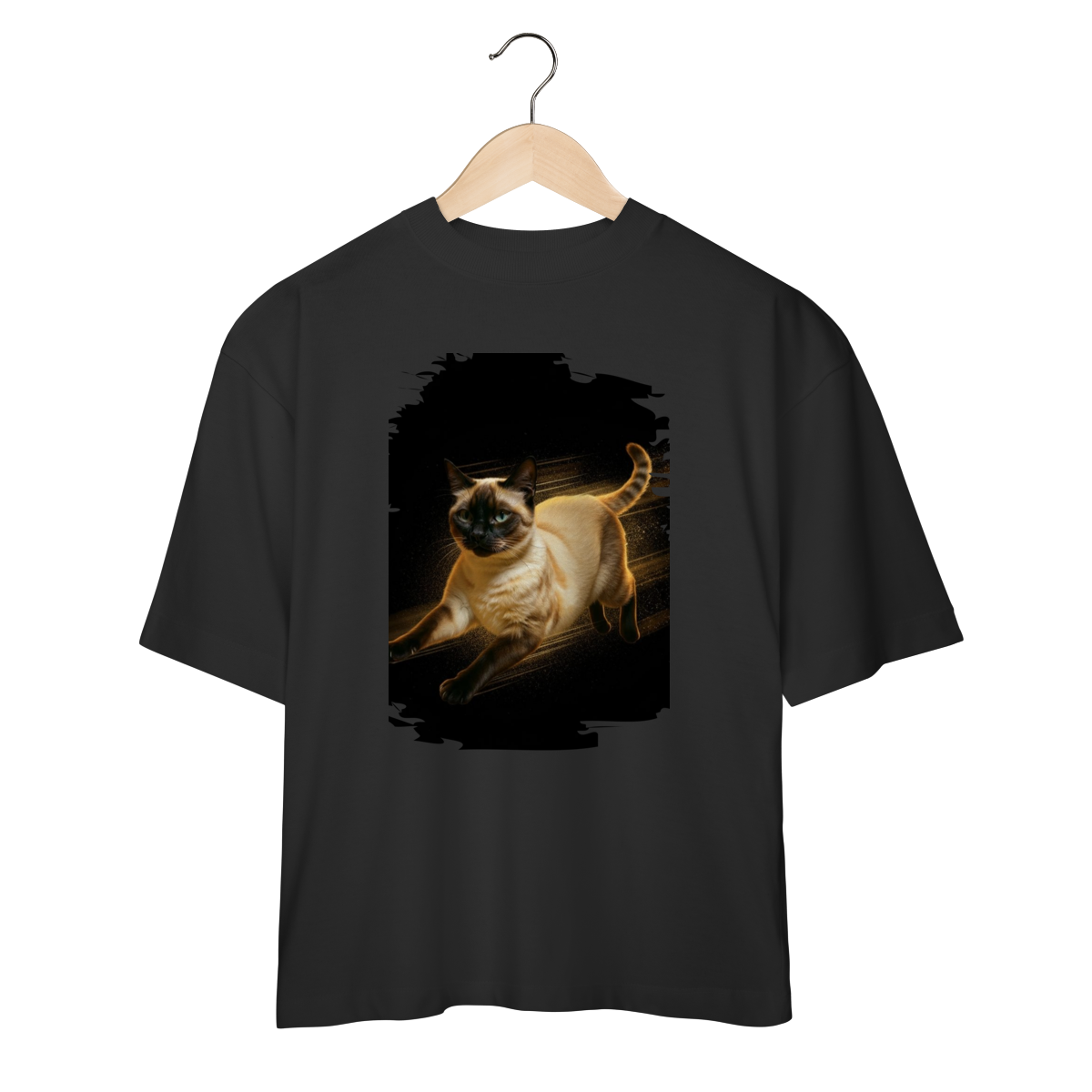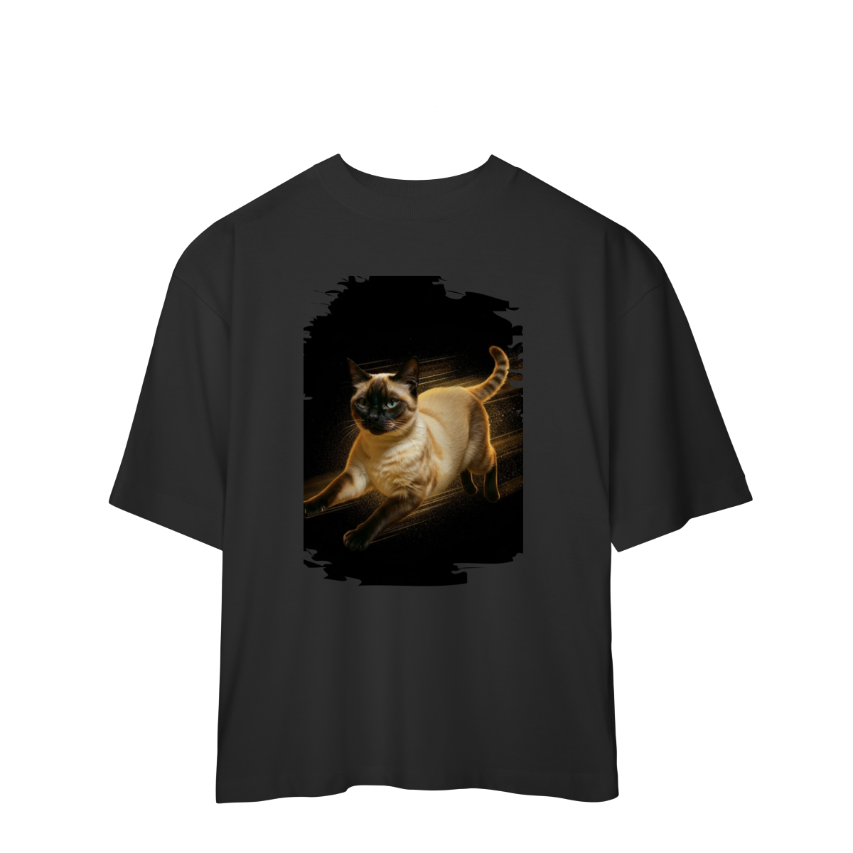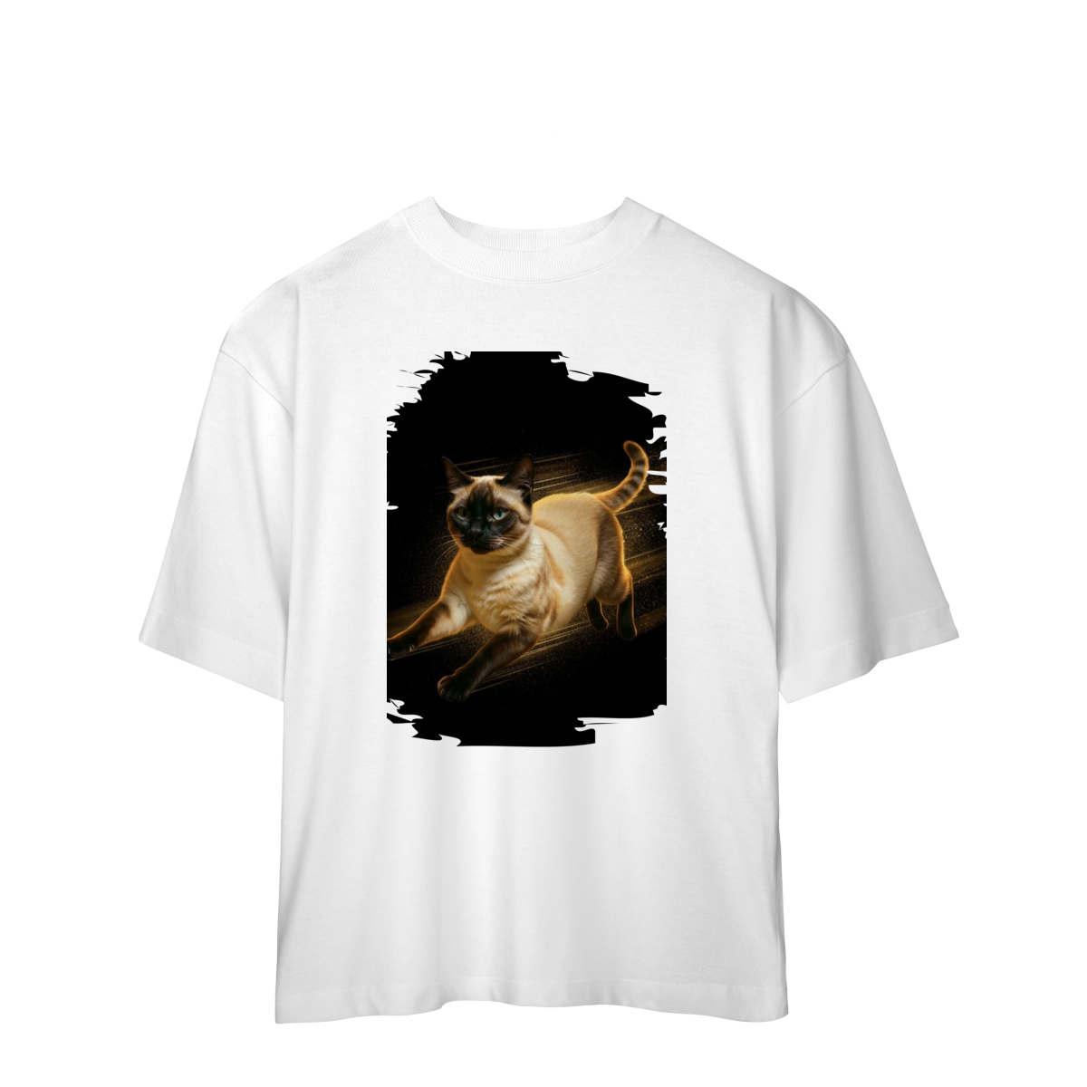 A arte transmite velocidade, atitude e elegância felina, perfeita para quem ama gatos ativos e estampas que passam a sensação de ação e liberdade.