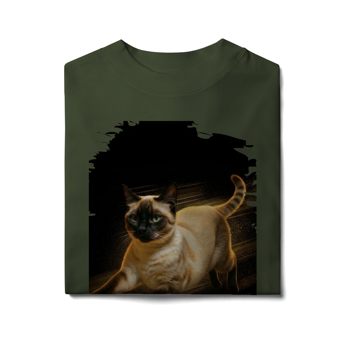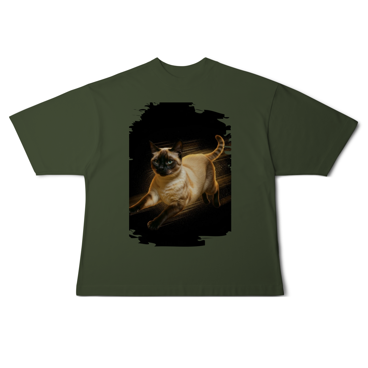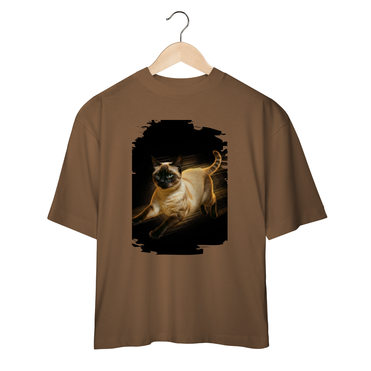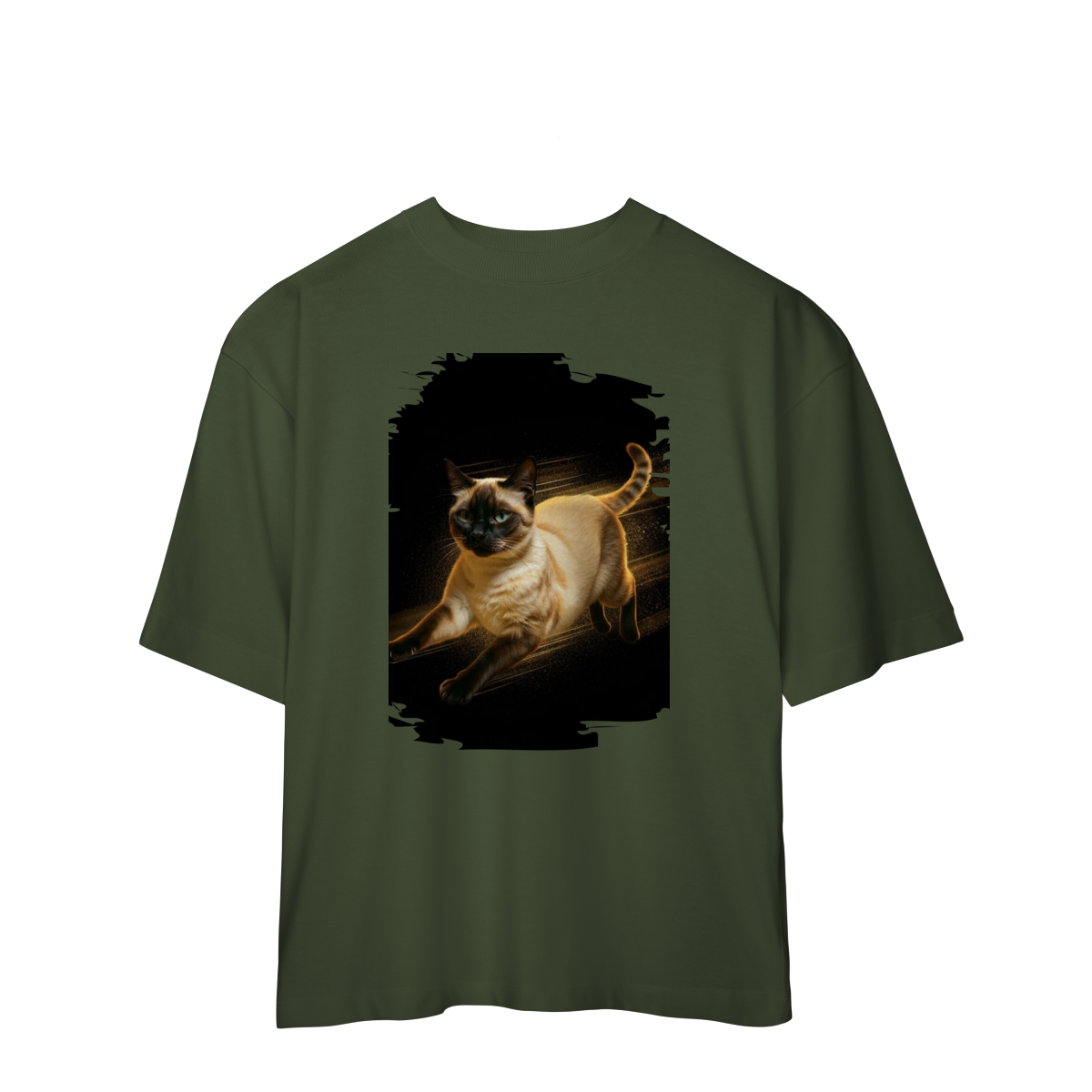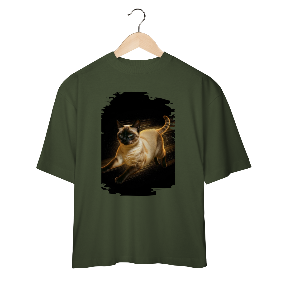 A arte transmite velocidade, atitude e elegância felina, perfeita para quem ama gatos ativos e estampas que passam a sensação de ação e liberdade.