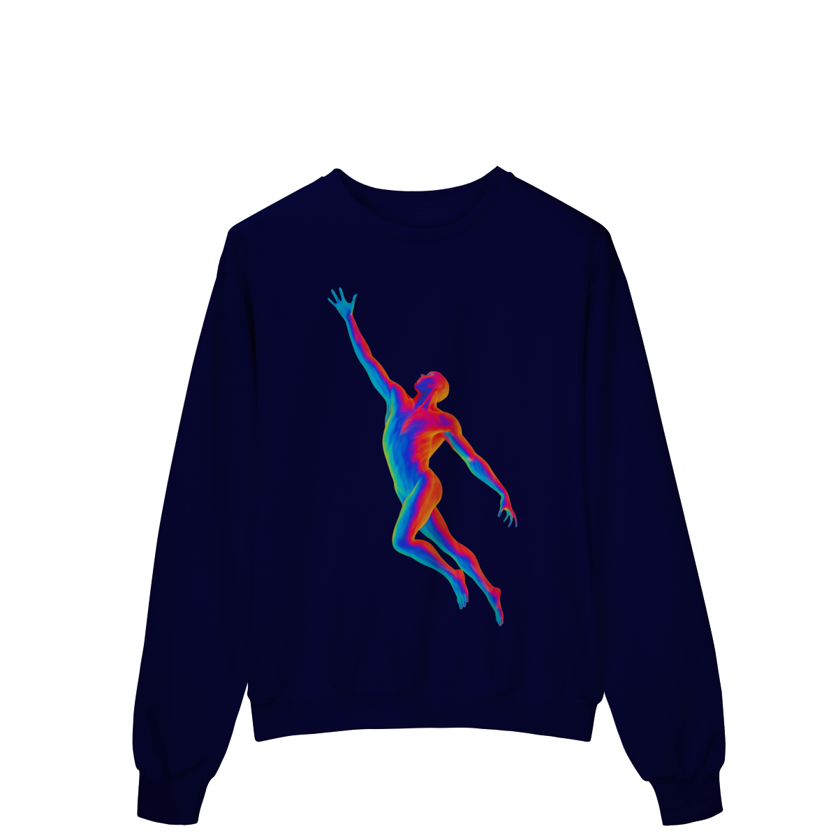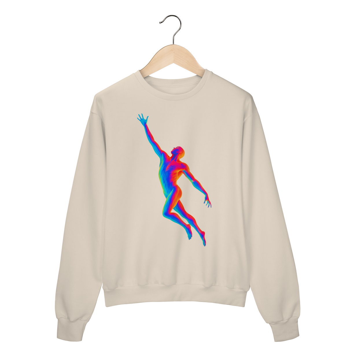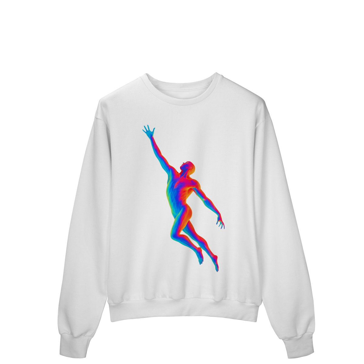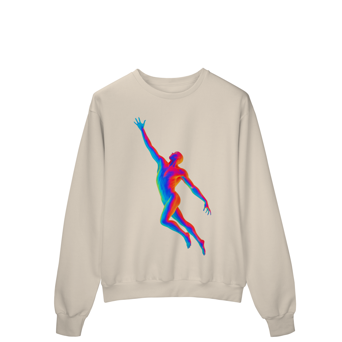 A Ascensão Psicodélica traz uma figura humana em posição de elevação, representada em cores vibrantes que criam um efeito térmico e surreal.