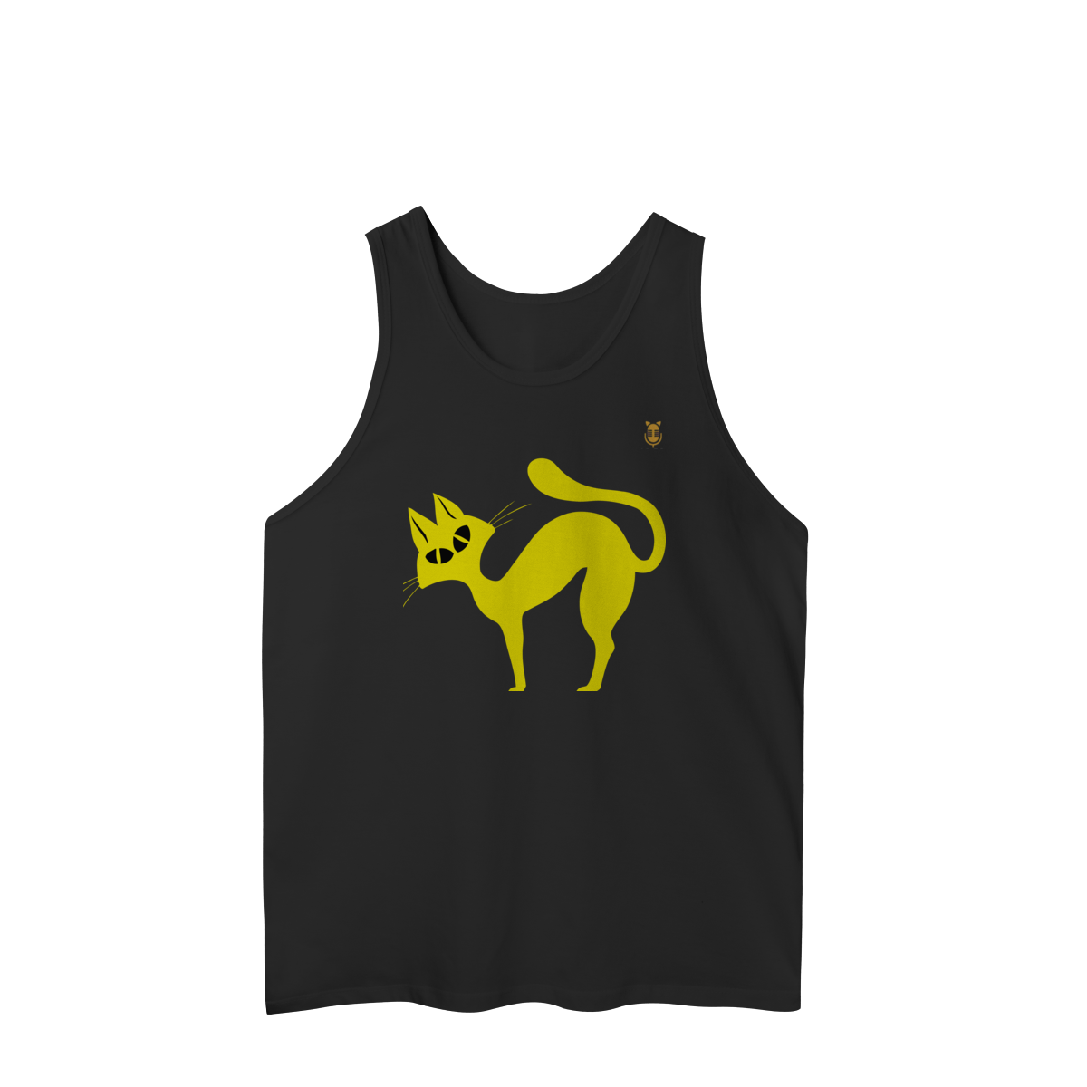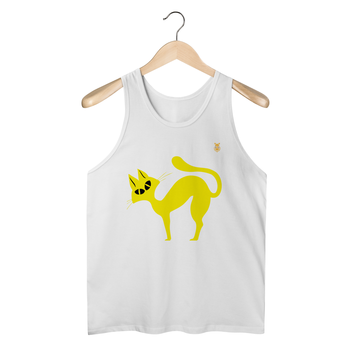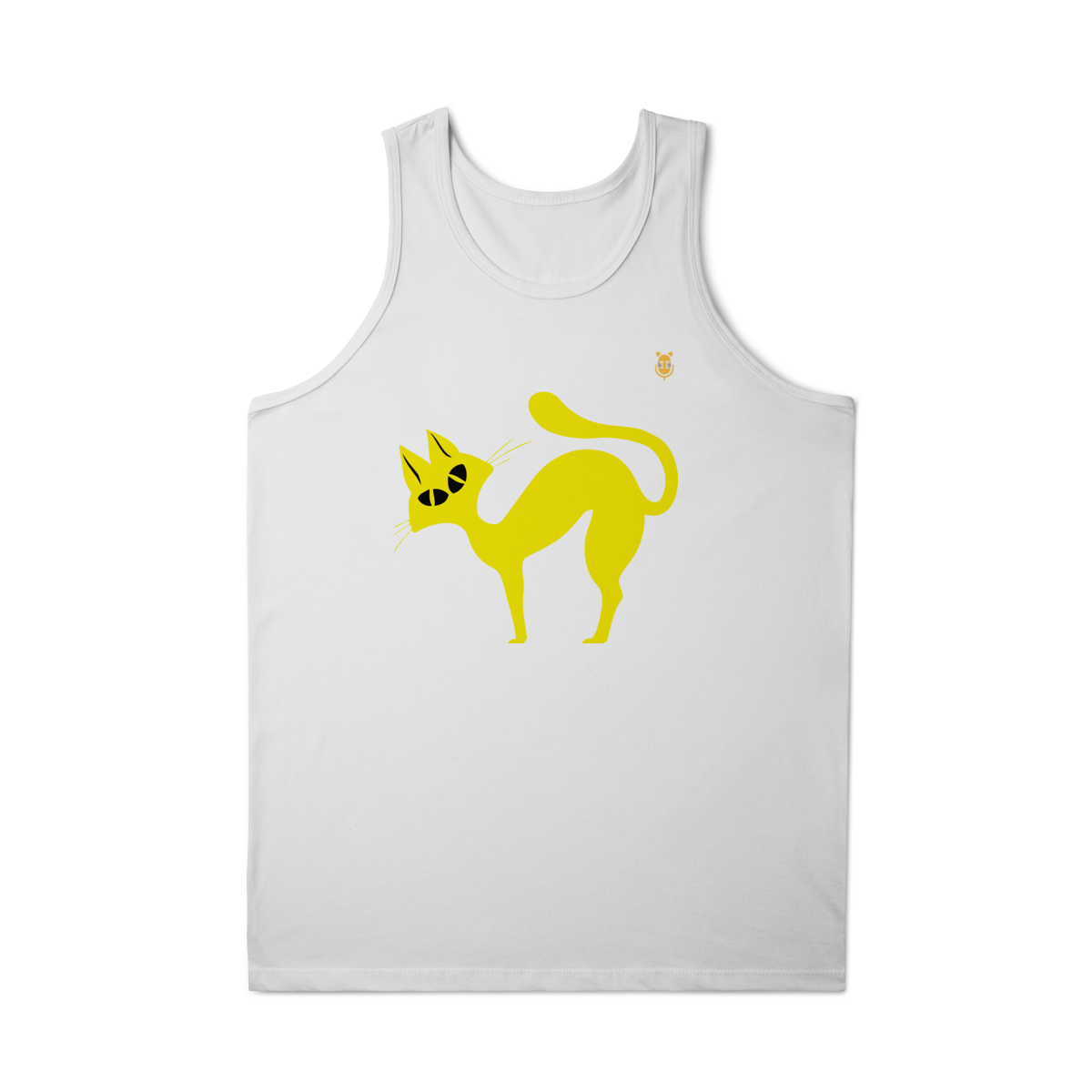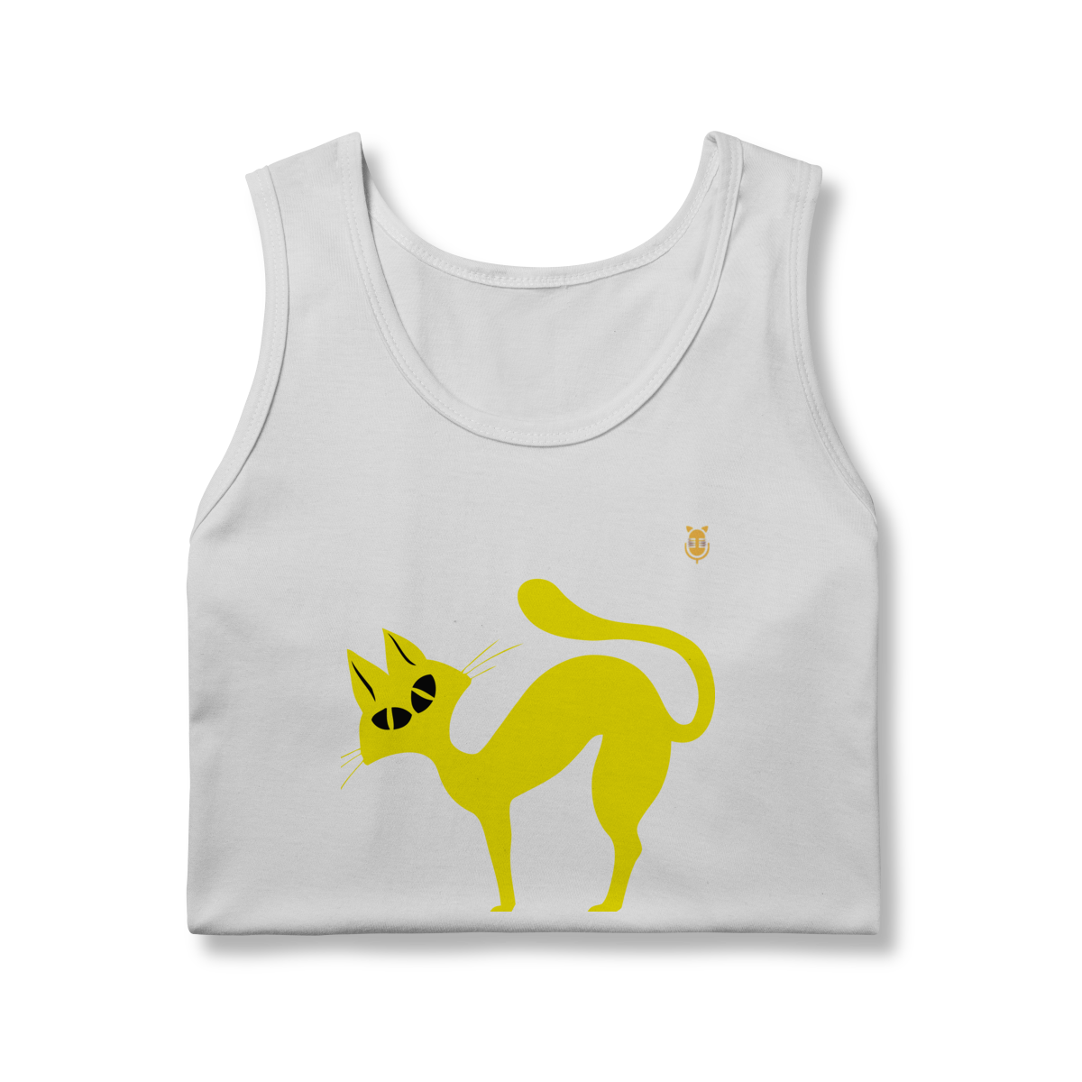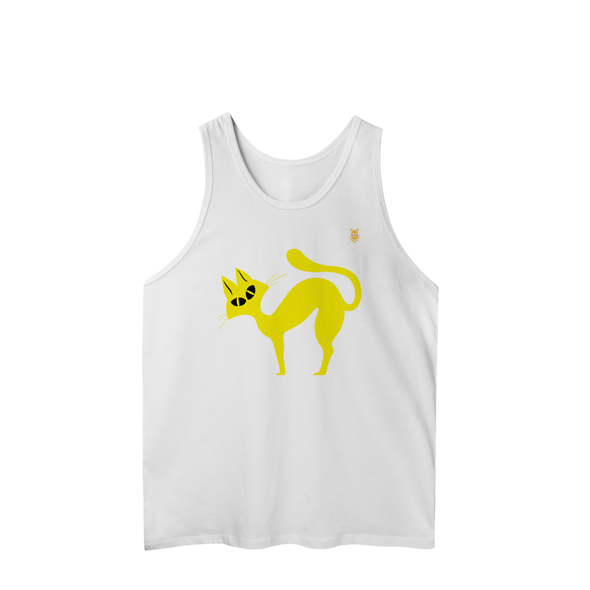 A  Gato Curioso traz um felino estilizado em linhas fluidas amarelas, com expressão intrigante e charme minimalista.