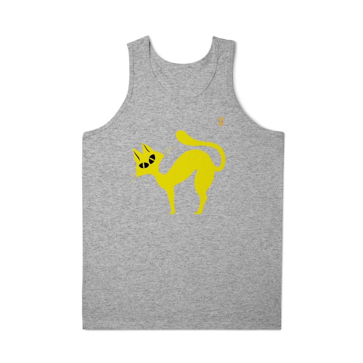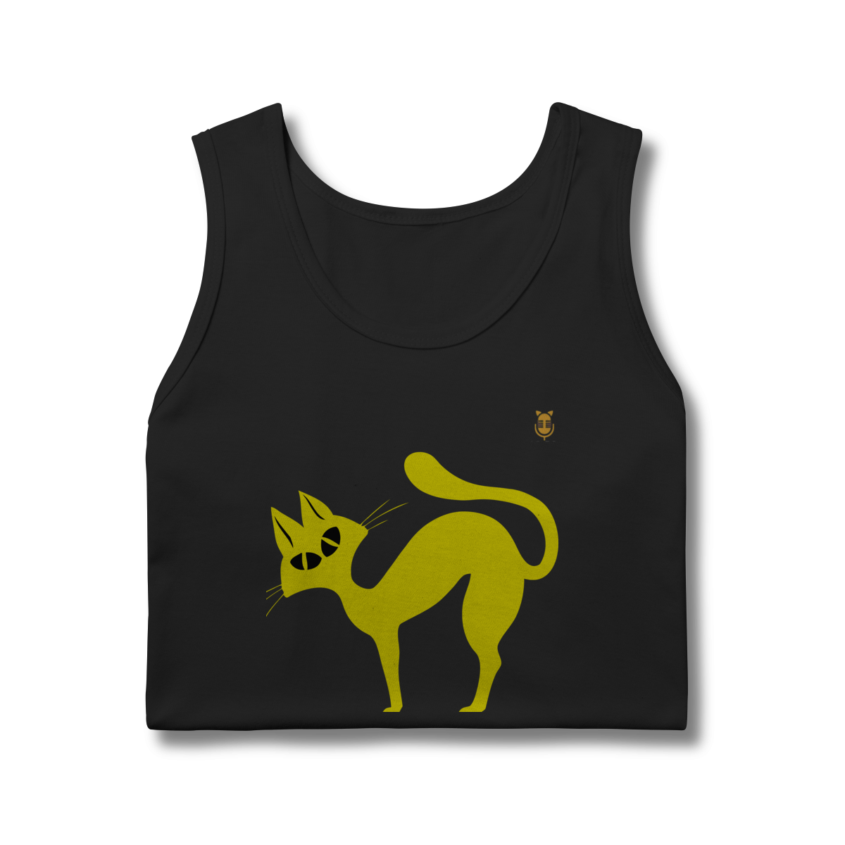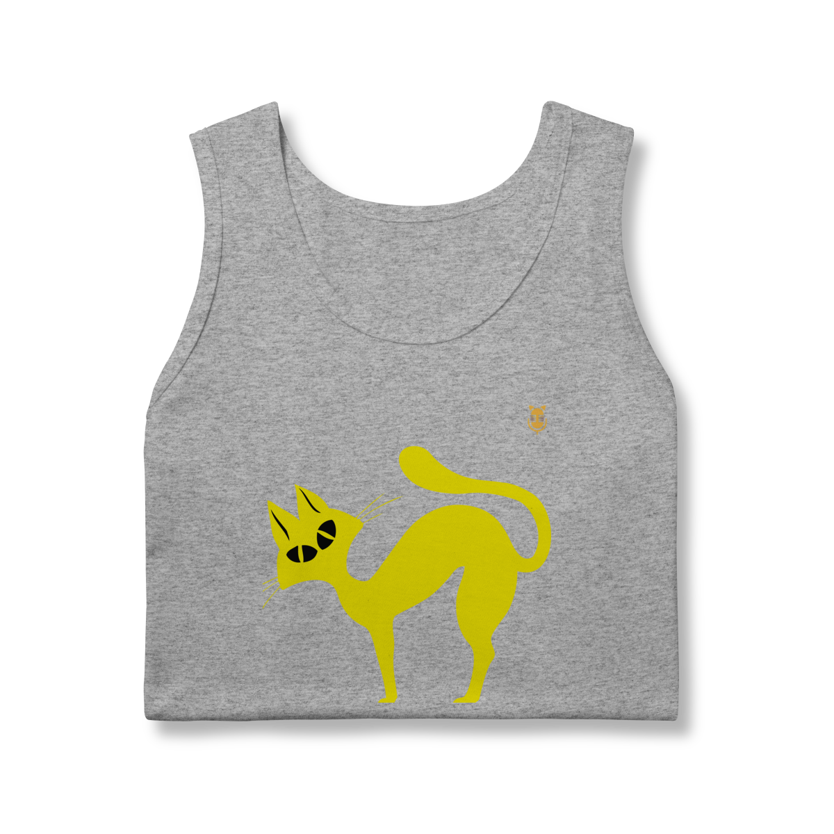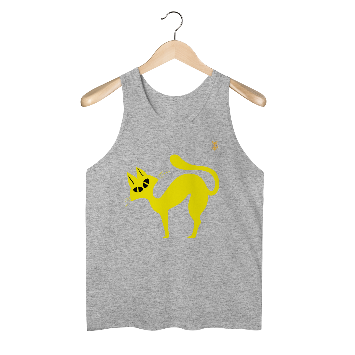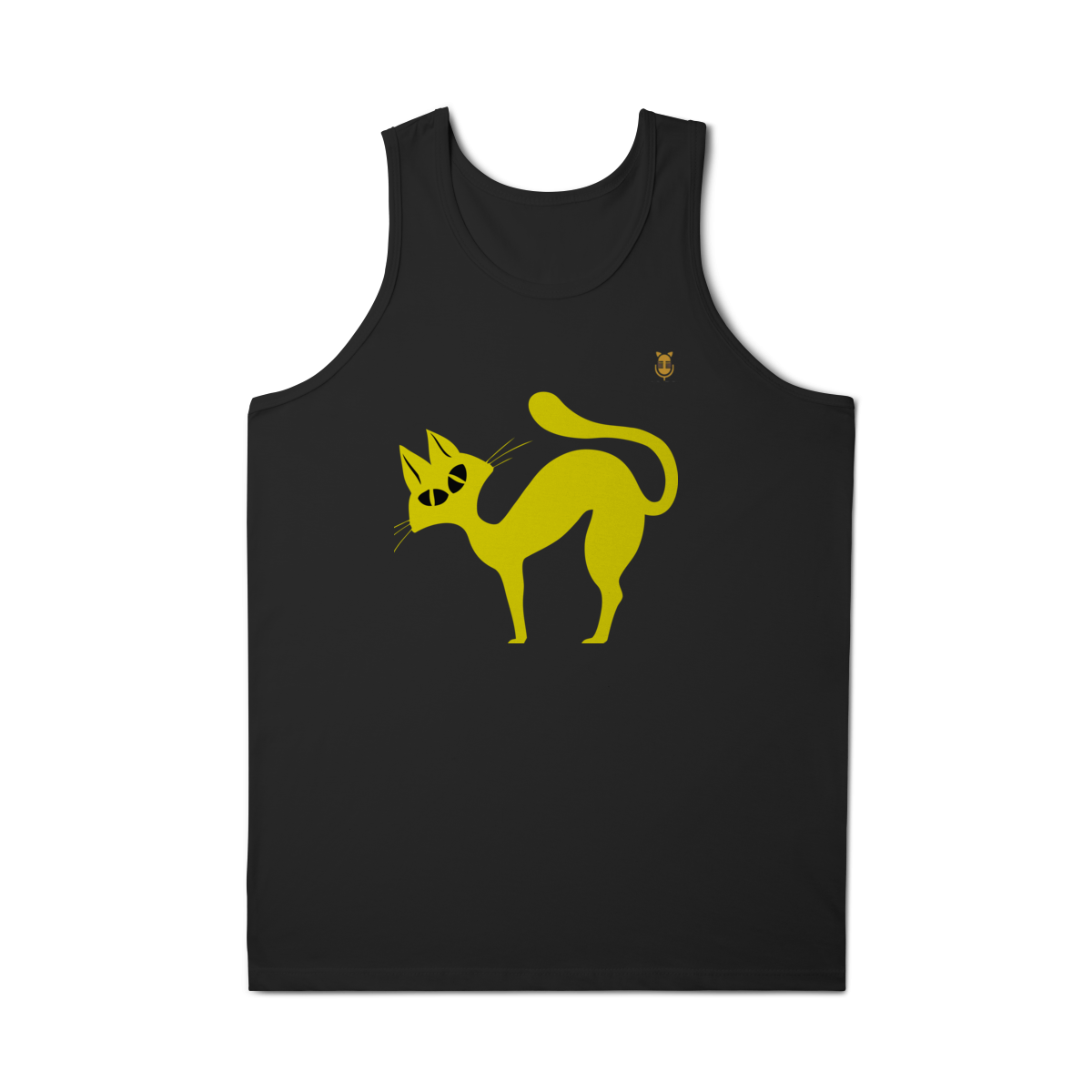 A  Gato Curioso traz um felino estilizado em linhas fluidas amarelas, com expressão intrigante e charme minimalista.