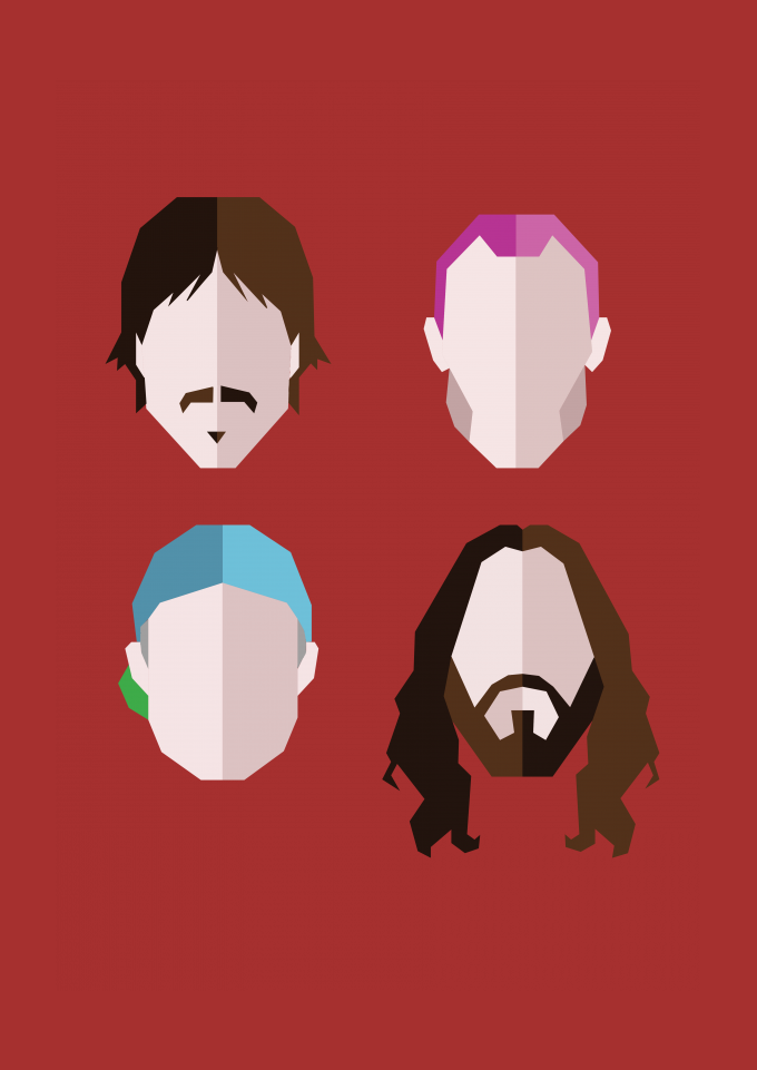 Estampa da banda de rock Red Hot Chili Peppers (rhcp), com os membros Anthony, Flea, Chad e John em estilo minimalista.