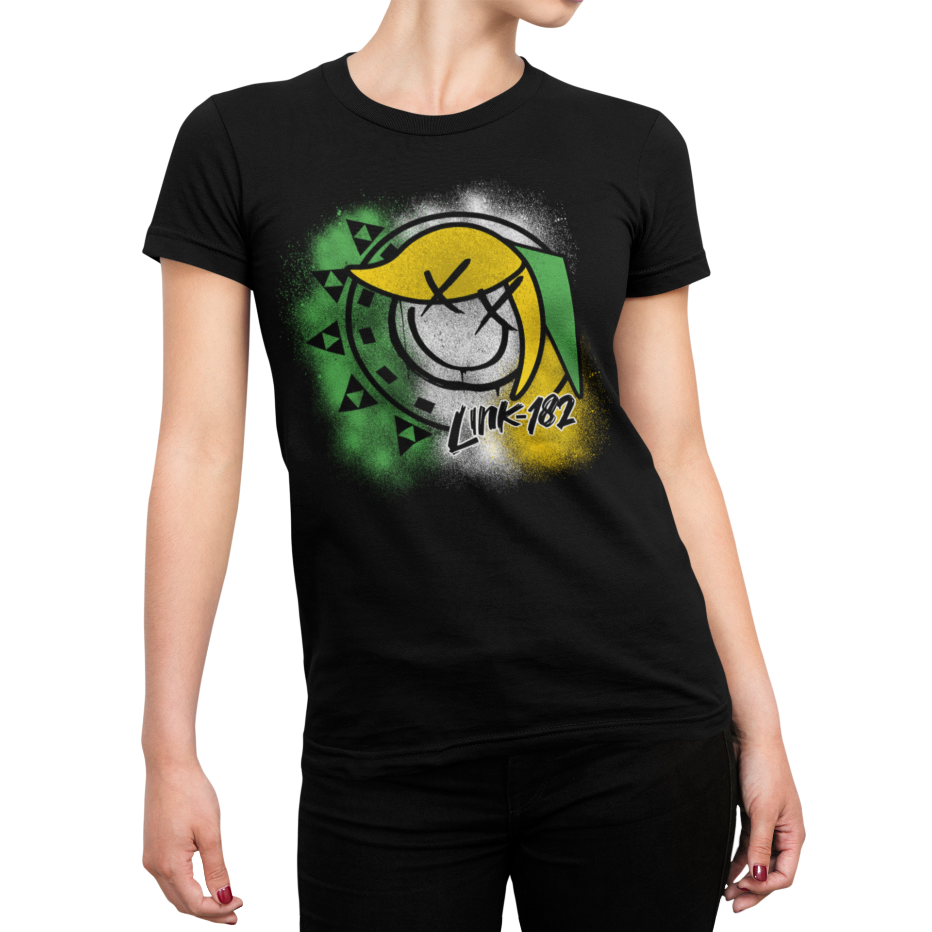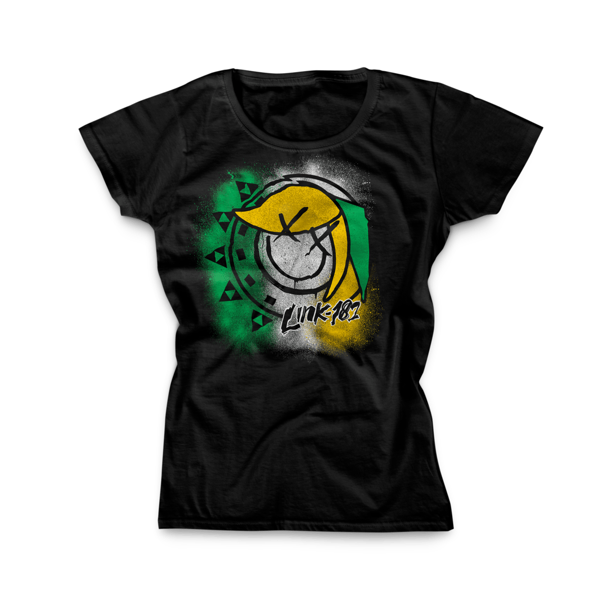 Nesta batalha épica de estampas, a icônica logo do Blink-182 se transforma em um portal para Hyrule, substituindo o famoso "blink-182" por um Link 182