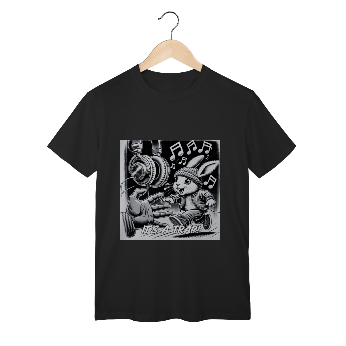 Estampa Camiseta ITS A TRAP! Parece que nosso amigo foi fisgado pelo Trap! Seja Old School, Boom-bap ou Lo-fi, um dos gêneros do hip-hop e do rap vai te conquistar! Será que você vai ajudar o coelhinho a fugir ou vai entrar nessa toca? Comenta aí! Qual seu estilo favorito?