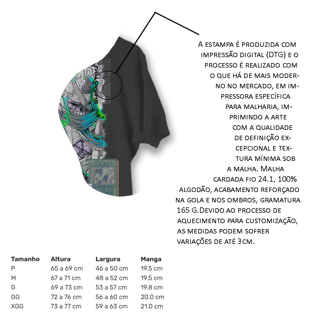 Não perca a oportunidade de adicionar esta peça exclusiva à sua coleção de anime. Compre a Camiseta Ryuma hoje mesmo e embarque em uma jornada de honra, coragem e determinação ao lado desse lendário personagem de One Piece!