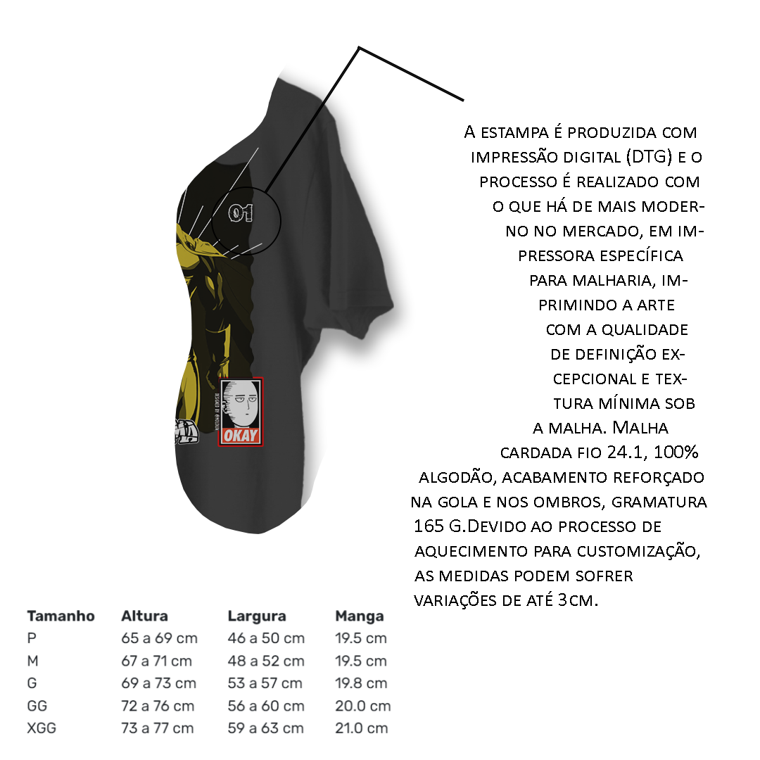 Com seu design icônico, a camiseta apresenta o rosto sério de Saitama e seu distintivo cabelo careca, garantindo um visual instantaneamente reconhecível. A estampa é feita com técnicas avançadas de impressão que garantem cores vibrantes e detalhes nítidos, trazendo à vida a essência do personagem. Seja para uso diário, eventos cosplay ou simplesmente para colecionar, esta camiseta é um item indispensável para todos os fãs de One Punch Man.