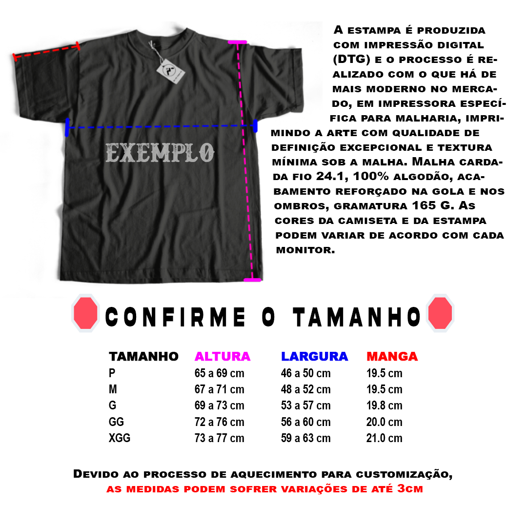 Cores do produto: Como cada tela de computador ou celular tem seu próprio jeito de mostrar cores, então a cor da sua camiseta e da estampa pode ser um pouco diferente do que você viu online.