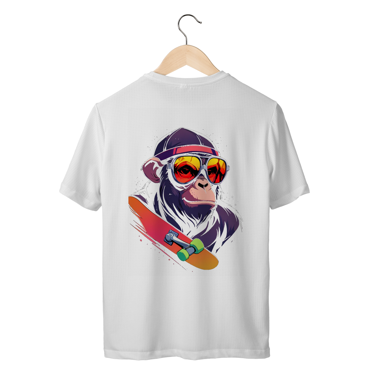 Macaco com óculos vermelhos, boné e skate em destaque. Estilo direto, sem excesso.