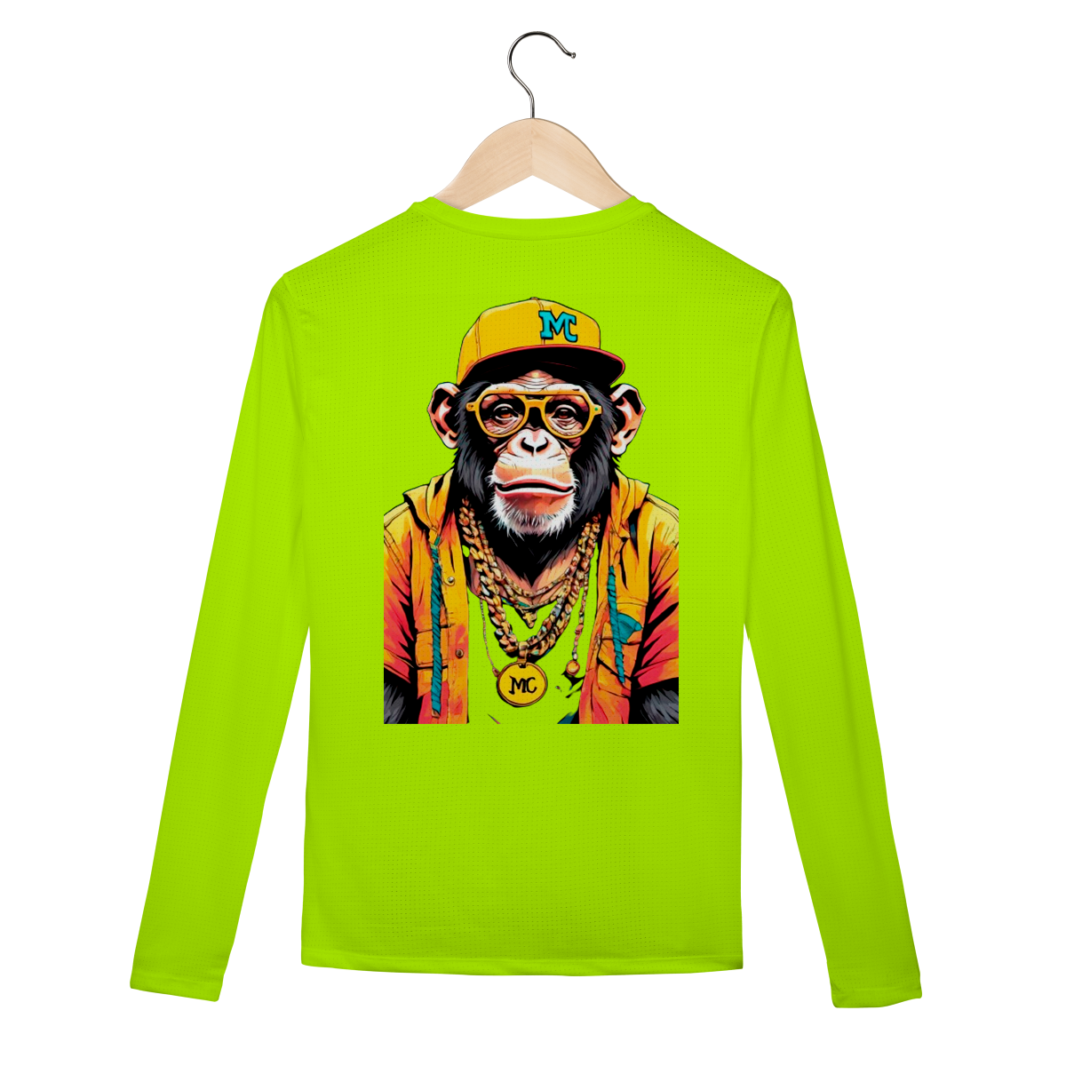 Chimpa tem visual vibrante, cheio de cor e estilo. Correntes pesadas, jaqueta colorida, boné bordado.