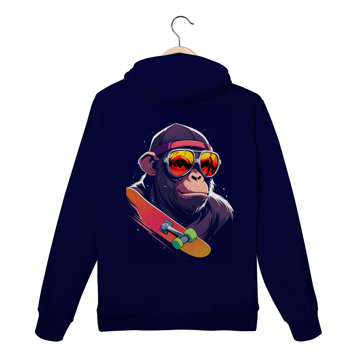 Macaco com óculos vermelhos, boné e skate em destaque. Estilo direto, sem excesso.
