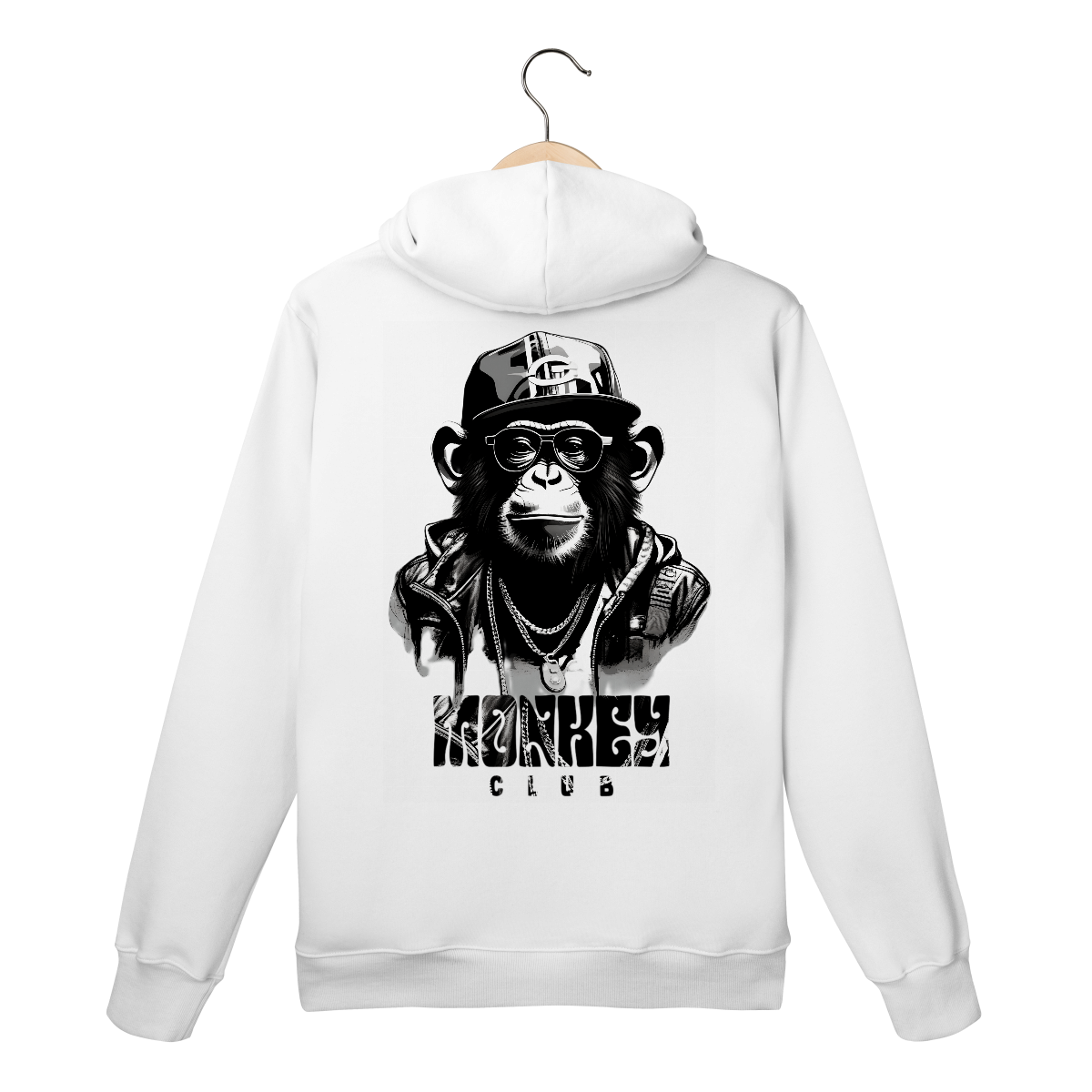 Visual preto e branco direto ao ponto. Macaco com boné e correntes, estilo pôster de filme antigo.