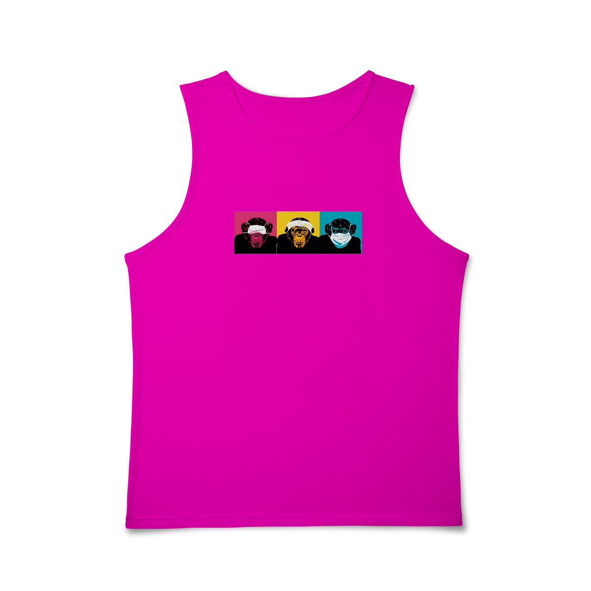 Releitura dos três macacos da sabedoria com máscara, em cores vivas e traço limpo.
