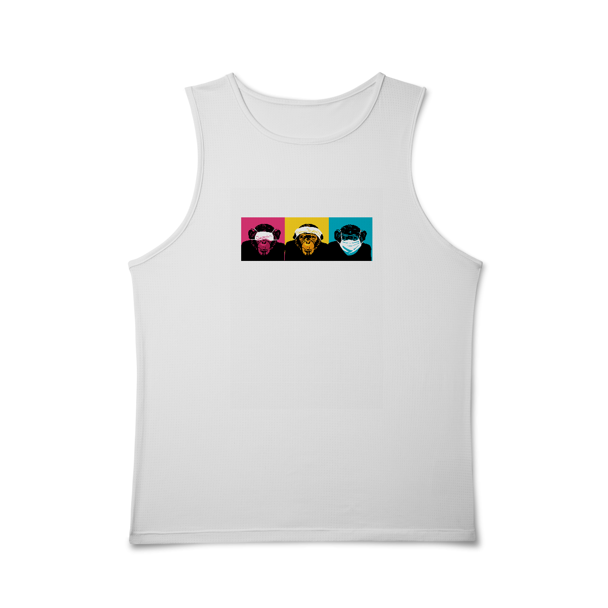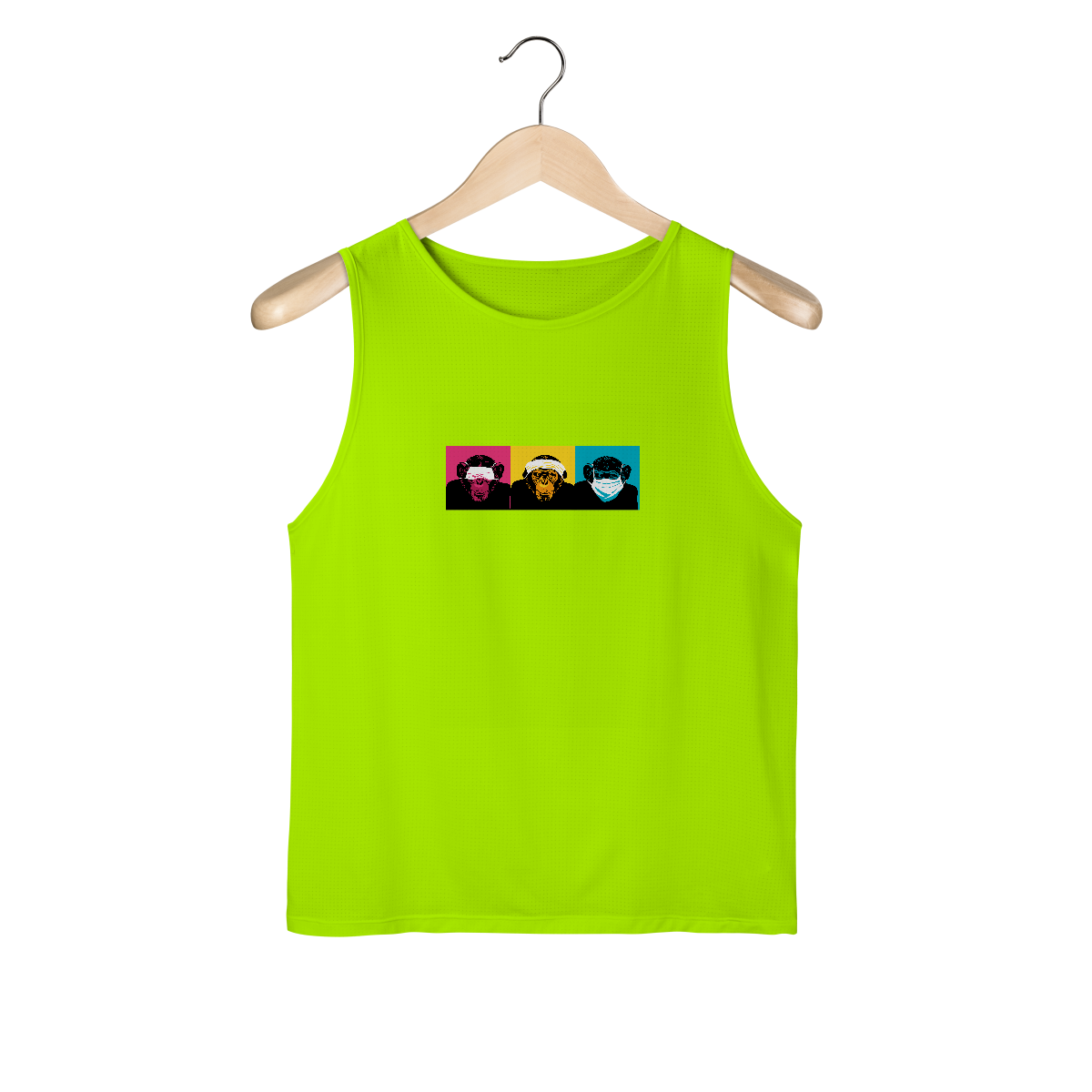 Releitura dos três macacos da sabedoria com máscara, em cores vivas e traço limpo.