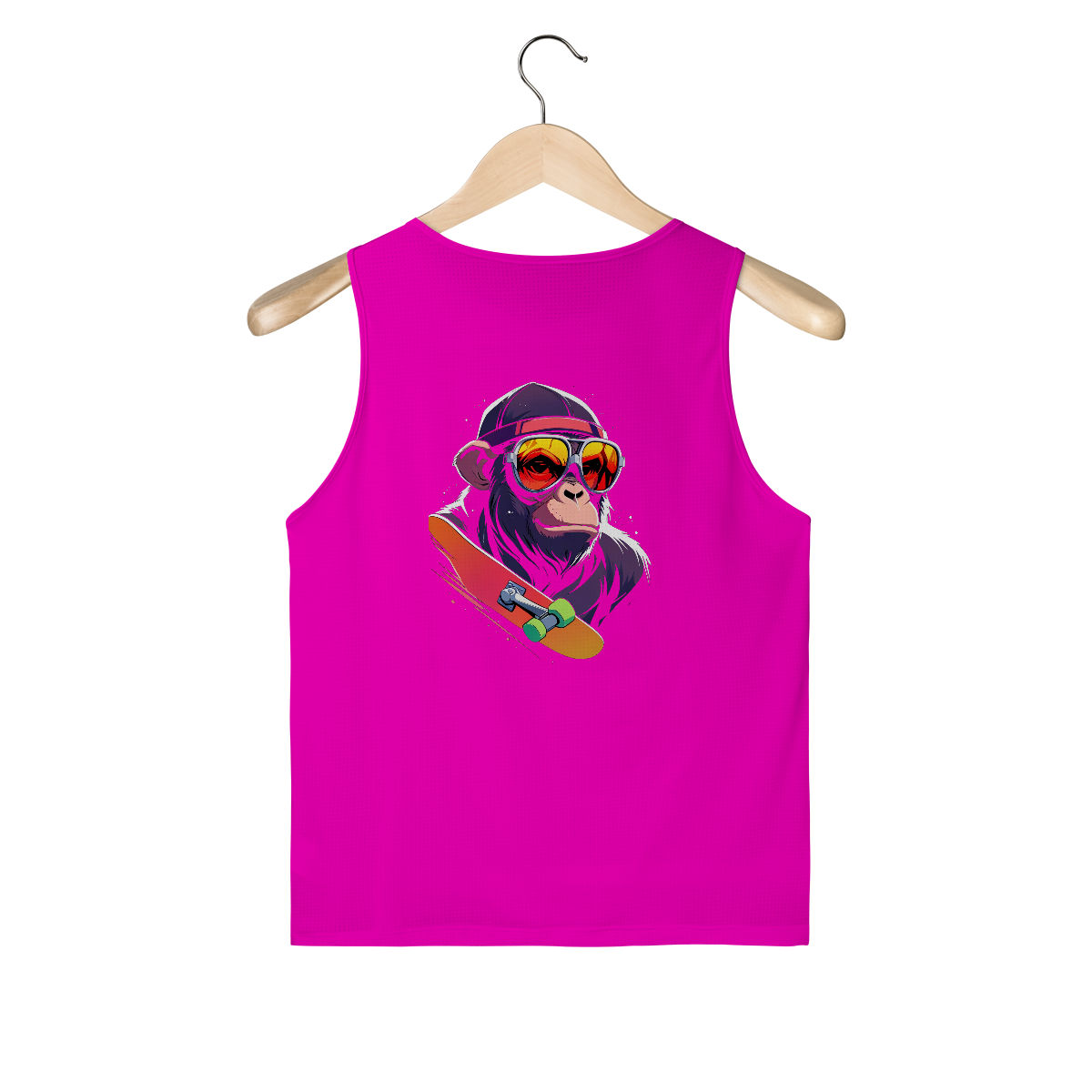 Macaco com óculos vermelhos, boné e skate em destaque. Estilo direto, sem excesso.