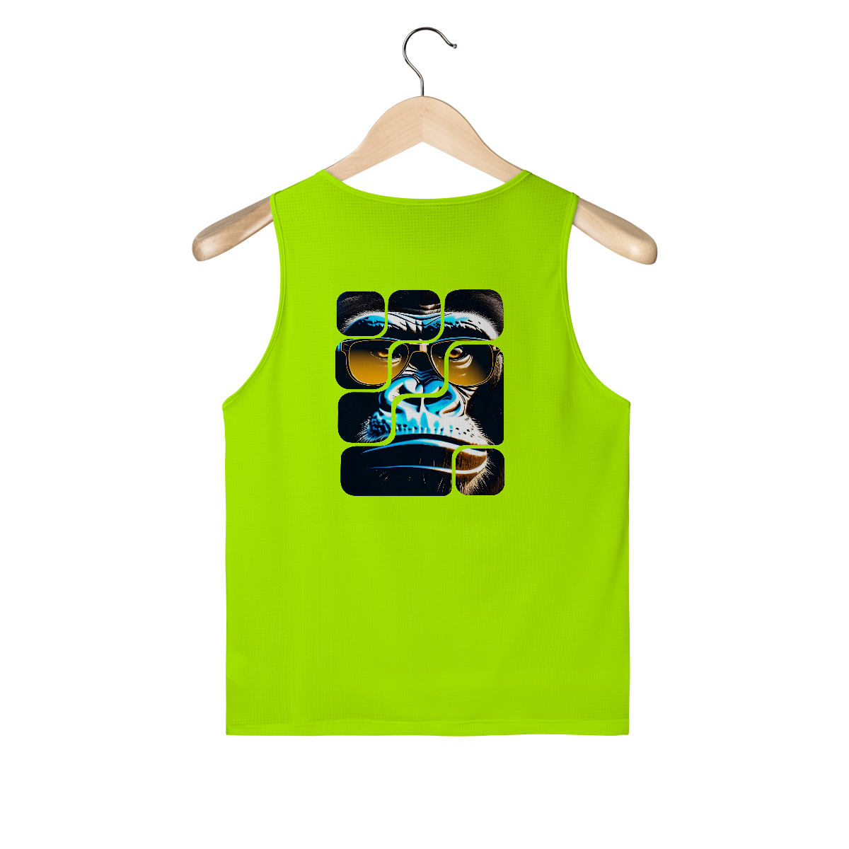 Biggie traz uma arte em blocos que fragmenta o rosto do gorila em tons de neon e amarelo.