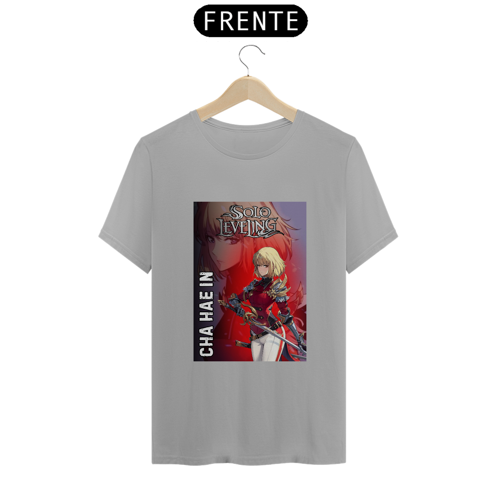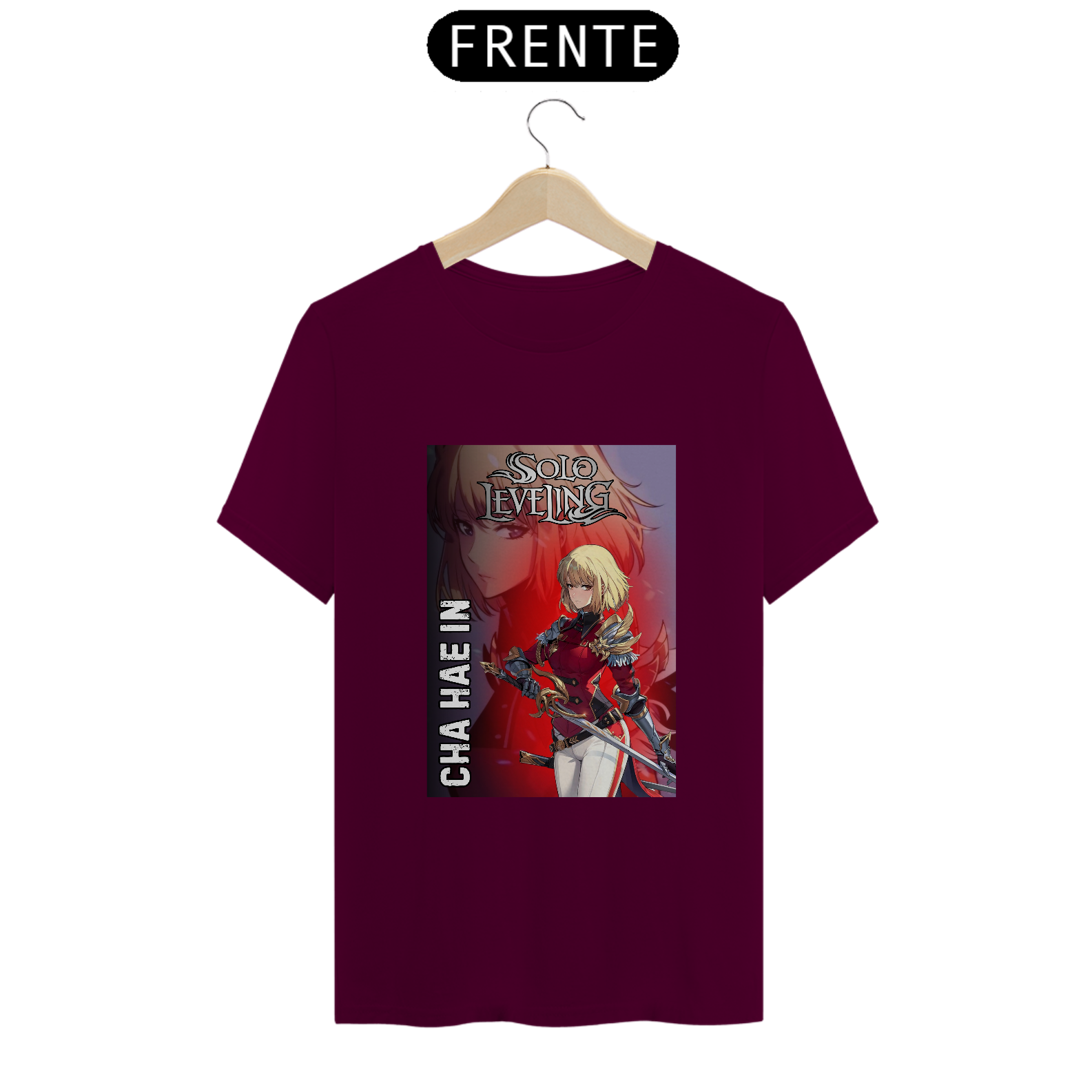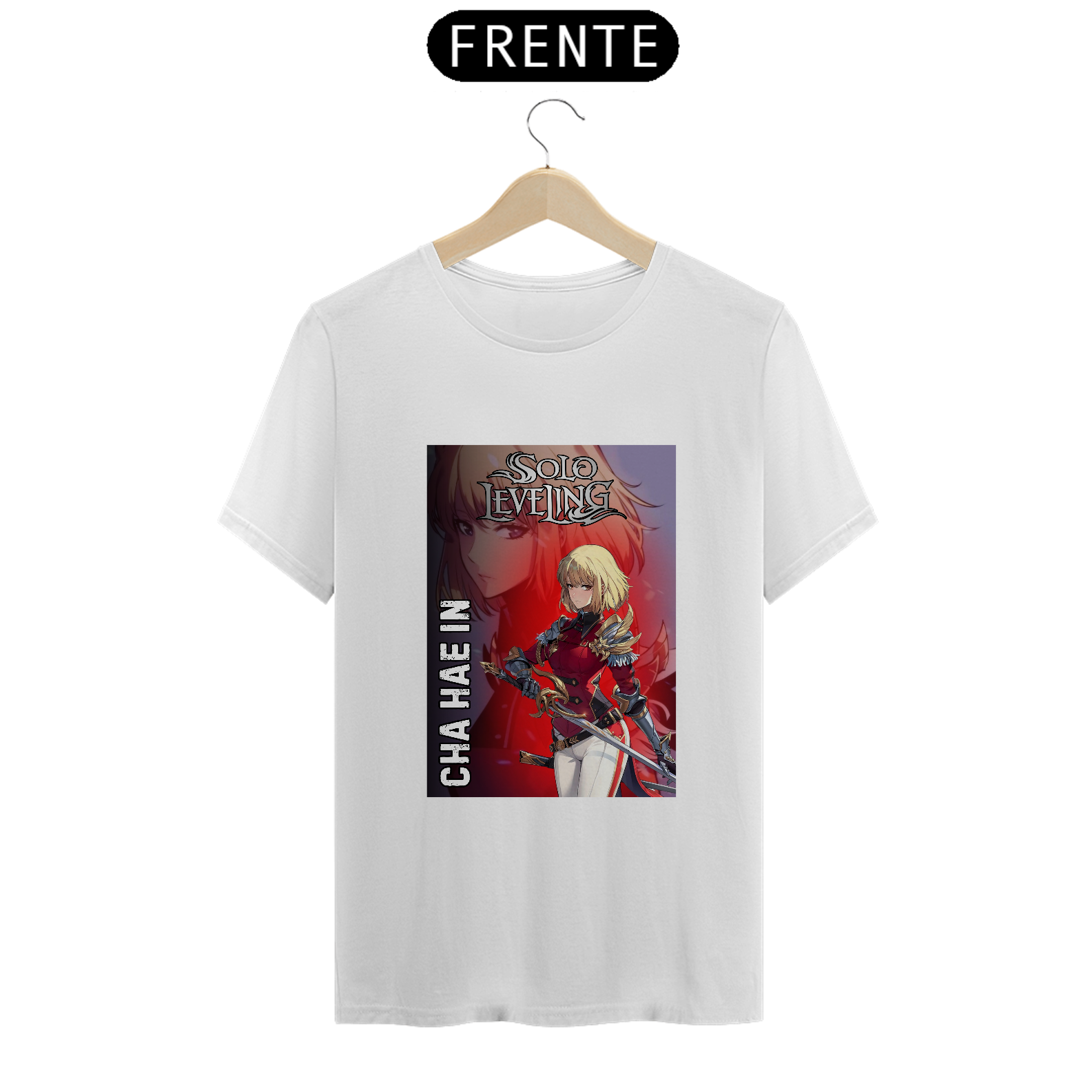 A T-Shirt Classic Cha Hae-In | Lâmina Escarlate traz a caçadora de nível S em uma arte impactante, com tons avermelhados vibrantes que destacam sua presença afiada como uma espada. Em postura de combate, olhos determinados e a aura dourada de mana ao seu redor, Hae-In representa a perfeita união entre delicadeza e força bruta.
