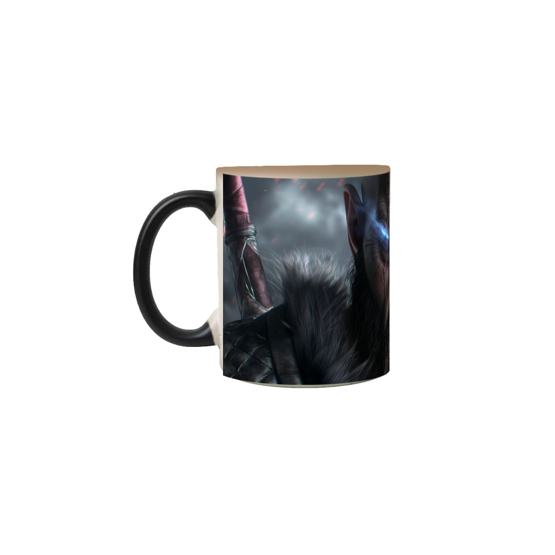 A Caneca Mágica Kratos | Deus da Guerra traz o espartano em sua fase mais imponente: barba grisalha, olhar penetrante e o machado Leviatã em mãos. Ao adicionar uma bebida quente, a arte surge com intensidade — revelando Kratos em meio à neve de Midgard, com runas brilhando e o frio cortante se desfazendo em energia ardente. Um contraste entre gelo e fogo, passado e redenção.