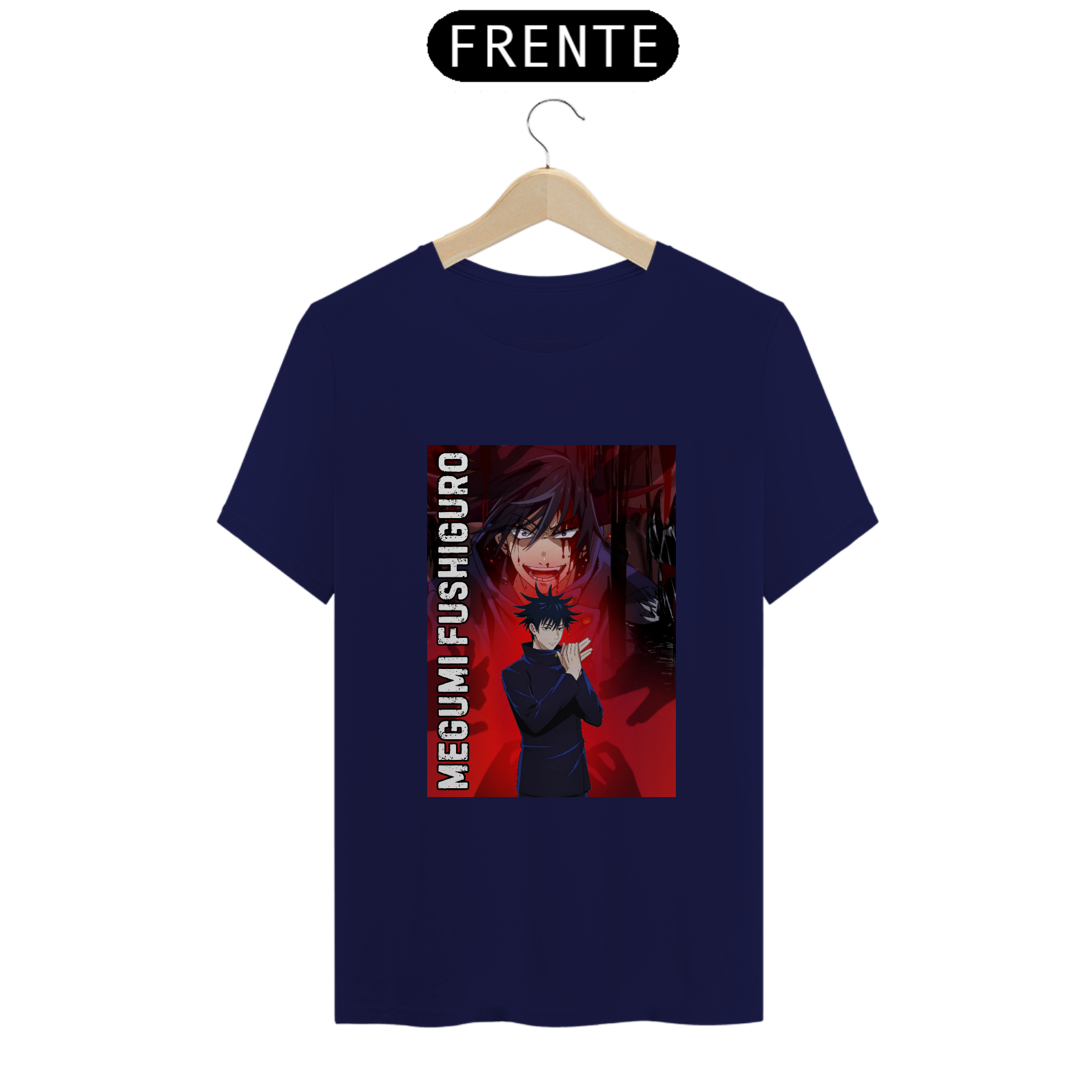 A T-Shirt Classic Megumi Fushiguro | Sombras em Movimento traz o jovem feiticeiro em pose de invocação, com as mãos prontas para liberar seus shikigamis através da técnica das Dez Sombras. A arte é envolvente, com tons escuros, sombras dançantes ao fundo e toques de azul profundo que destacam sua energia amaldiçoada controlada com precisão.
