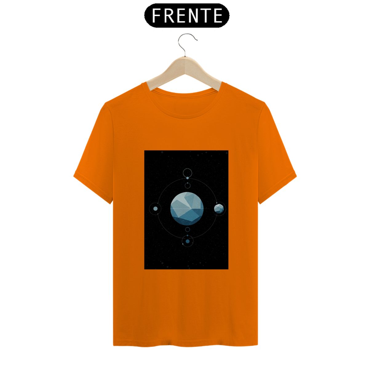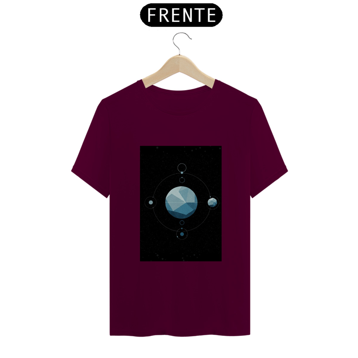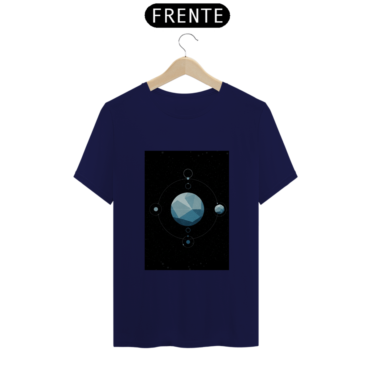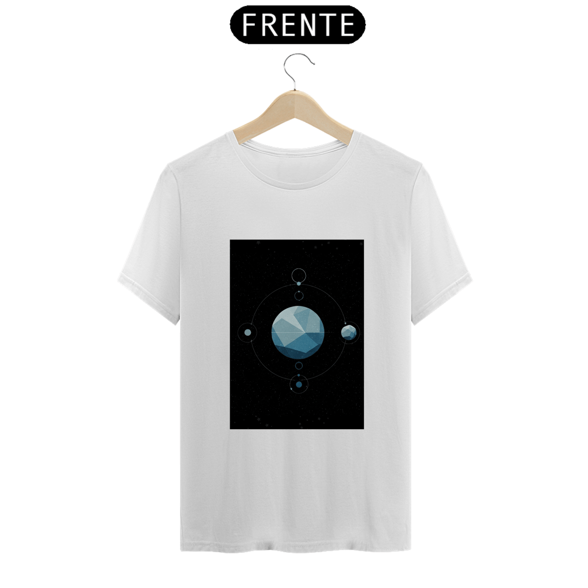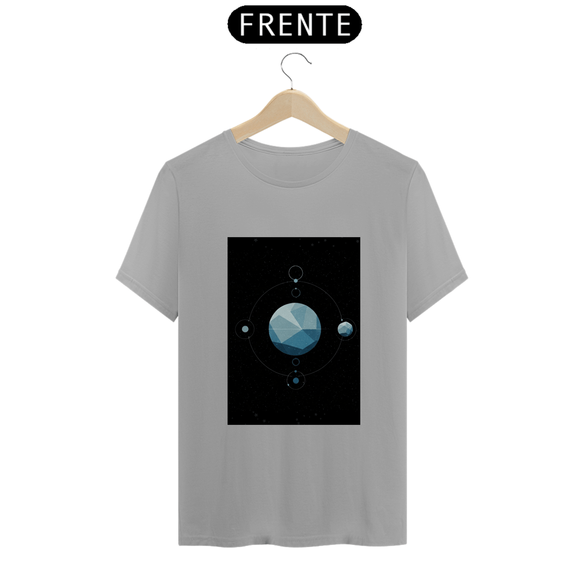 A T-Shirt Classic Sistema Prisma apresenta uma composição cósmica única: um planeta facetado como um cristal flutuando no vazio espacial, rodeado por satélites, luas e traços orbitais. Uma obra minimalista e mística que une ciência, arte e mistério em uma só peça.