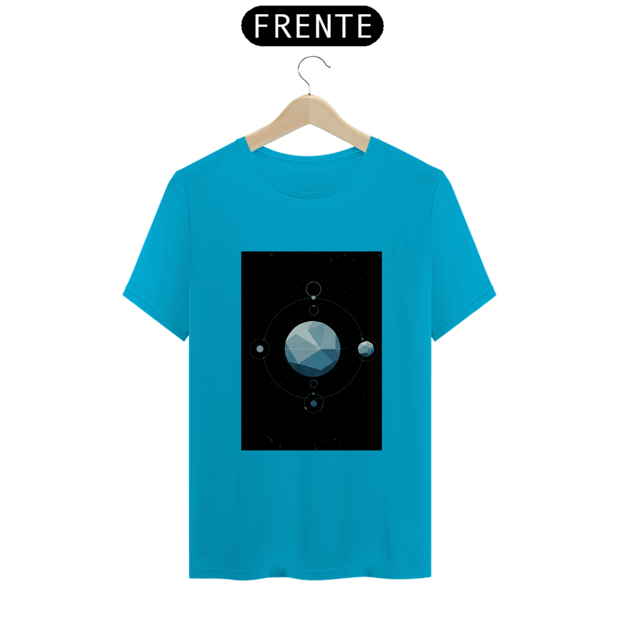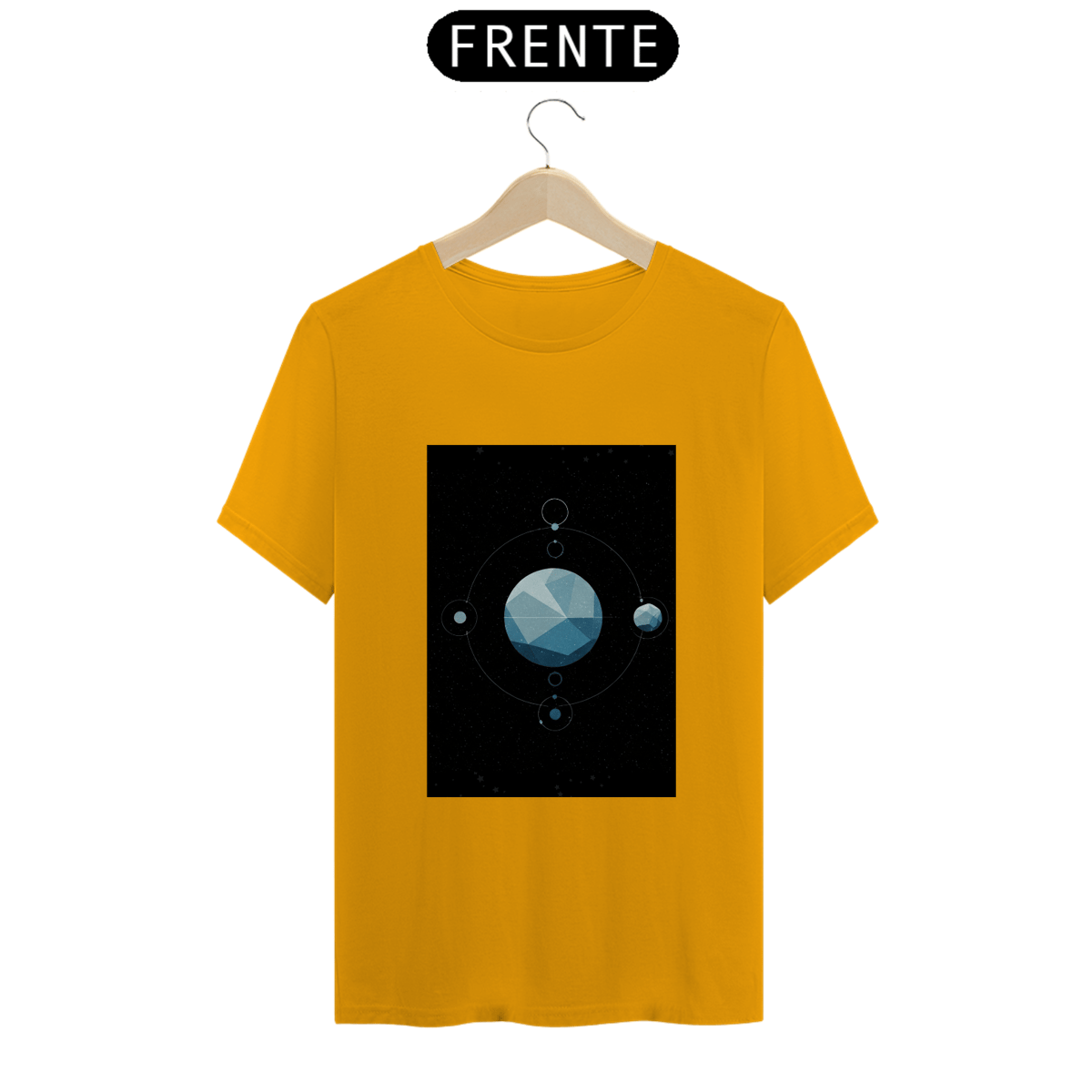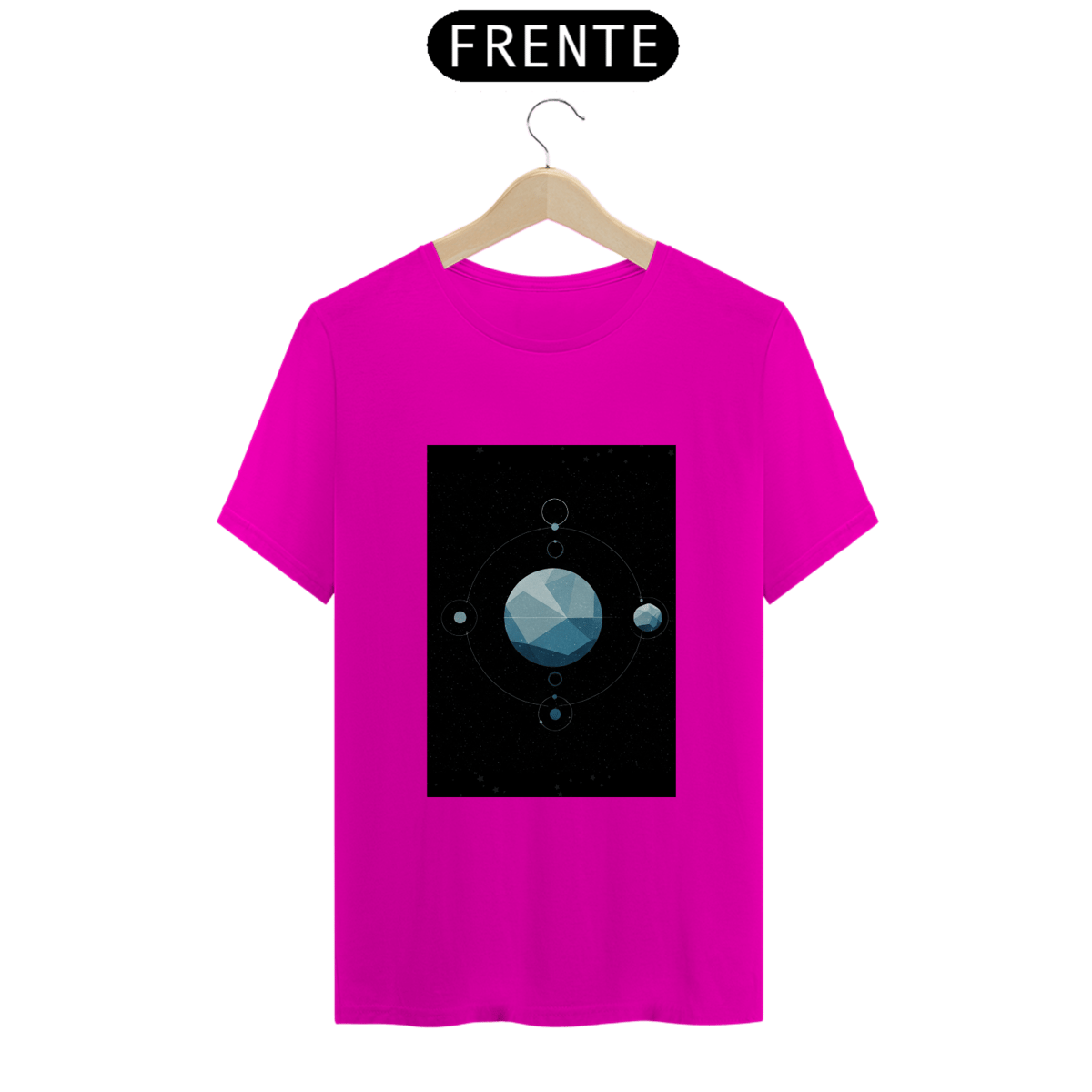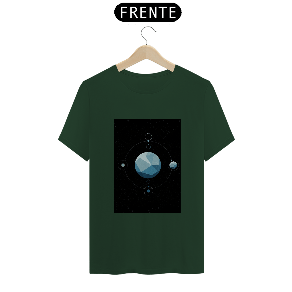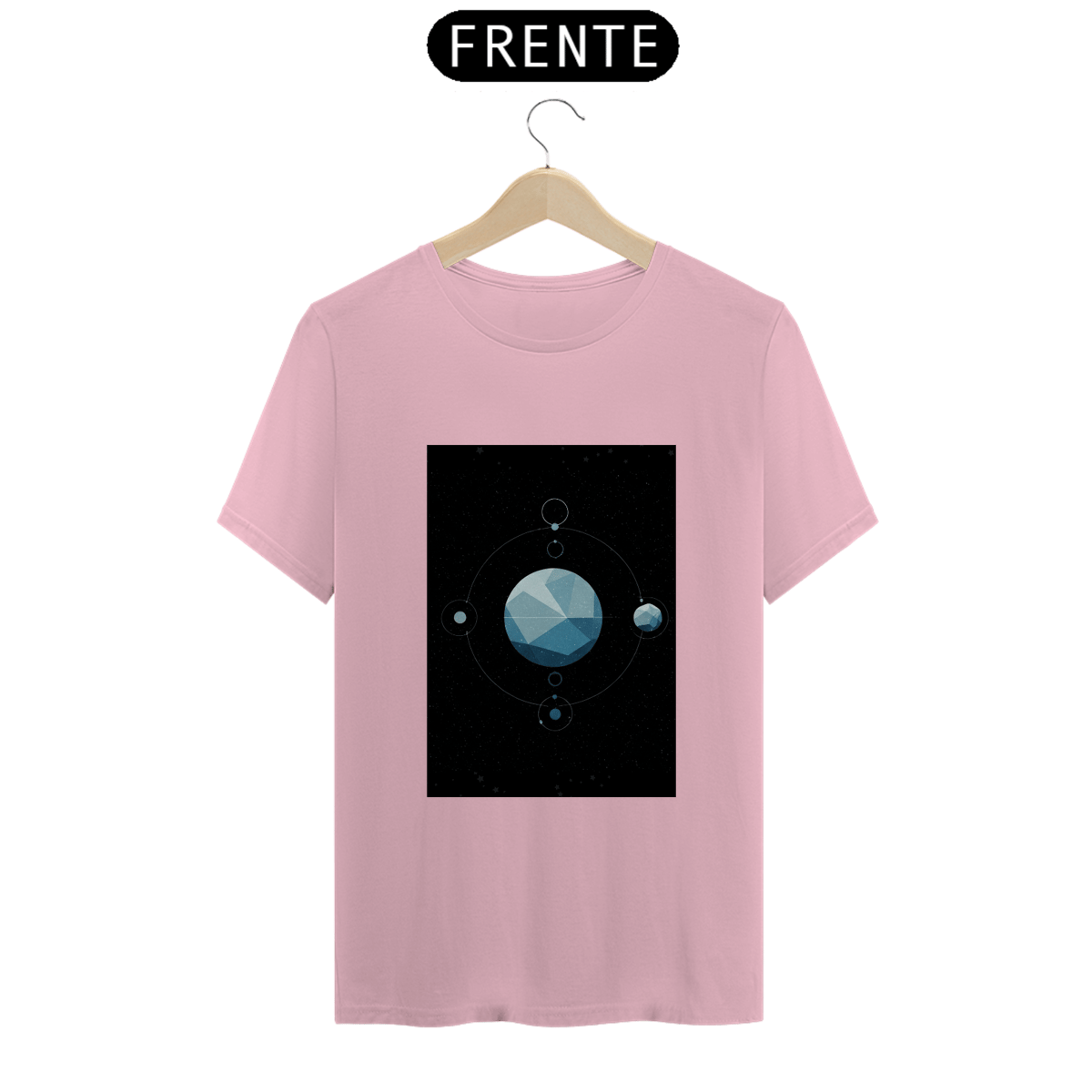 A T-Shirt Classic Sistema Prisma apresenta uma composição cósmica única: um planeta facetado como um cristal flutuando no vazio espacial, rodeado por satélites, luas e traços orbitais. Uma obra minimalista e mística que une ciência, arte e mistério em uma só peça.