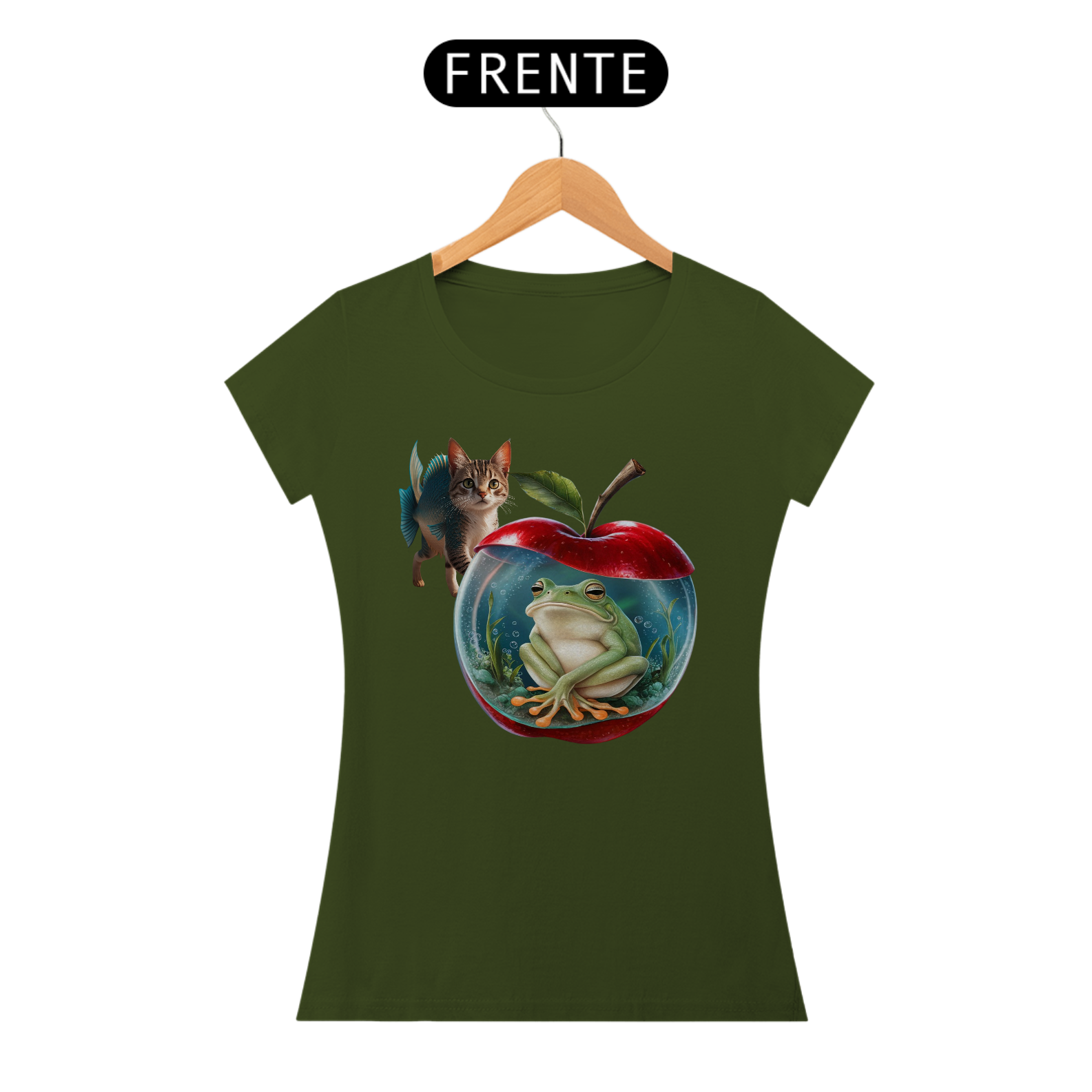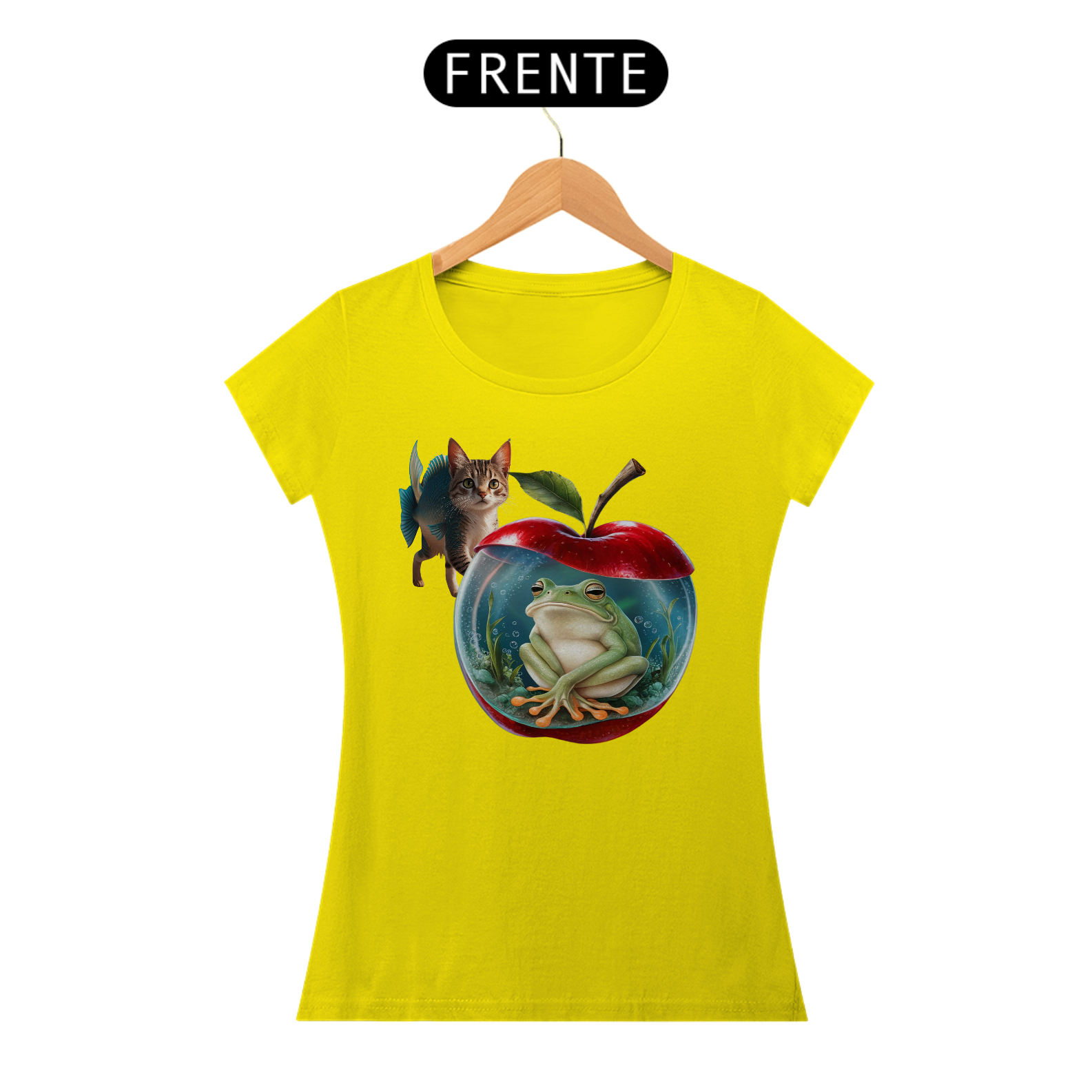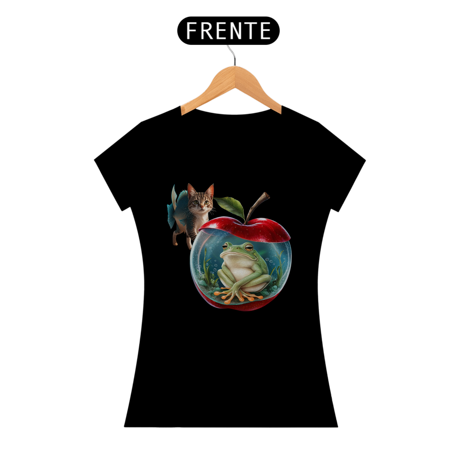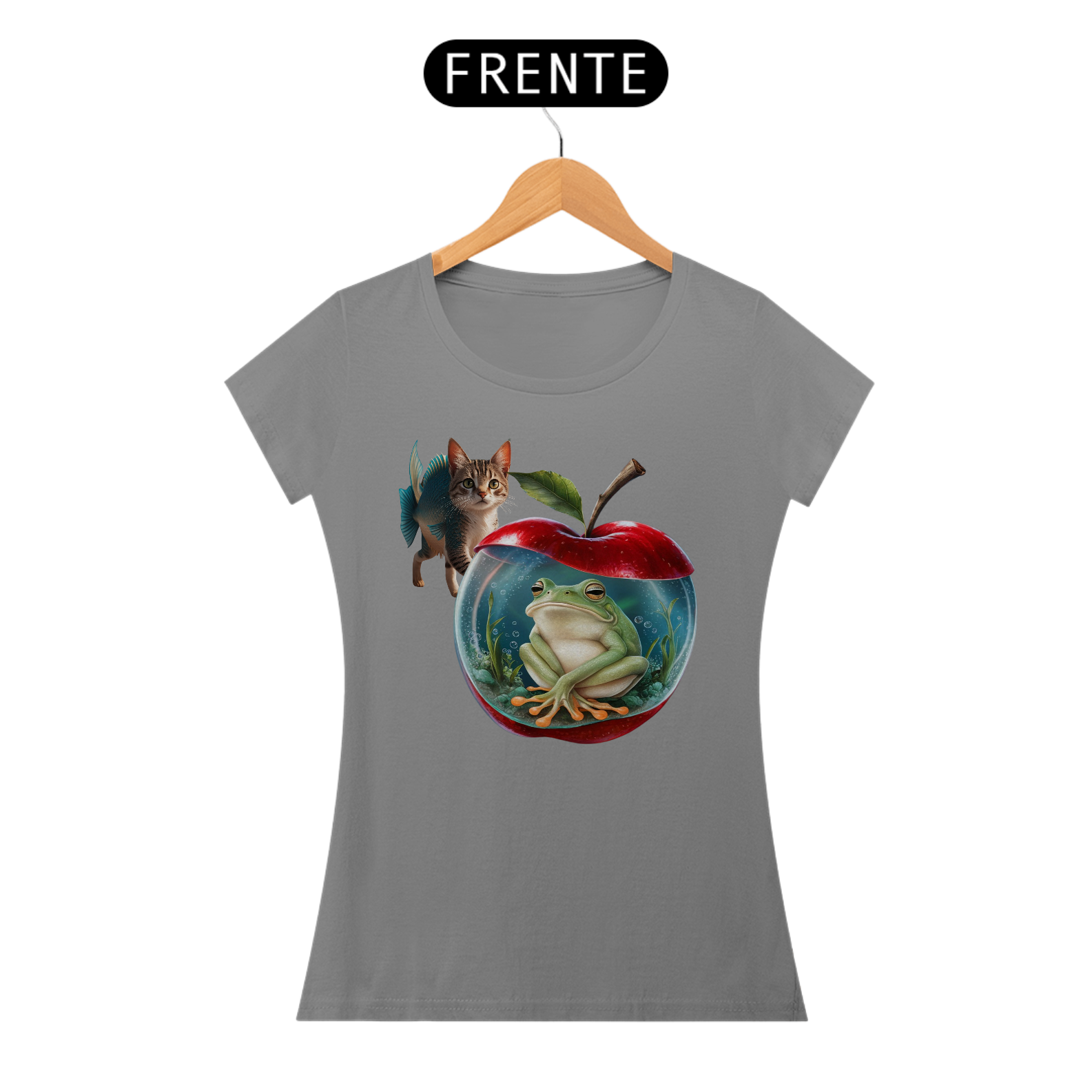 CAMISETA FEMININA ESTAMPA DE MAÇÃ COM SAPO DENTRO, MATERIAL DE QUALIDADE, CONFORTAVEL.