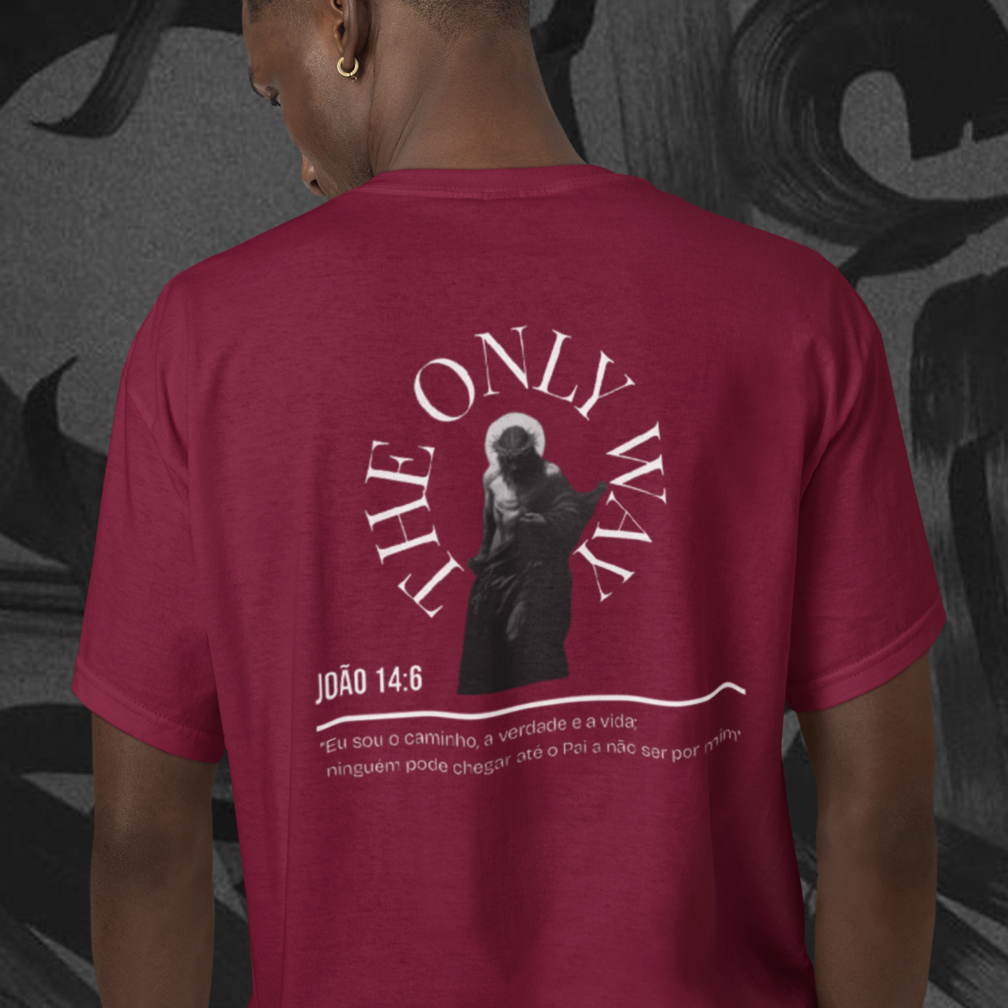 Camiseta inspirada na passagem bíblica de João 14:16, possui uma estampa com Jesus centralizado com um frase em ingles, "The only way", com a tradução sendo "o único caminho, deixando a entender que somente Crsito pode nos levar ao pai.