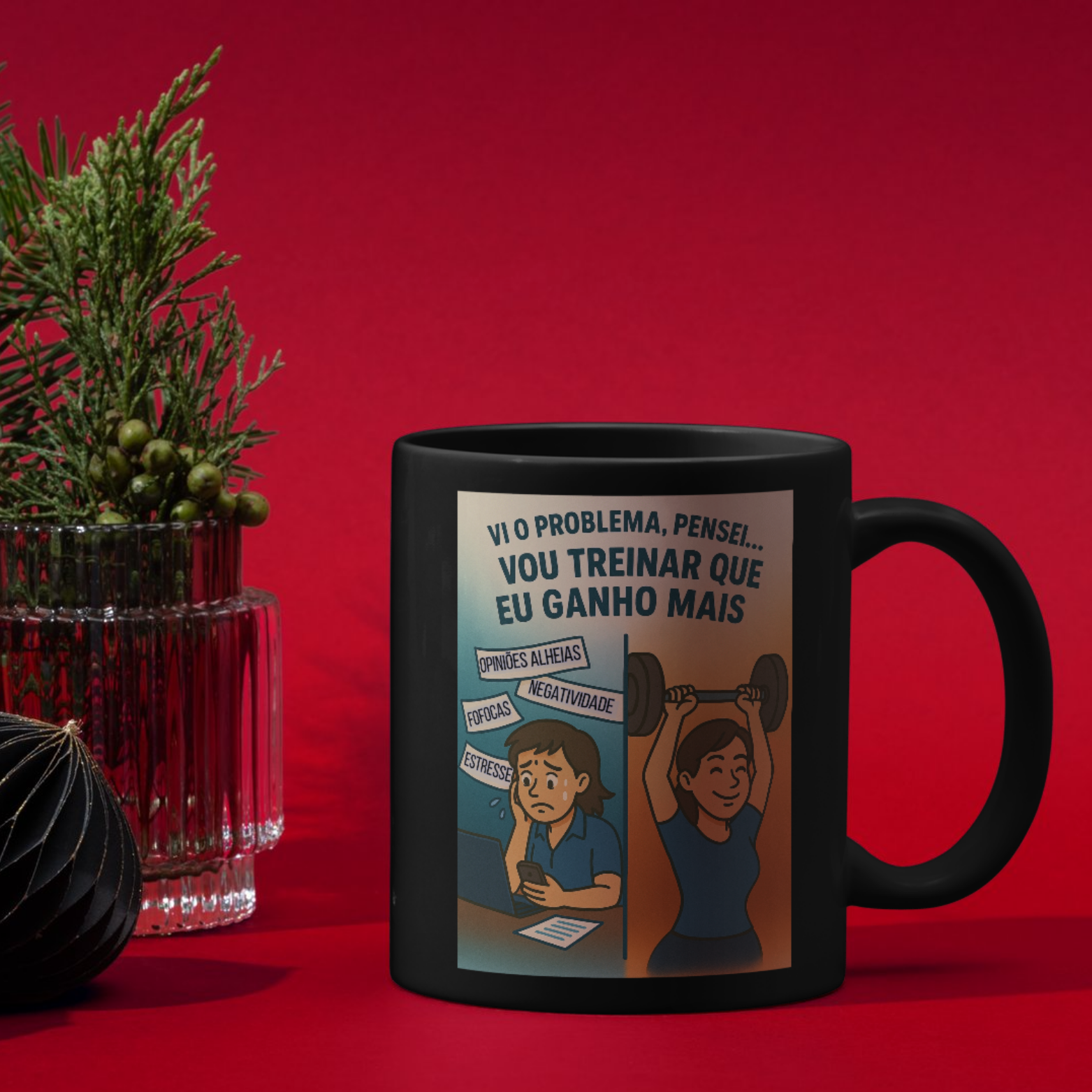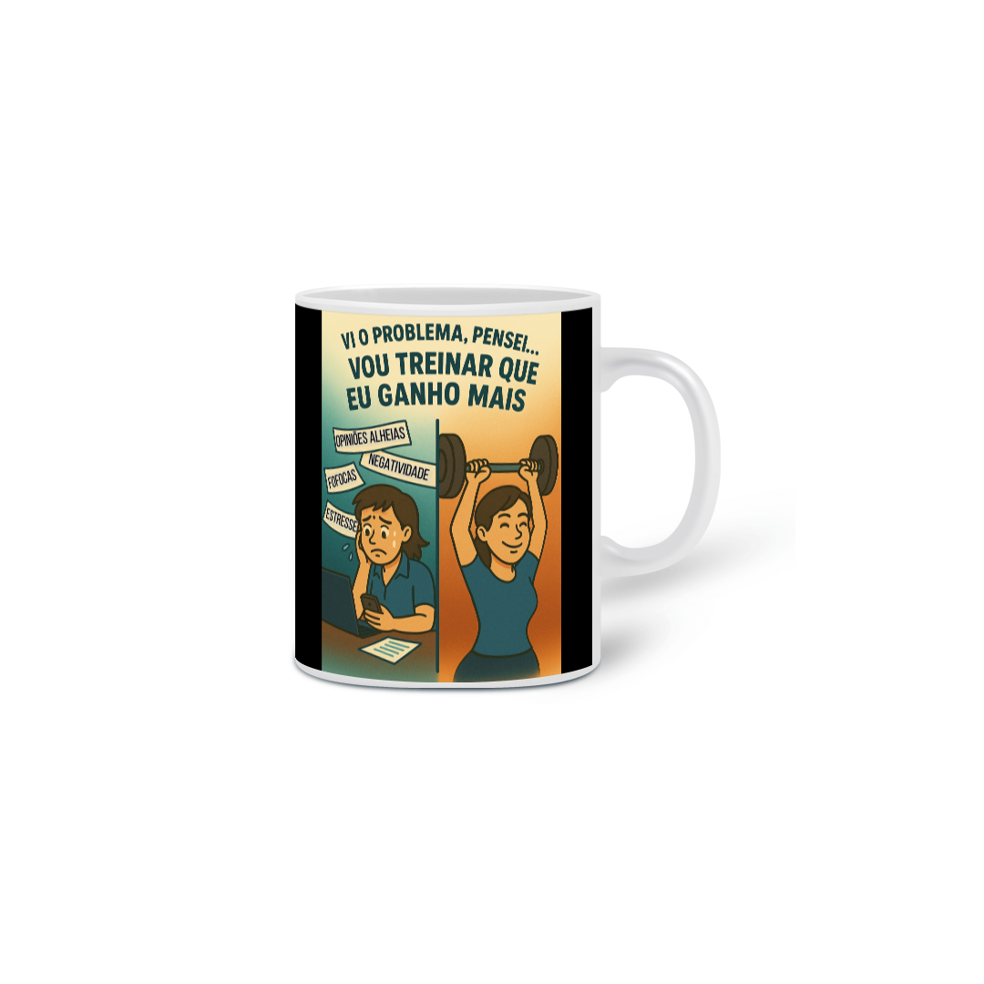 Problema vem, pensamento voa… mas quem treina, resolve. Essa caneca é pra mulheres que entenderam que nada supera o poder de um treino focado quando a cabeça tenta sabotar.