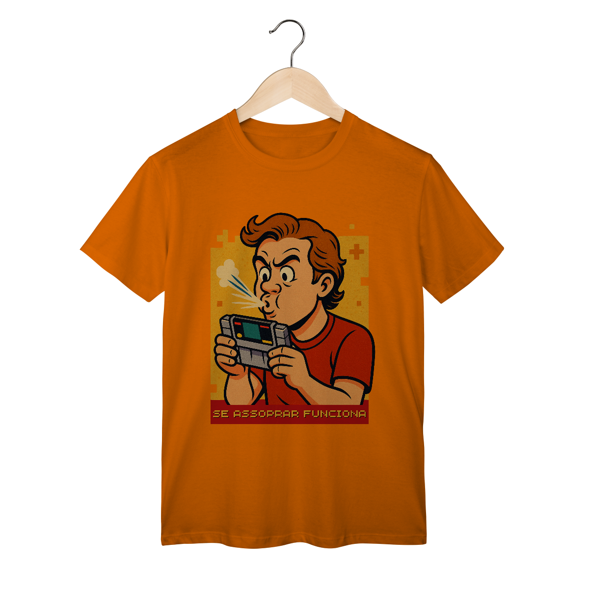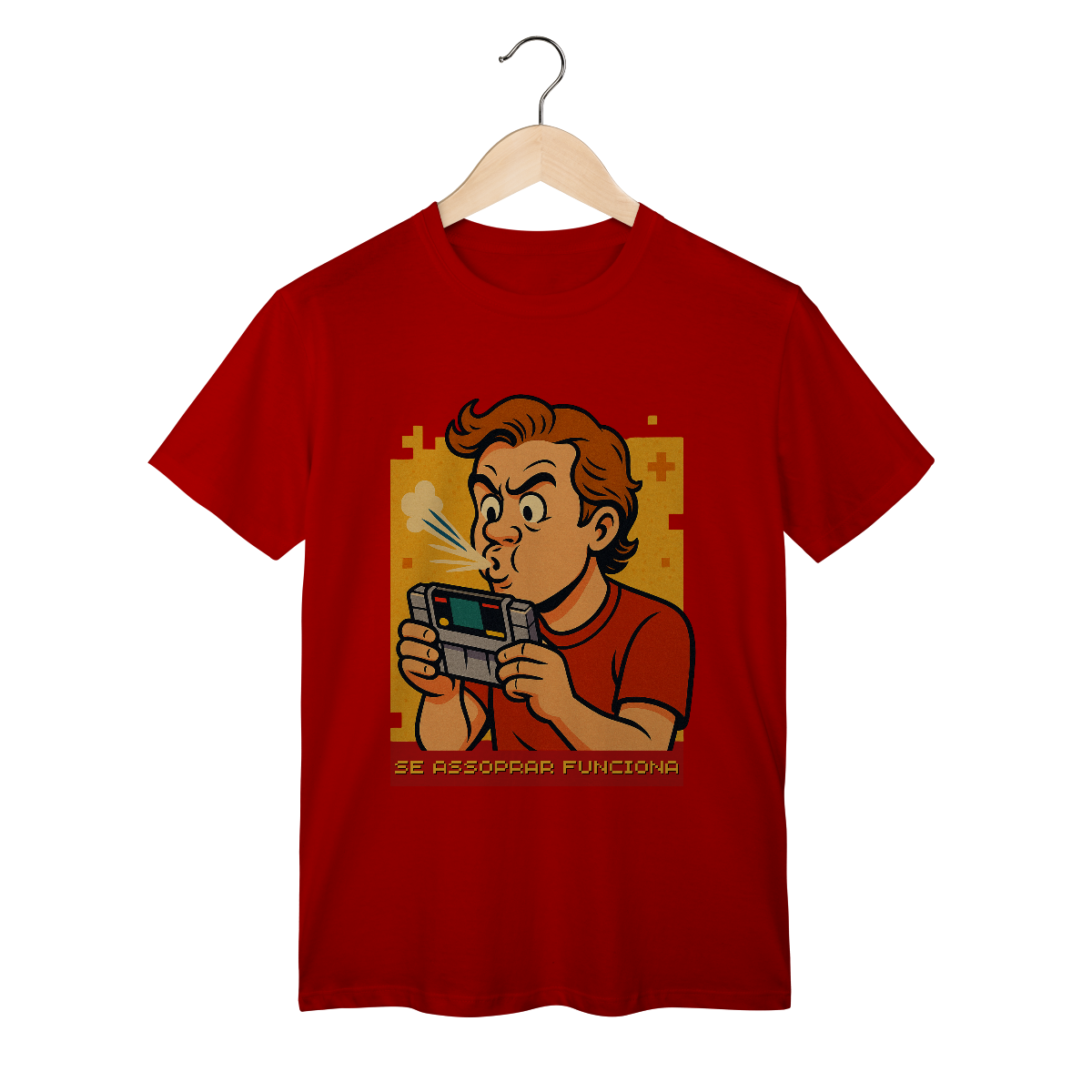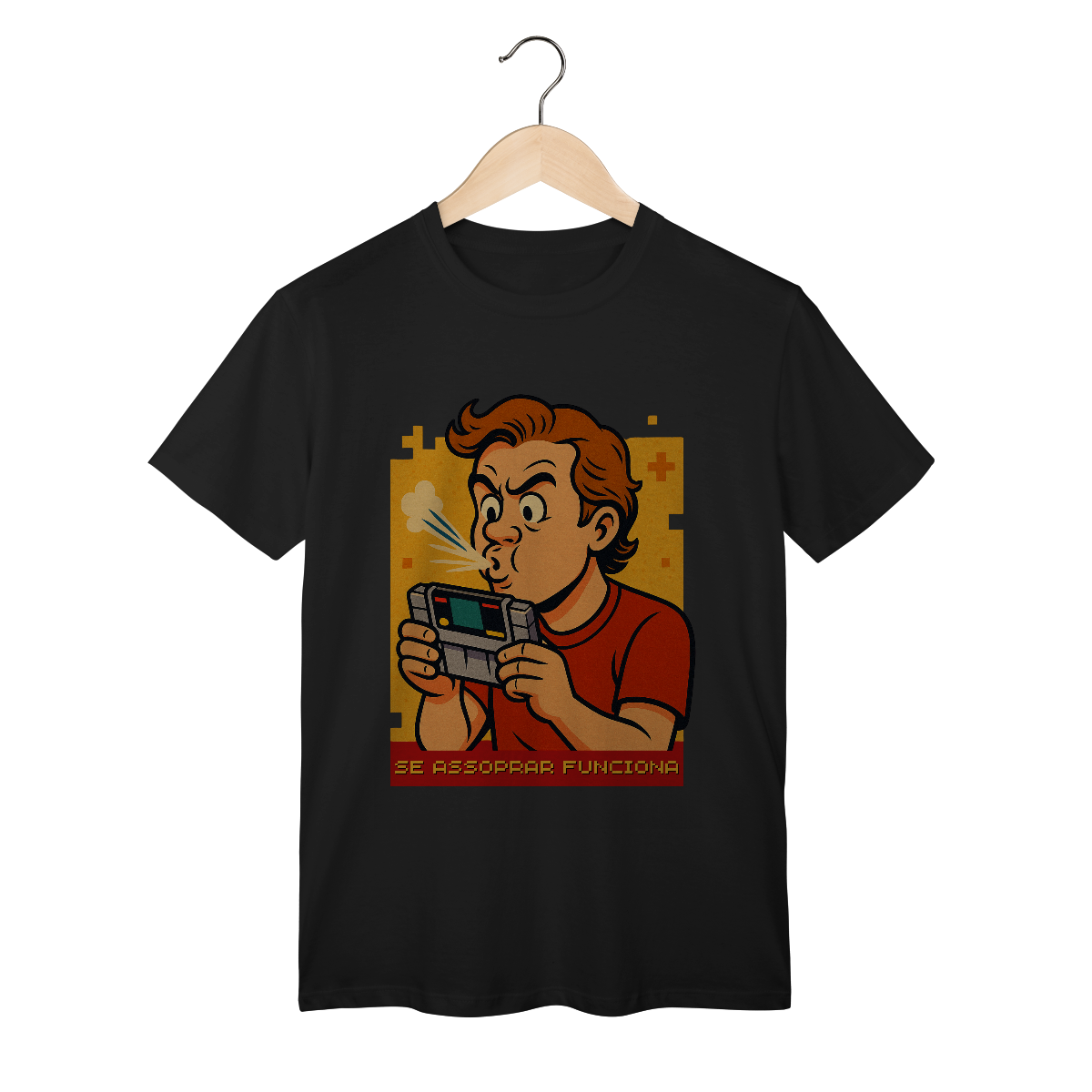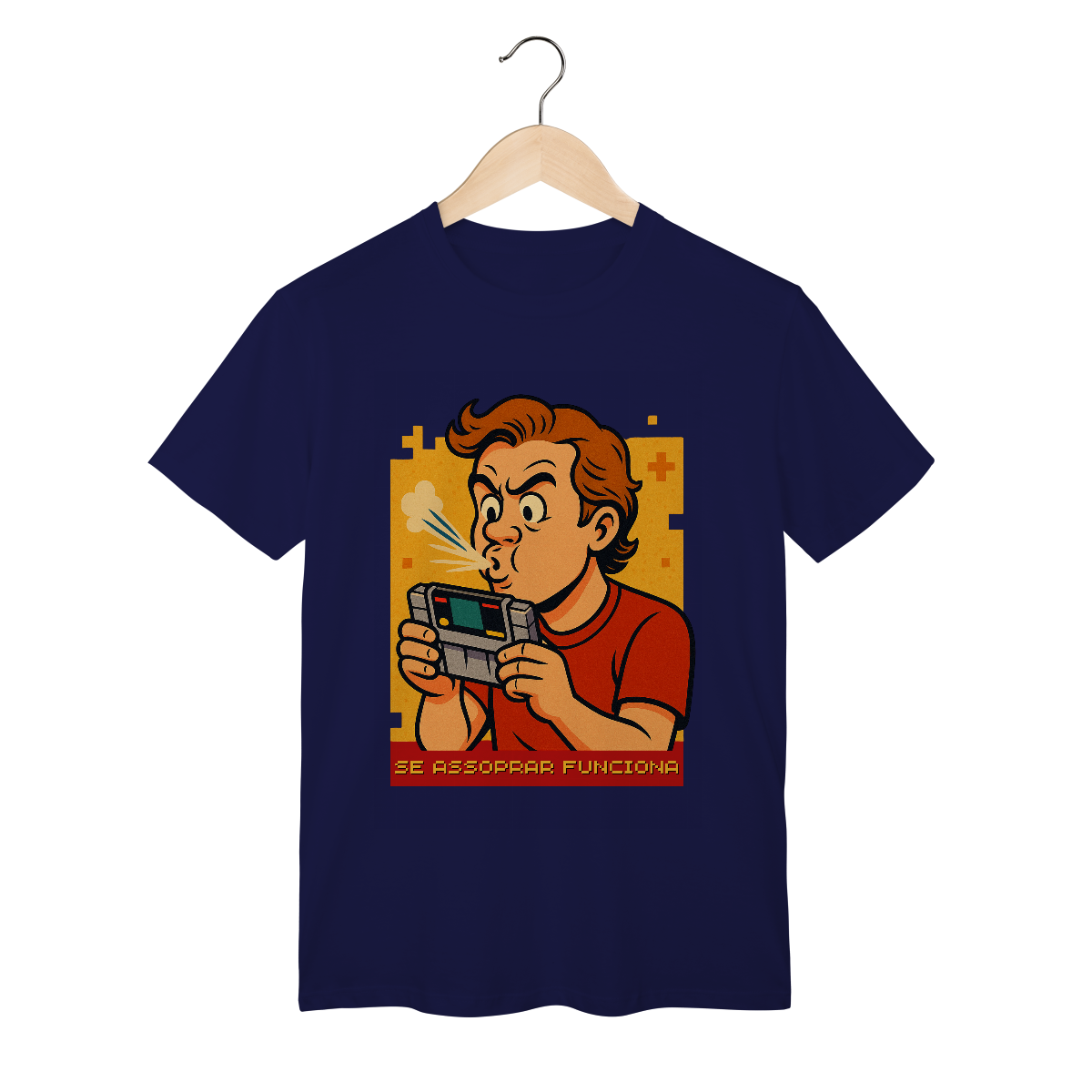 Com visual retrô, ilustração nostálgica e aquele toque de ironia nerd que só quem viveu sabe, ela é mais do que uma estampa — é um grito de guerra pra quem cresceu entre controles com fio, TV de tubo e consoles que só pegavam no amor (e no bafo quente).
