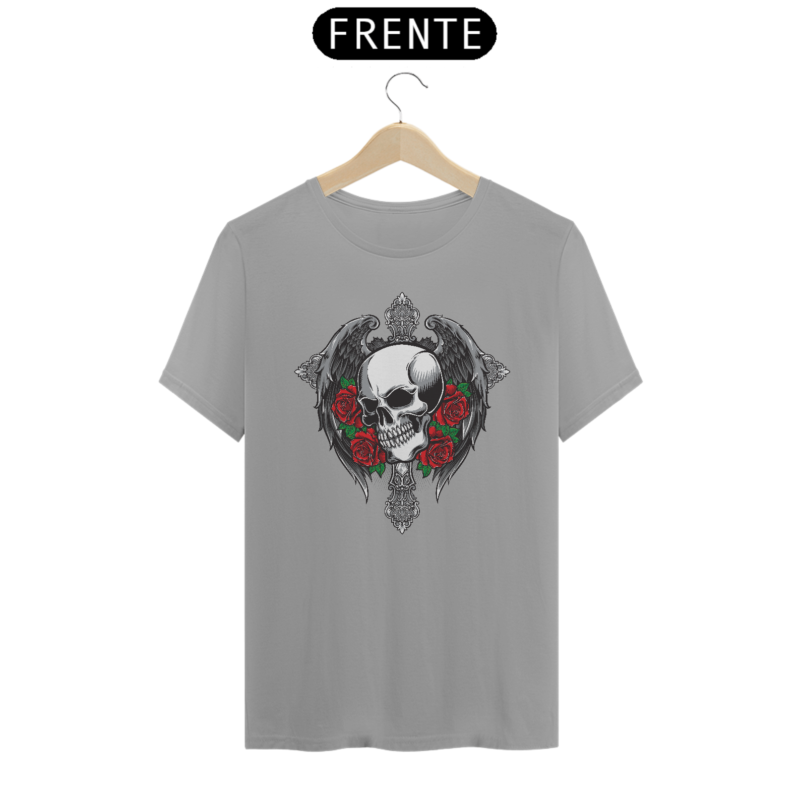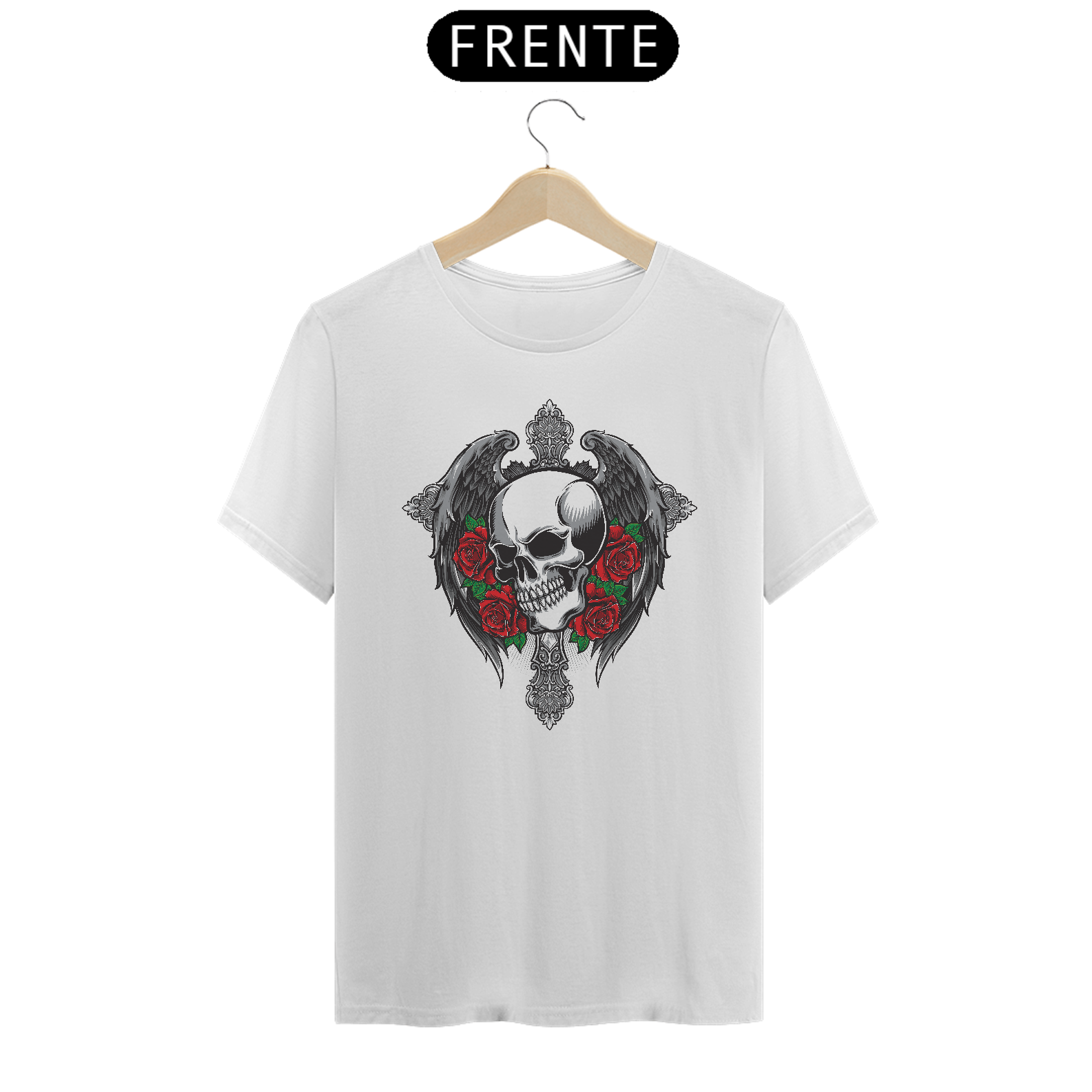 Explore sua estética gótica com nossa camiseta exclusiva! Apresentando um crânio elegante adornado com asas etéreas e rosas sombrias. Este design transmite uma fusão única entre o macabro e a beleza, capturando a essência do estilo gótico. Confeccionada com qualidade premium, esta camiseta é uma expressão ousada da sua individualidade. Vista-se com sofisticação e mistério, destacando-se na multidão. Adquira a sua agora e abrace o lado obscuro da moda!