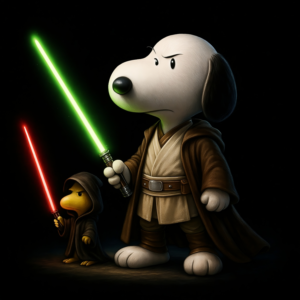 Snoopy assume a postura de um sábio Jedi, portando seu sabre de luz verde, enquanto Woodstock revela seu lado sombrio como um pequeno Sith, empunhando um sabre vermelho. A estampa simboliza o equilíbrio entre luz e escuridão, coragem e tentação — perfeita para fãs que vivem a Força em todas as formas.