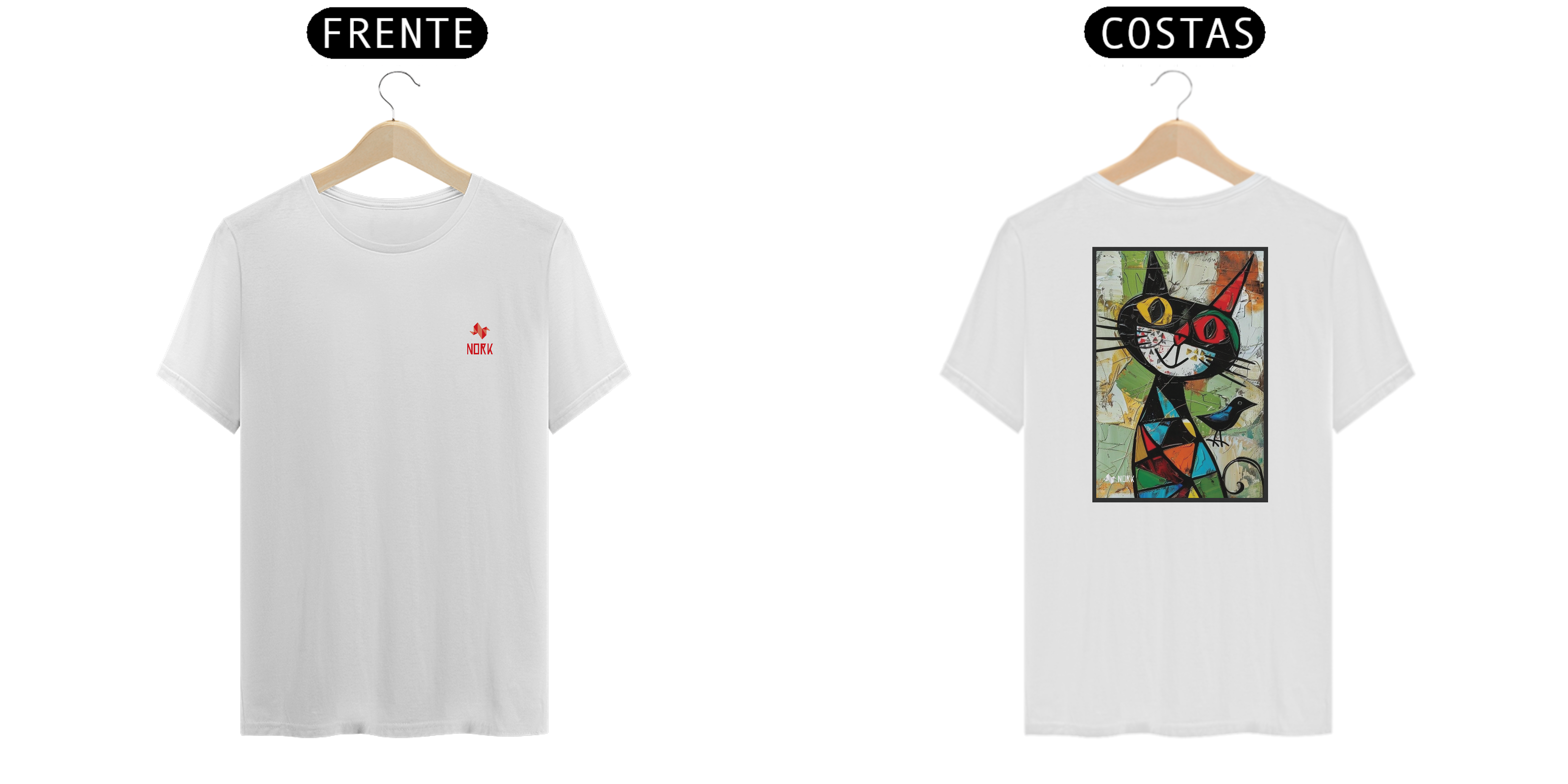 Esta camisa da Coleção Nork Animal Planet apresenta um design criativo e vibrante com um gato estilizado em formas geométricas e cores vivas. O gato, em preto dominante, é composto por mosaicos coloridos em tons de vermelho, azul, amarelo e verde, que se contrastam com o fundo texturizado em tons de verde e bege. A presença de um pássaro azul delicadamente posicionado ao lado do gato adiciona um toque lúdico e simbólico à arte. A combinação de formas abstratas e elementos figurativos cria uma peça que transmite alegria, criatividade e um charme único.