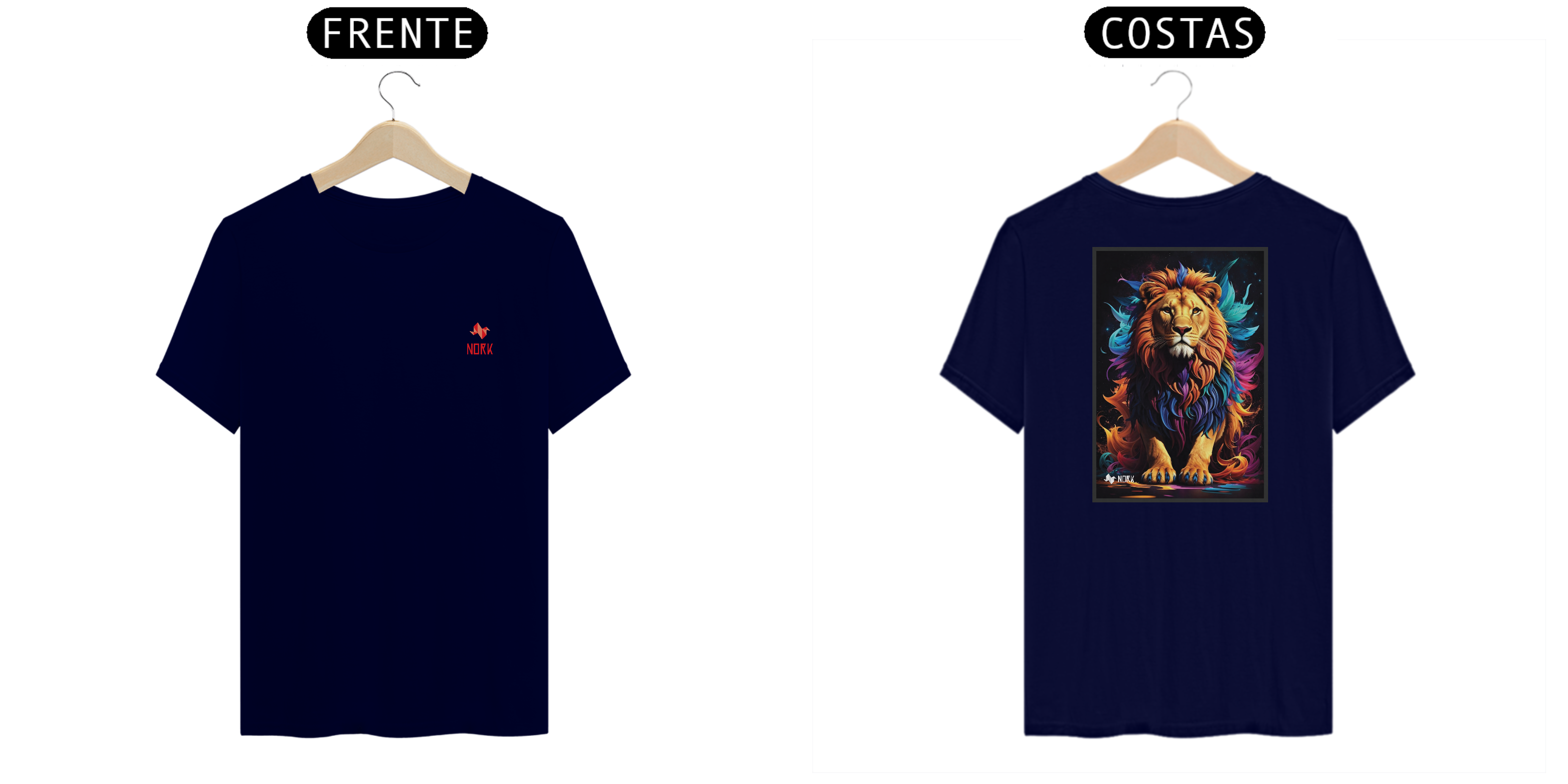 Esta peça imponente da Coleção Nork Animal Planet traz a figura de um majestoso leão com uma juba impressionante composta por um gradiente de cores vibrantes, como laranja, azul, roxo e rosa. O design mistura realismo com fantasia, enquanto o fundo escuro, pontuado por estrelas e nebulosas, reforça o aspecto celestial e poderoso do leão. A combinação de cores e o olhar intenso do animal transmitem força, nobreza e uma energia quase sobrenatural, tornando esta camisa uma verdadeira obra de arte para vestir.
