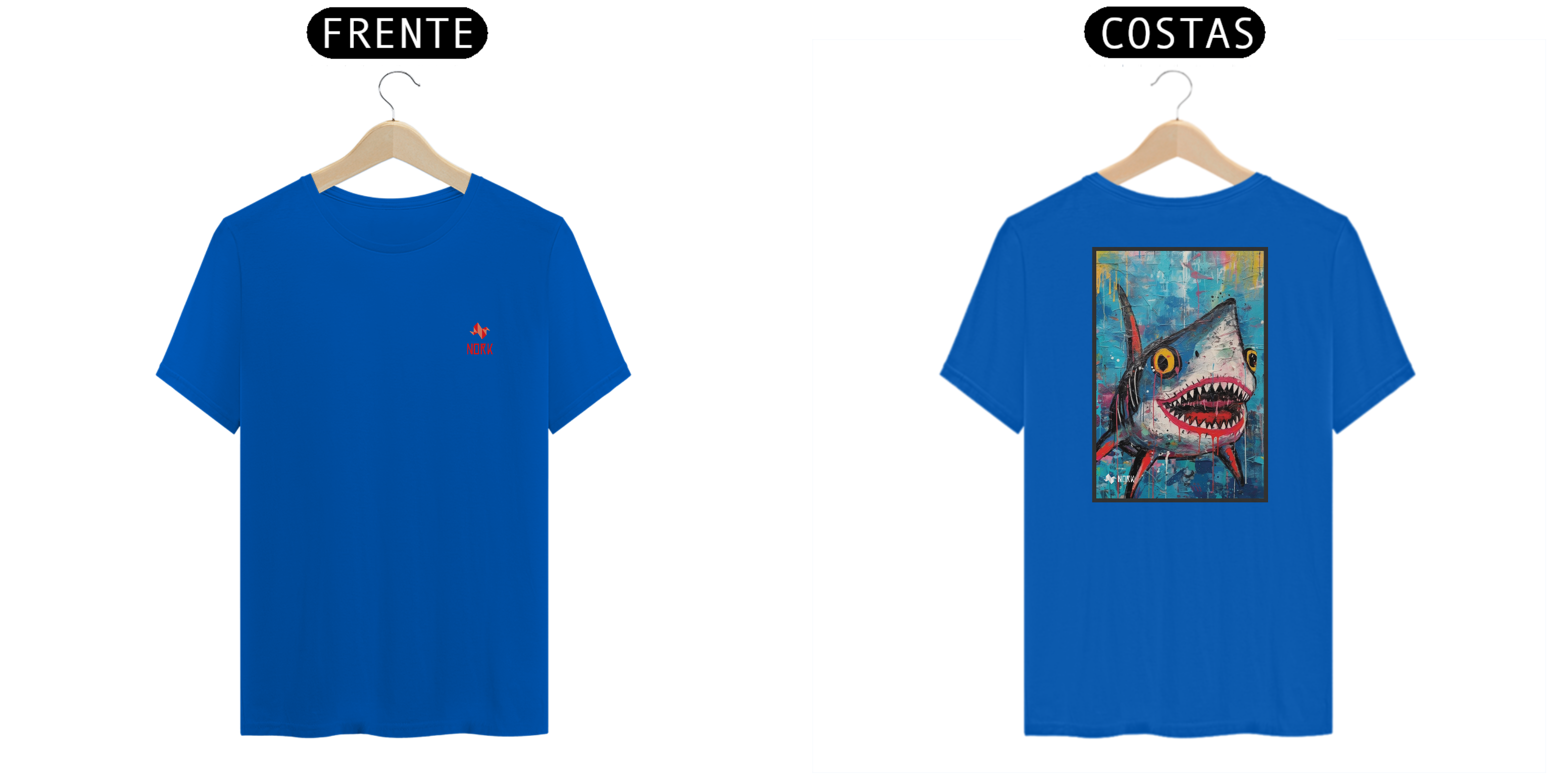 Esta camisa vibrante da Coleção Nork Animal Planet apresenta um tubarão estilizado e irreverente, retratado em um estilo de arte moderna com cores intensas e traços abstratos. A figura do tubarão, com olhos amarelos expressivos e dentes afiados destacados por respingos de tinta vermelha, transmite energia e atitude. O fundo azul, texturizado com pinceladas soltas e manchas coloridas, cria um cenário dinâmico que evoca o oceano de forma criativa e divertida. Esta peça é perfeita para quem busca ousadia e originalidade no estilo.