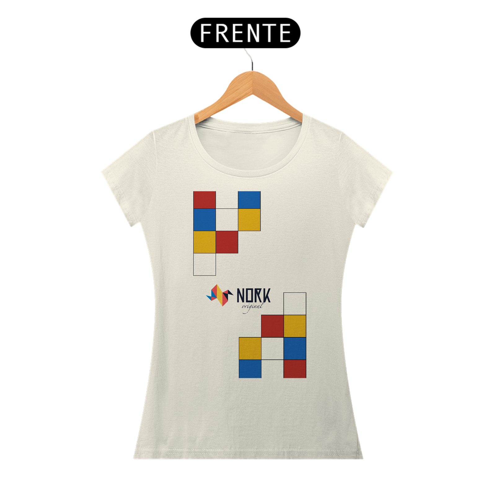 A disposição dos blocos sugere modularidade e movimento, lembrando estruturas lúdicas que combinam forma e cor de maneira instigante. Perfeita para quem busca simplicidade elegante e personalidade, esta peça leva a essência Bauhaus de maneira marcante, destacando a assinatura Nork Original no centro da composição.