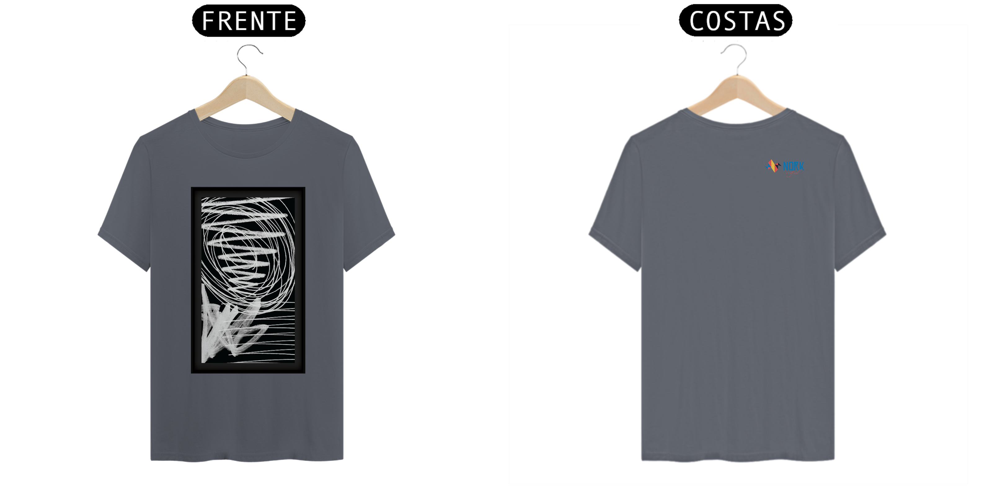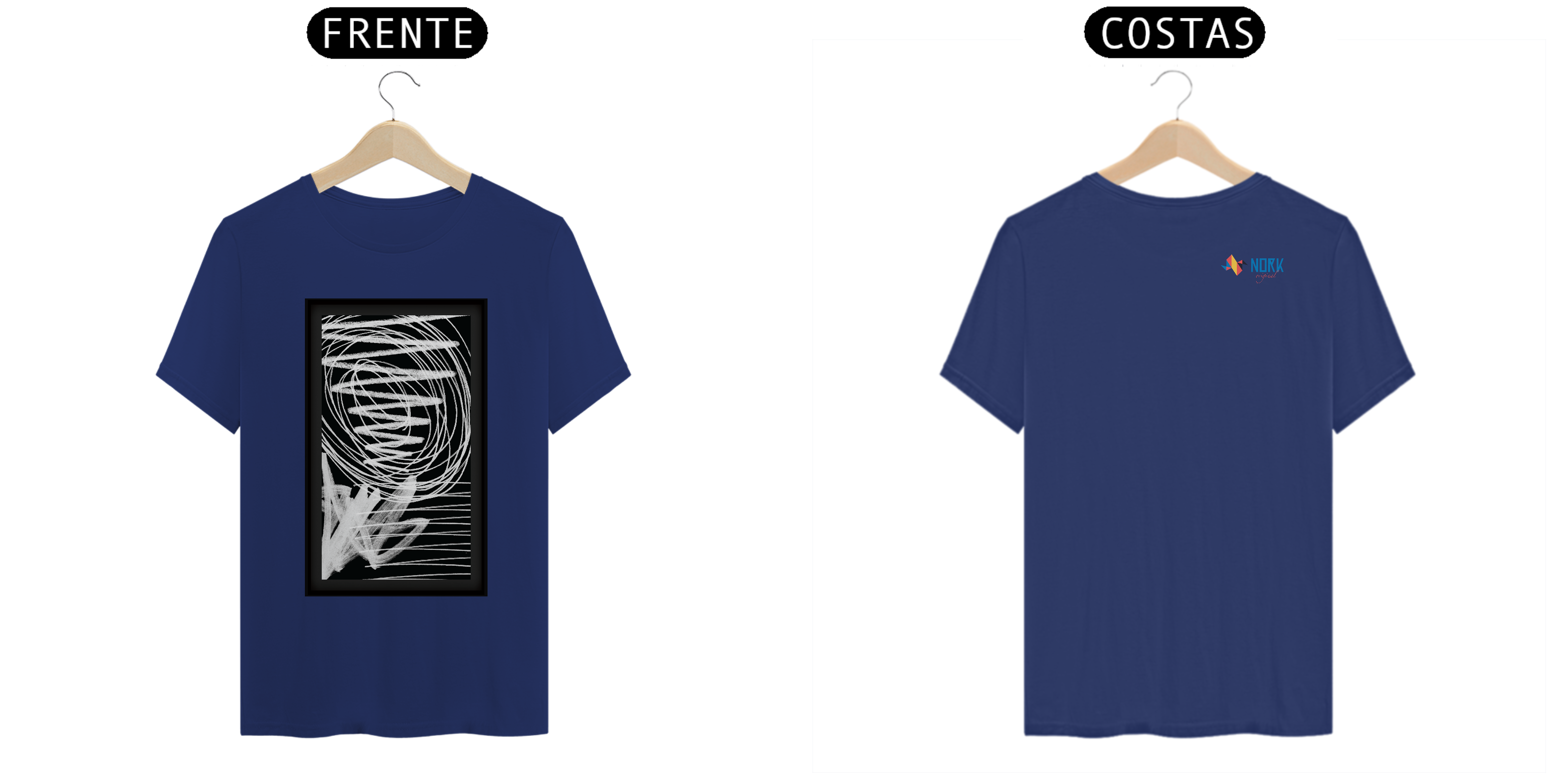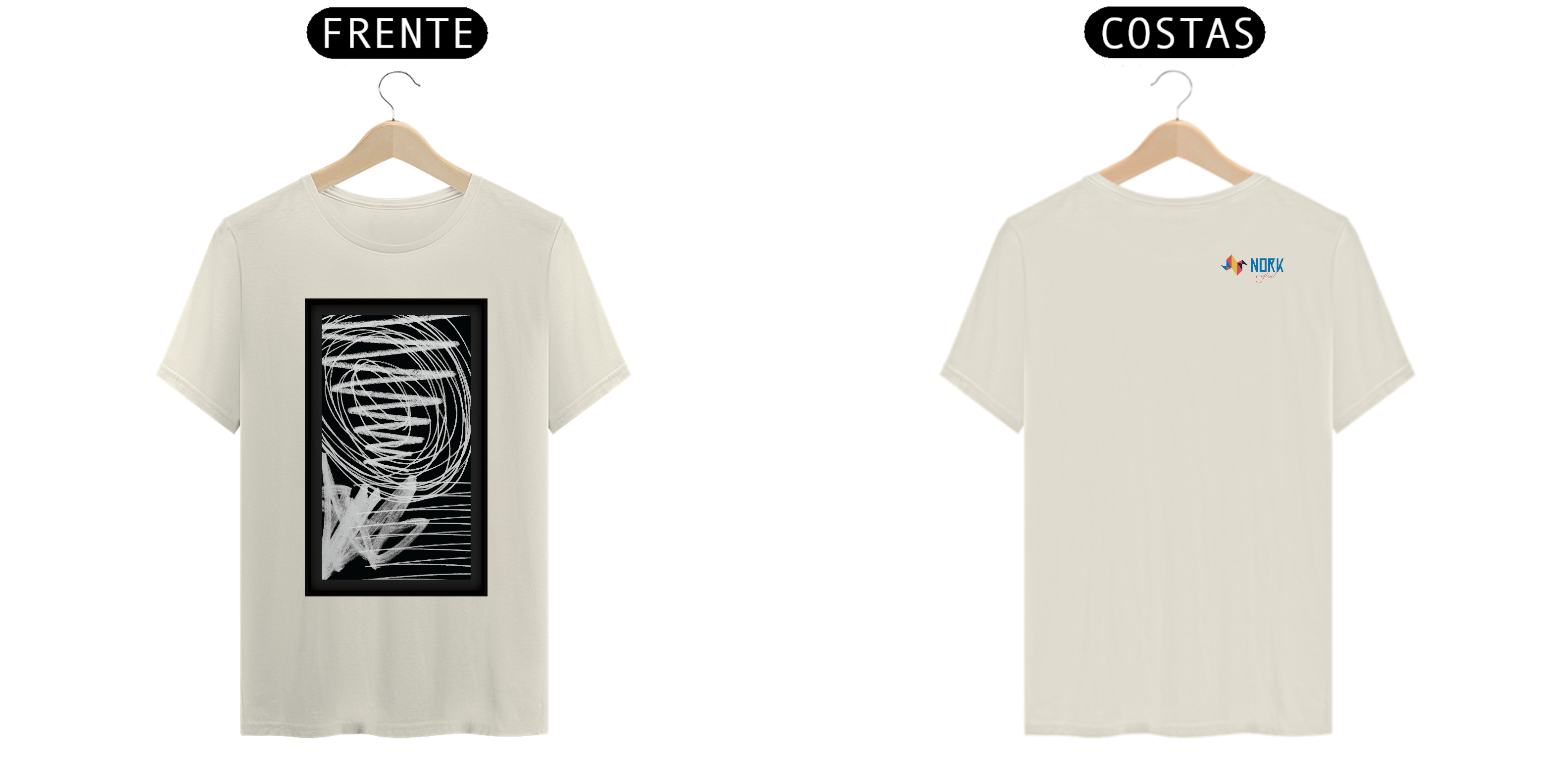 Esta camisa da Coleção Nork Original Terapia apresenta um design abstrato composto por espirais, linhas retas e formas preenchidas em branco sobre um fundo preto. Inspirada na "terapia do rabiscar", a arte transmite uma sensação de movimento e liberdade, refletindo a espontaneidade dos traços feitos à mão.